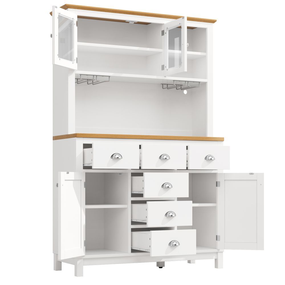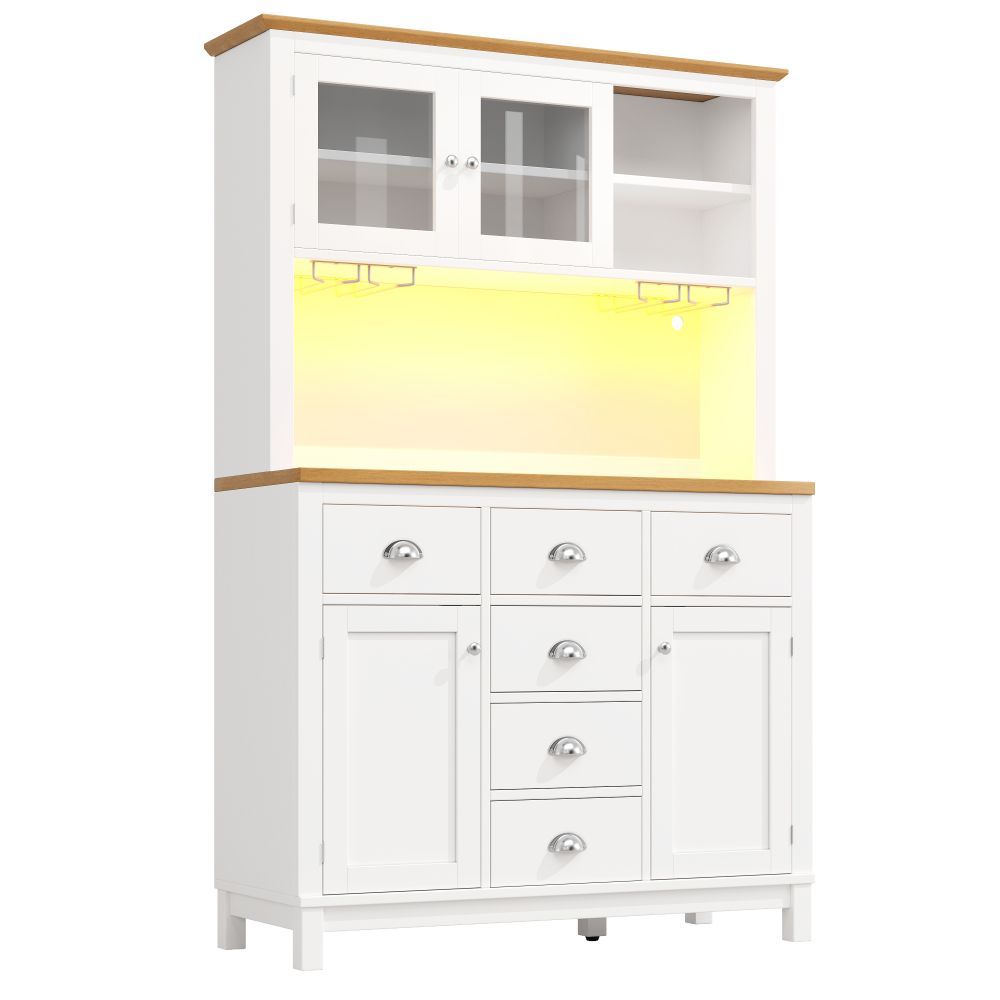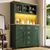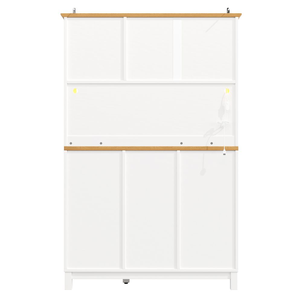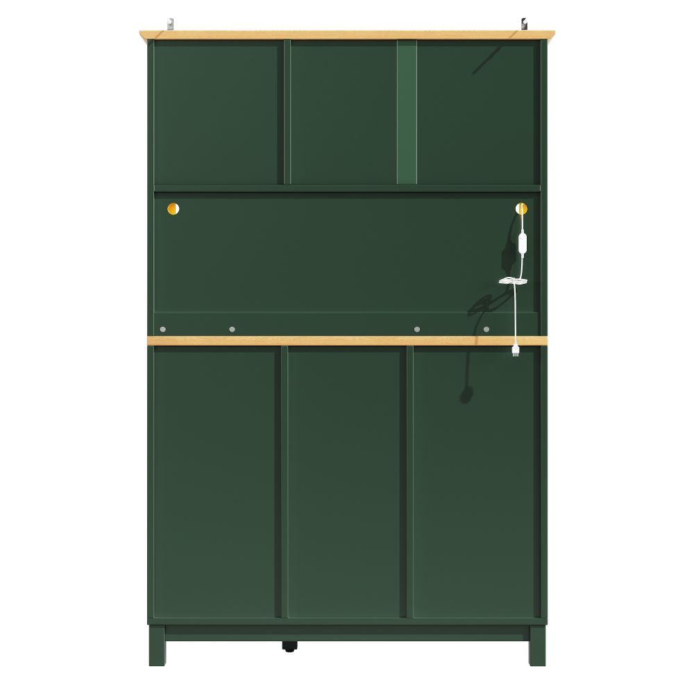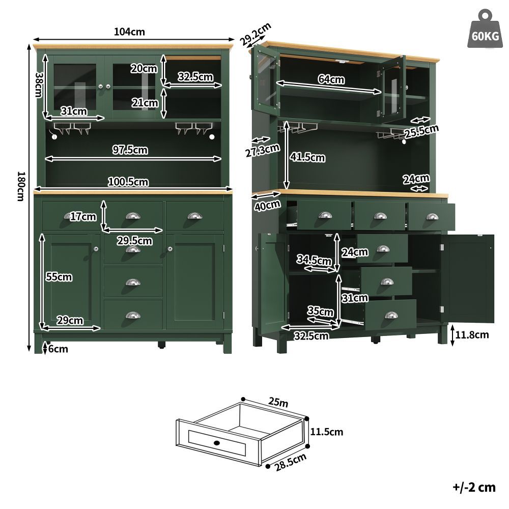 Dieser Aufbewahrungsschrank im Landhausstil vereint praktischen Stauraum mit wohnlichem Charme. Die grün-weiße Gestaltung bringt eine frische, elegante Note in Küche oder Essbereich. Fünf Türen, eine integrierte LED-Lichtleiste und praktische Getränkehalter bieten Platz für Geschirr, Vorräte und Gläser. Die robuste MDF-Ausführung ist pflegeleicht und alltagstauglich.