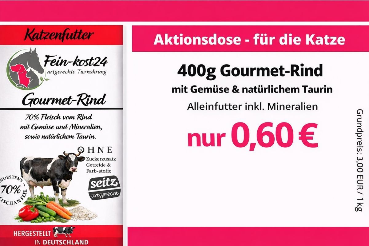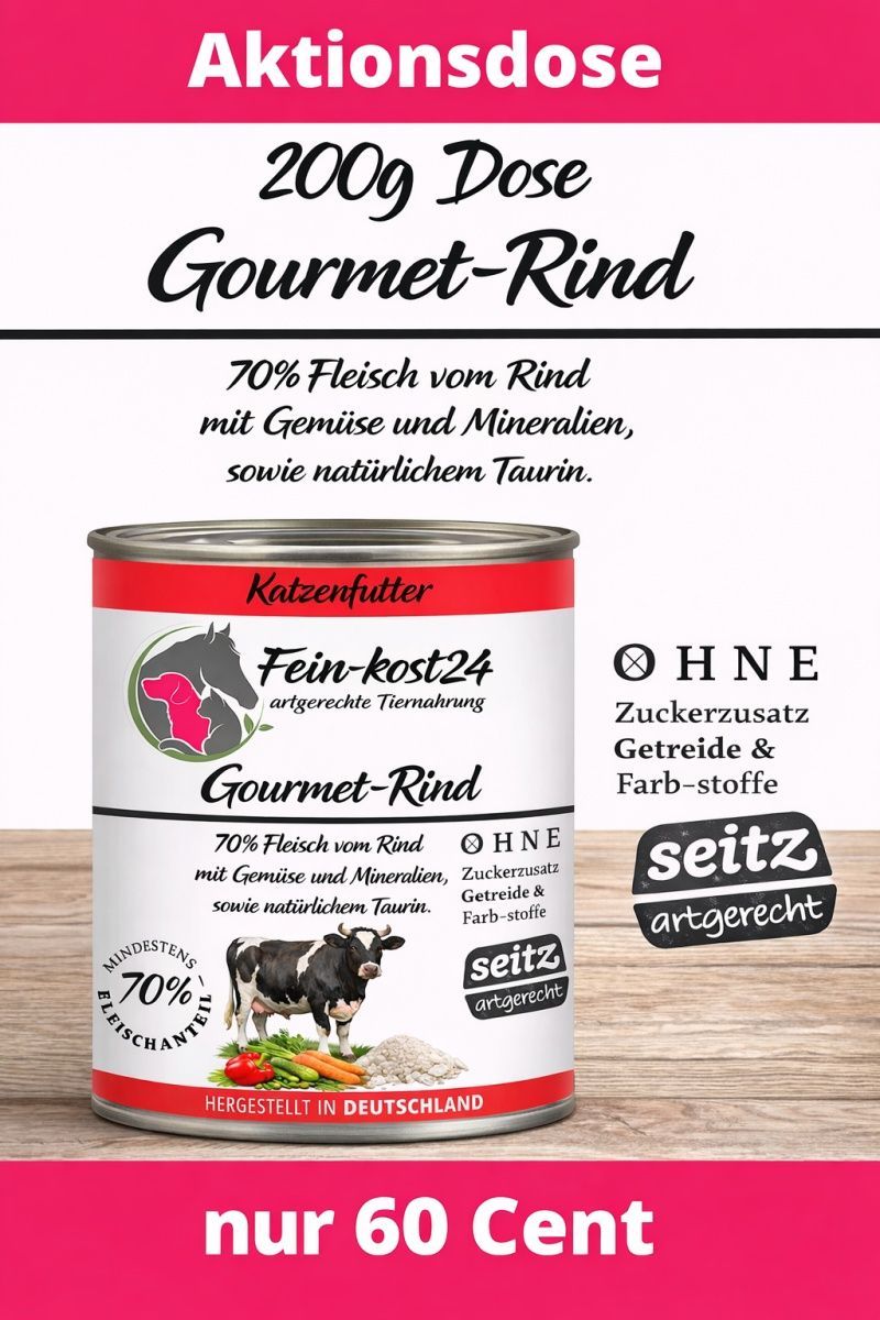 Katzenfutter 200g Gourmet-Rind mit Gemüse SW10292 Aktionsdose ohne Etikett Katzenfutter in der 200g Rind mit Gemüse Rind – Naturnahes Premium-Menü für Katzen (200 g Dose) mit Gemüse Dieses ausgewogene Nassfutter verwöhnt Ihre Katze mit bestem Rind aus artgerechter Haltung – vergleichbar mit Bio-Qual