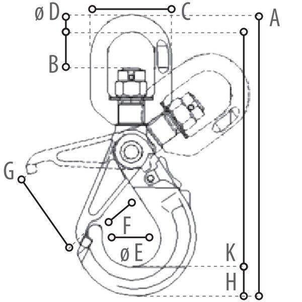 selbstschließender Wirbellasthaken Sicherheits-Wirbellasthaken mit Sicherungsfalle - Güte 10 Sicherheits-Wirbellasthaken mit Öse und Sicherungsfalle für hochfeste Ketten der Güteklasse 10 Nicht unter Last drehbar Datentabelle Nenngröße für Ketten Durchschitt in mm WLL in t A in mm B C DurchschittD D