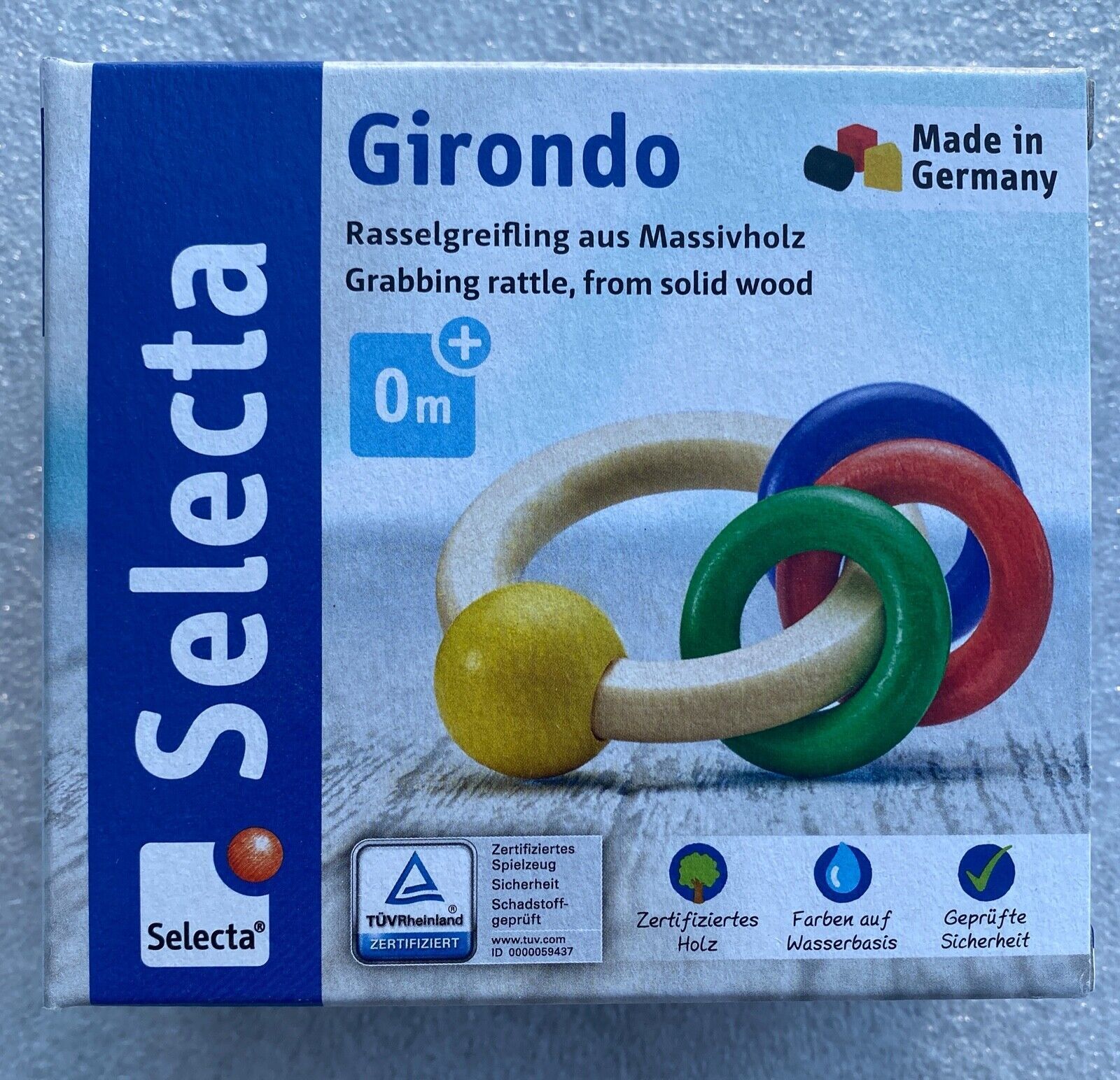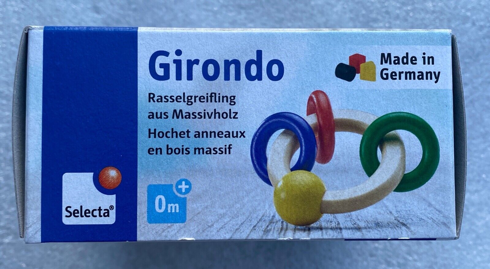 Spieleranzahl: 1 Spieler Altersempfehlung: ab 0 Monaten Girondo - Der bunte Rassel-Greifling Der farbenfrohe Greifling lässt sich durch Tasten, Hören und Sehen erfahren. Seit Generationen ein echter Klassiker. Mit beiden Händen gut greifbare Rassel im klassischen Design. Die Scheiben können einzeln