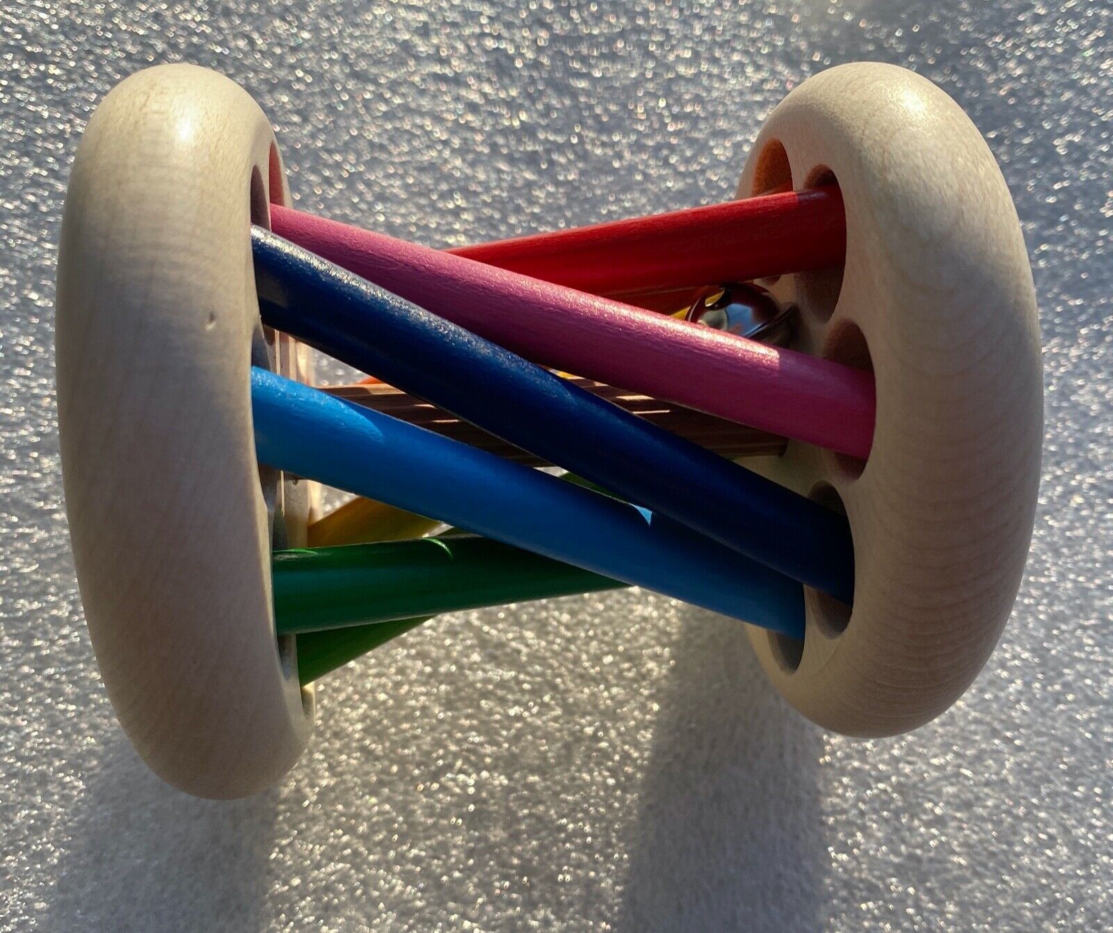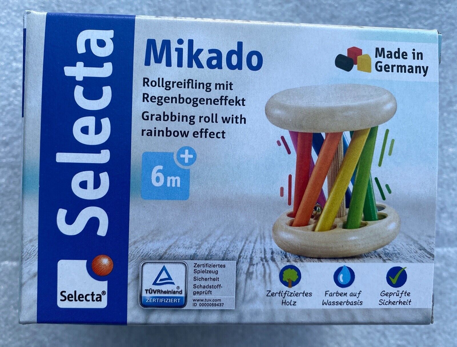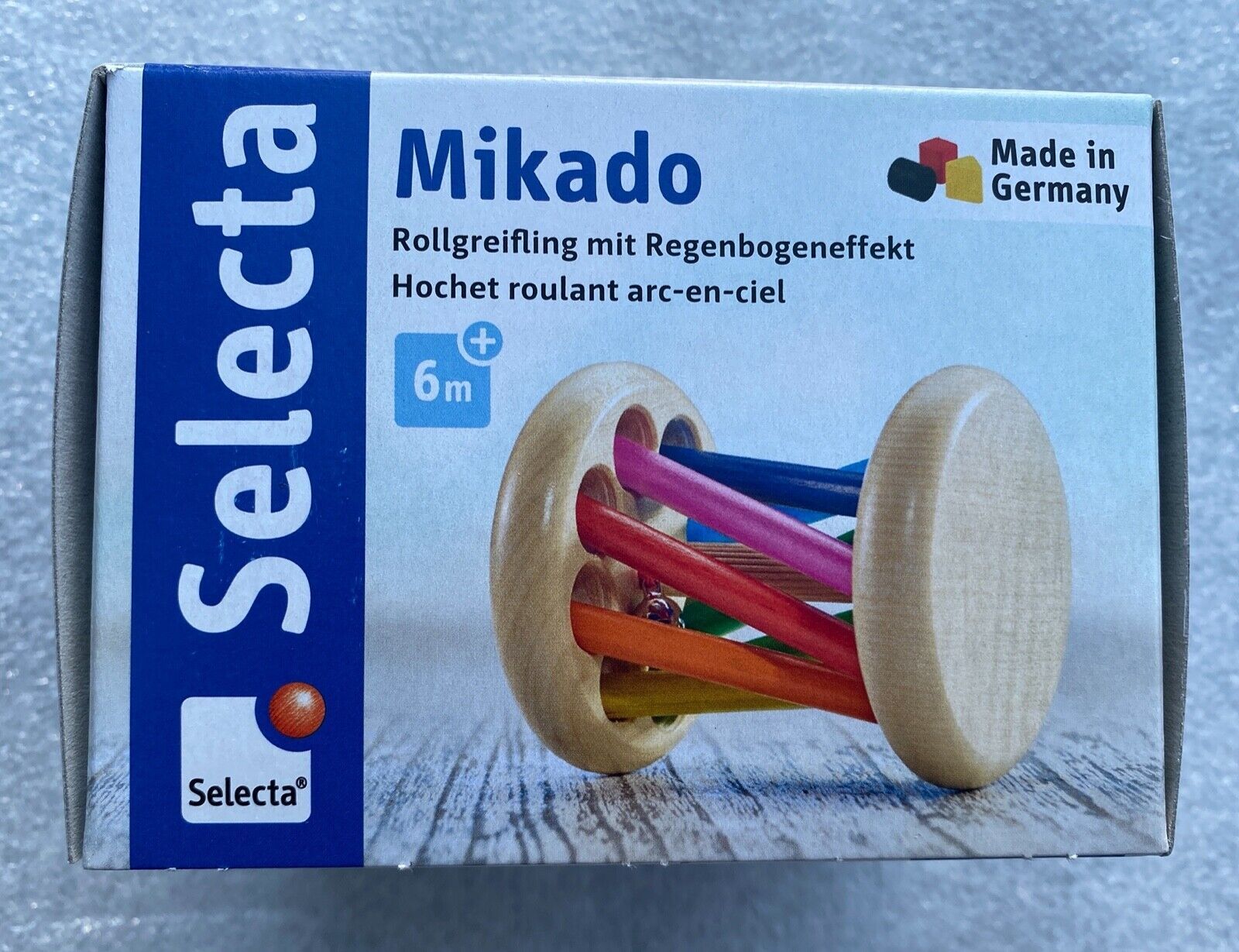 Spieleranzahl: 1 Spieler Altersempfehlung: ab 6 Monaten Mikado - Der kunterbunte Rollgreifling Leicht zu rollender Greifling, der zum Nachkrabbeln, Tasten und Entdecken animiert. Großer Rollgreifling mit beweglichen Schrägstäben und Glöckchen im Inneren. Motiviert zum Nachkrabbeln und Tasten. Das in