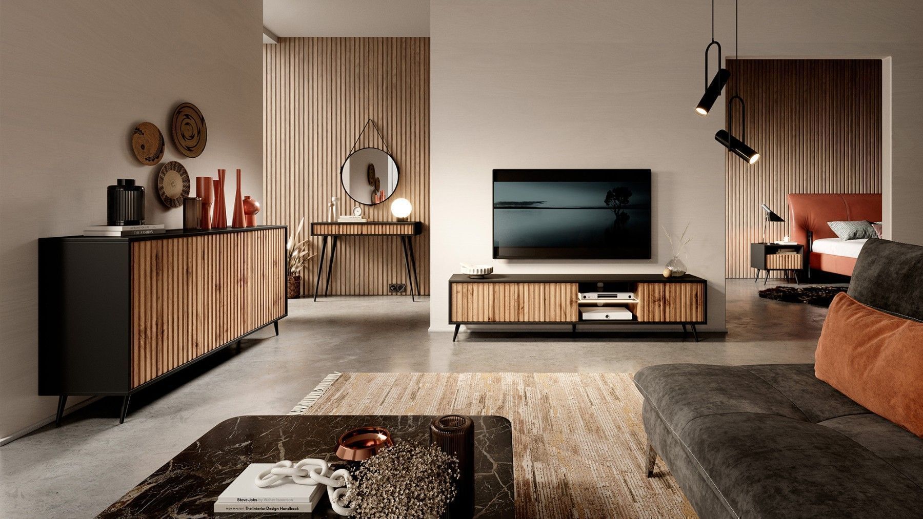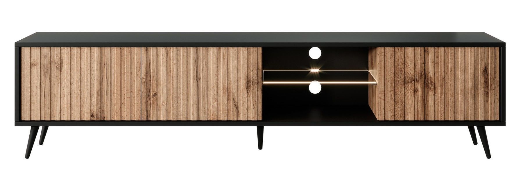 Selsey Bello - TV-Schrank mit Lamellenfronten, Schwarz / Wotan-Eiche mit LED, 175 cm