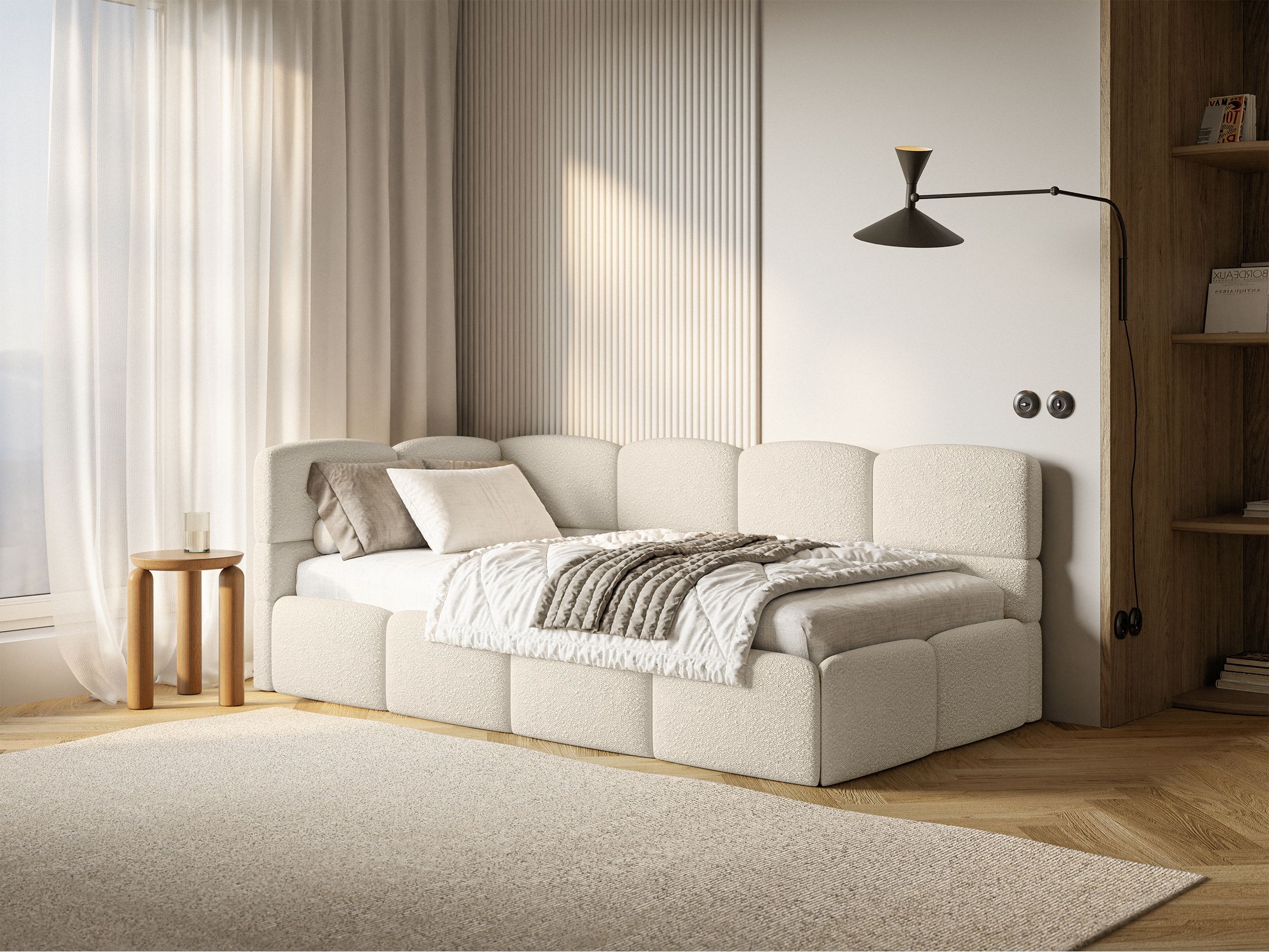 Selsey Cloudy - Jugendbett 120 cm, Bettkasten, Bouclé, Kopfteil links, Hellbeige