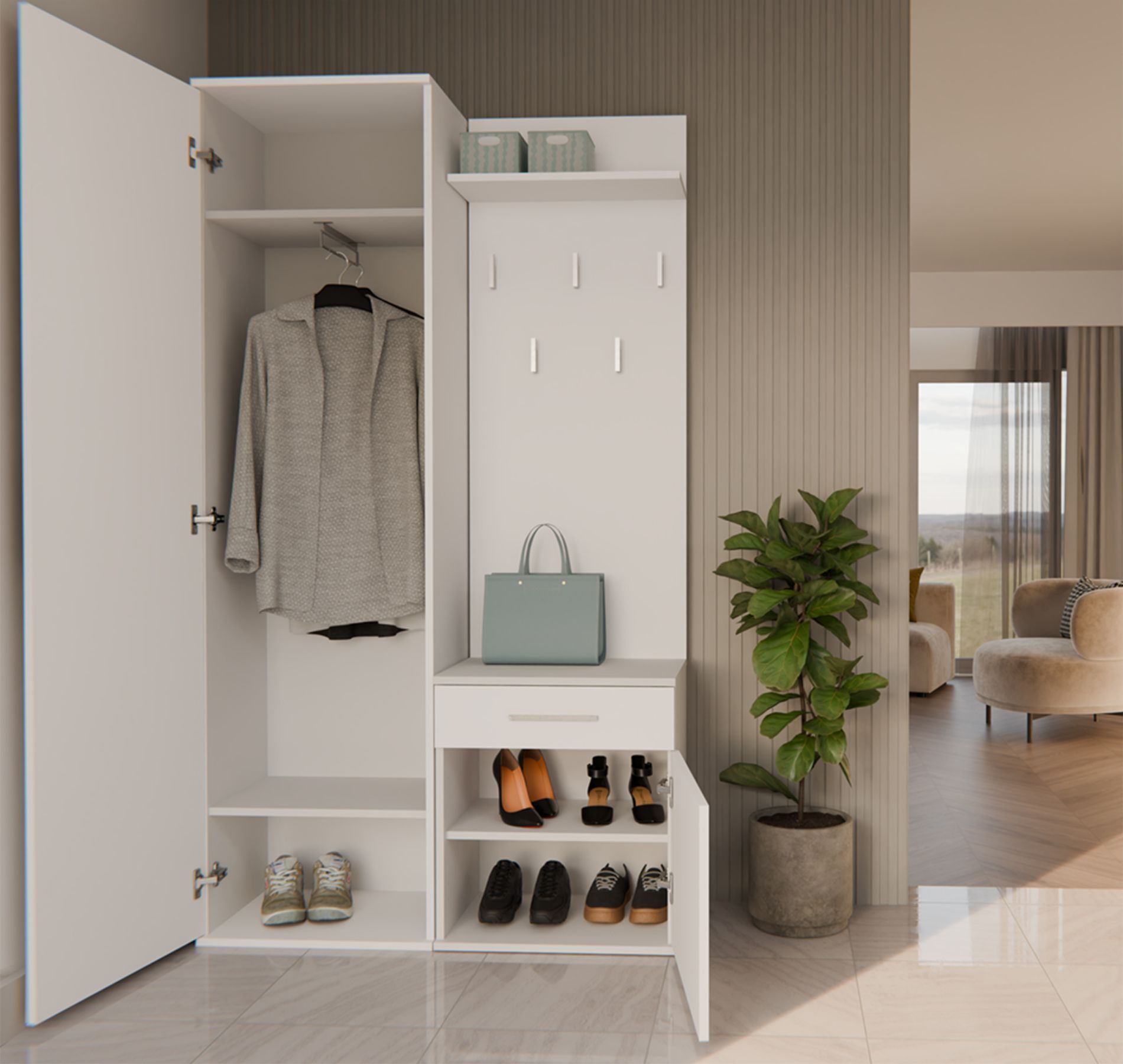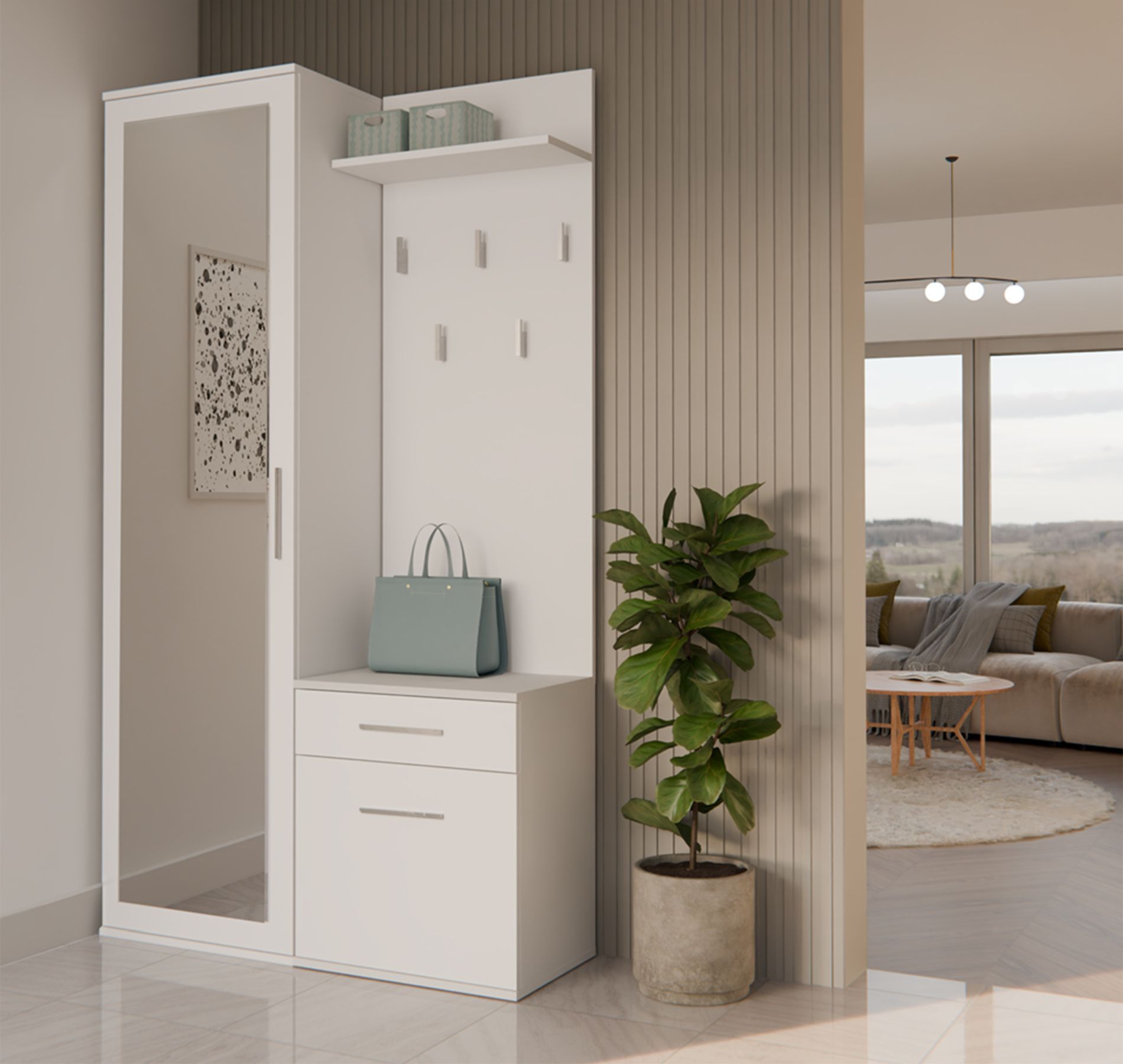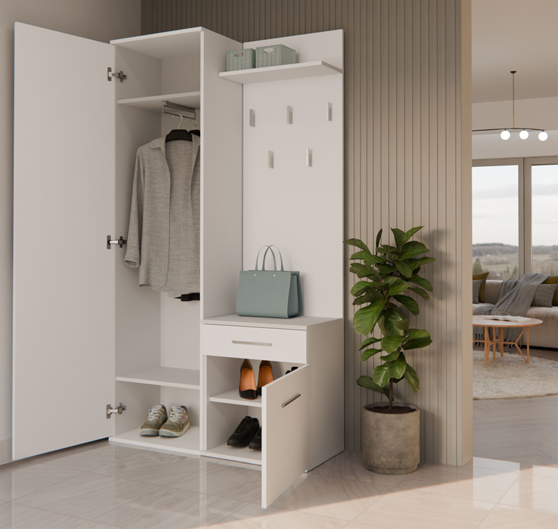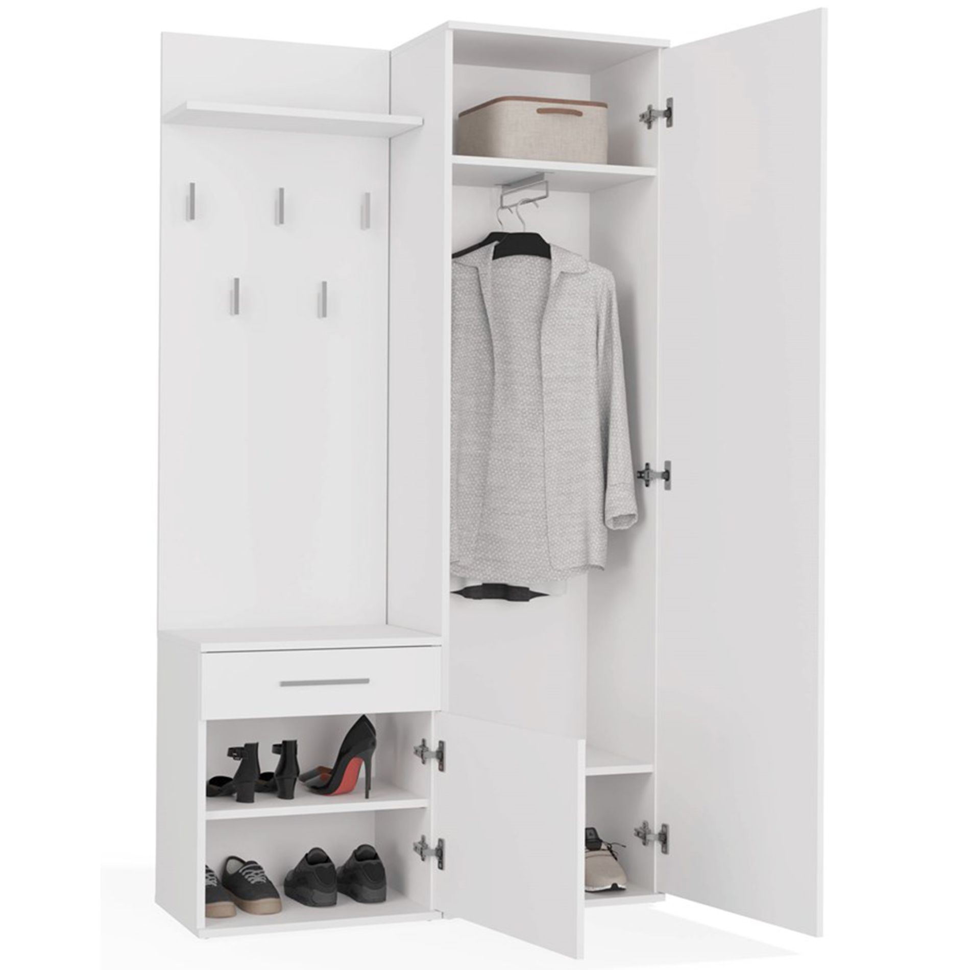 Suchen Sie eine elegante und zugleich funktionale Lösung für Ihren FlurEuro Das Garderobenset Duvio verbindet modernes Design mit durchdachter Funktionalität - ideal für alle, die Wert auf Stil, Komfort und Ordnung im Eingangsbereich legen. Dank seiner kompakten Bauweise eignet sich das Möbelset her