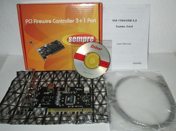 Sempre FP-1F PCI Hersteller: Sempre Modell: FP-!F Chip: Via VT6306 Ports: 3x extern, 1x intern Slot: PCI Treiber: Win 98se, ME auf CD Treiber für andere Betriebssytem im Betriebsystem enthalten Specifikationen: PCI 2.2 PC99 ACPI Transferrate 400 Mbps Funktionstest: - Sonstiges: Auf der beiliegenden