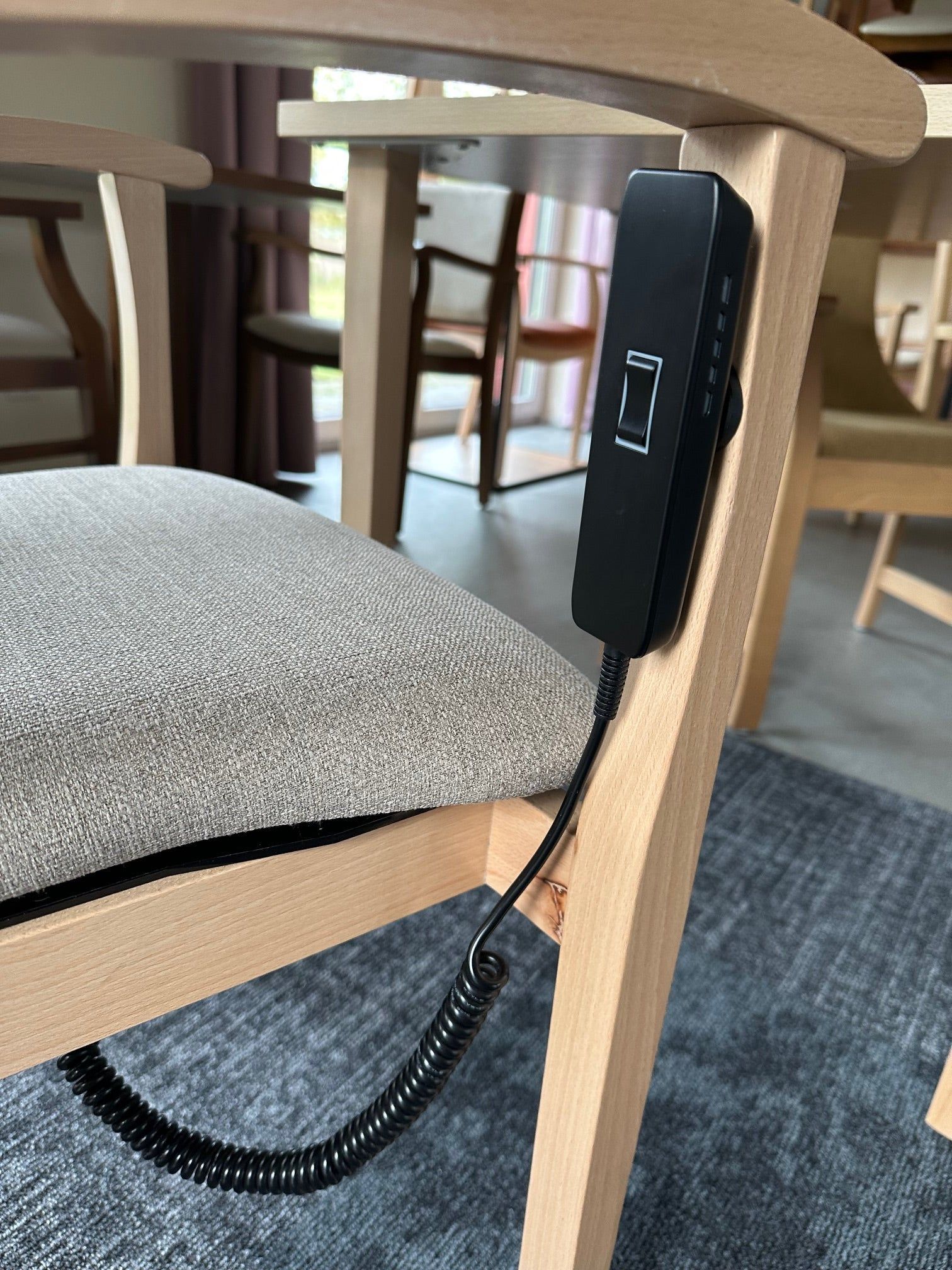 Stuhl Alexander mit Armlehnen – Komfort trifft FunktionalitätDer Alexander Armlehnstuhl ist mehr als nur ein Stuhl – er ist ein durchdachtes Sitzmöbel für maximale Unterstützung und Komfort im Alltag. Mit seinem hochwertigen Massivholzgestell aus Buche, der bequemen Polsterung und der innovativen motorischen Aufstehhilfe vereint er Design, Stabilität und technische Raffinesse.Highlights im Überblick:Massivholzgestell aus Buche: Stabil, langlebig und mit edler Optik – perfekt für den dauerhaften