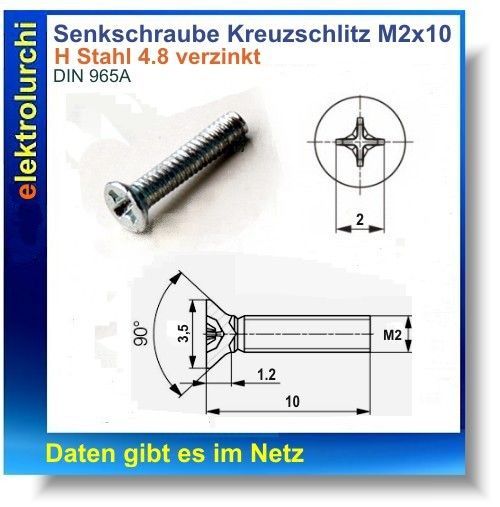 Senkschraube Kreuzschlitz M2 x 10, DIN 965A, Stahl 4,8, verzinkt rostfrei, 25St.