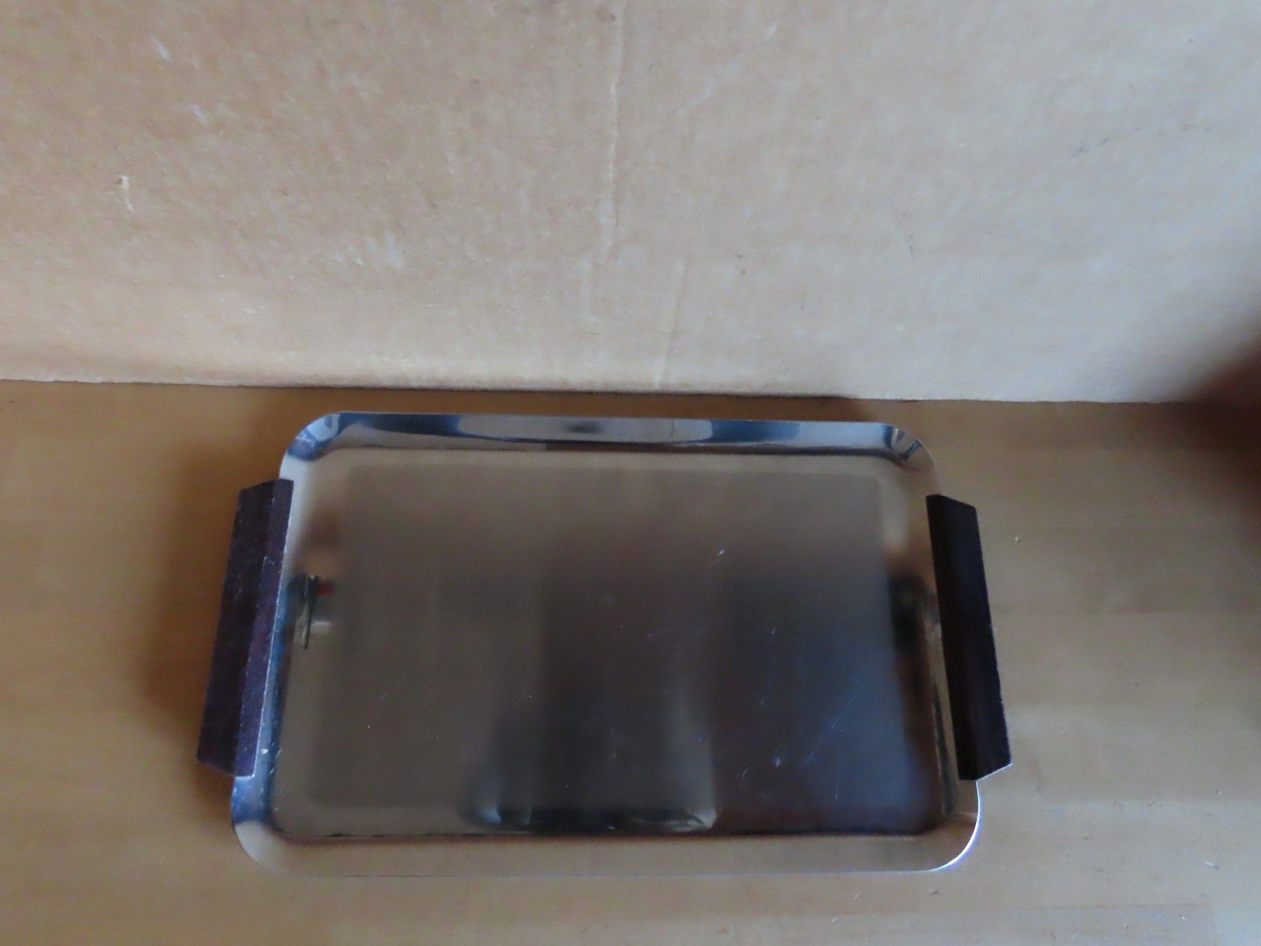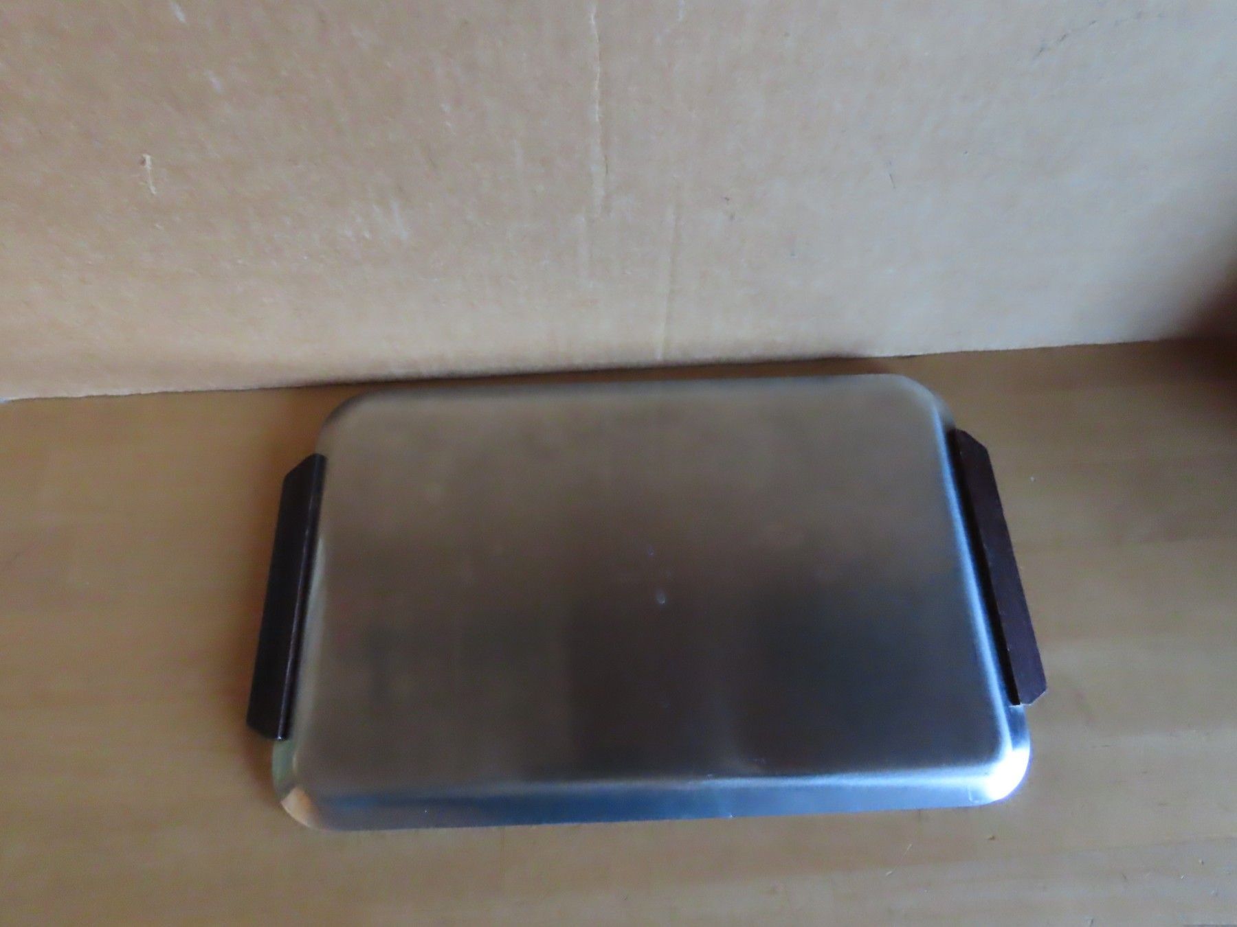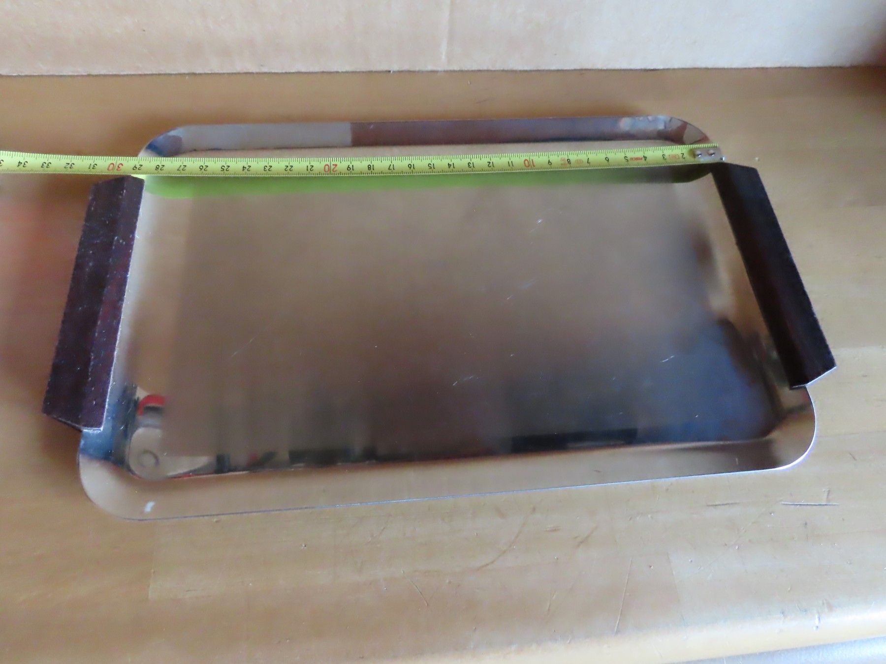 Maße: ca. 1 cm hoch x ca.32 cm x ca. 19 cm - Griffe mit gemessen-------------- Auflagefläche ca. 26 cm x ca.16 cm Material: Metall NICHT magnetisch 18 8 ist verschmutzt verstaubt, hat Kratzer