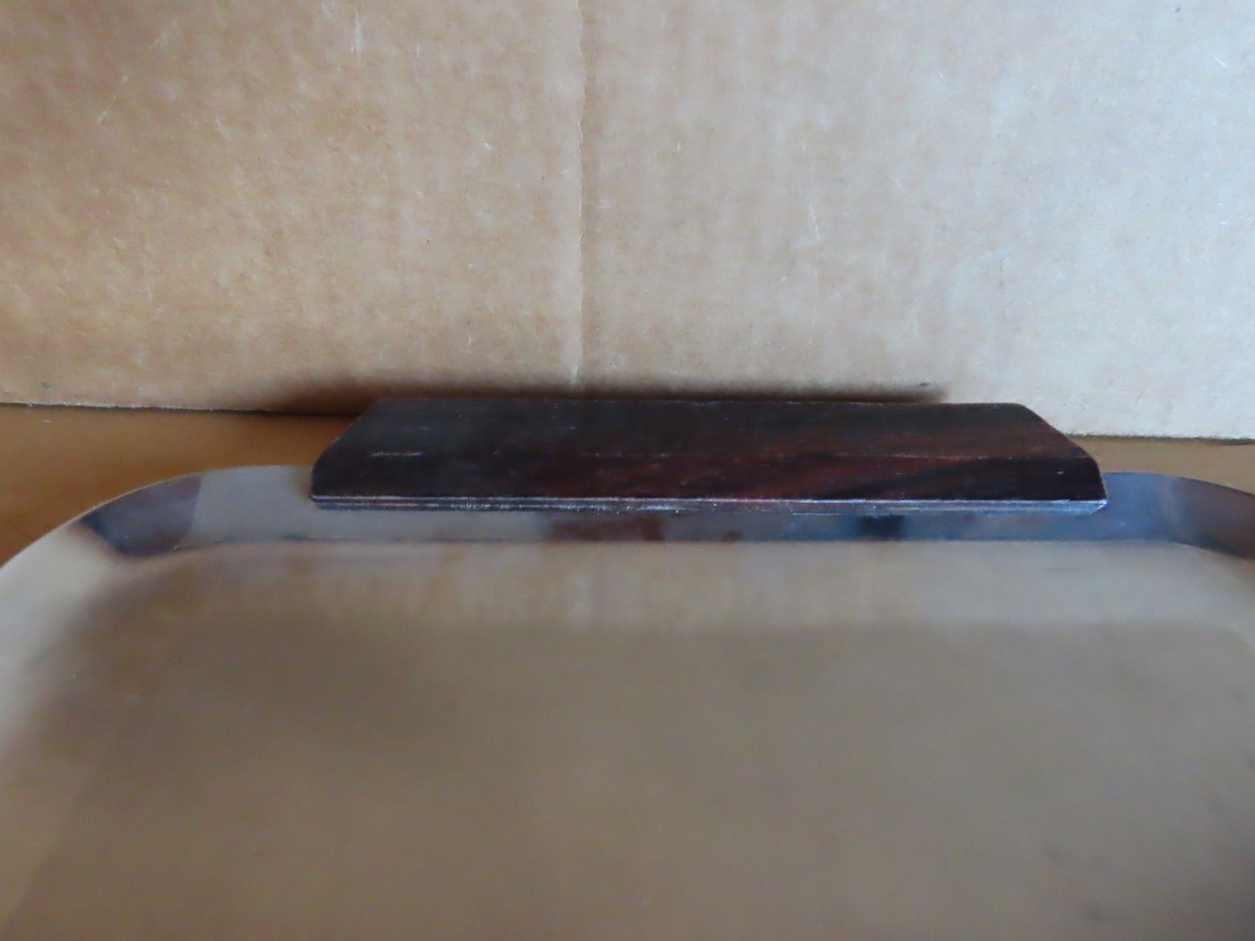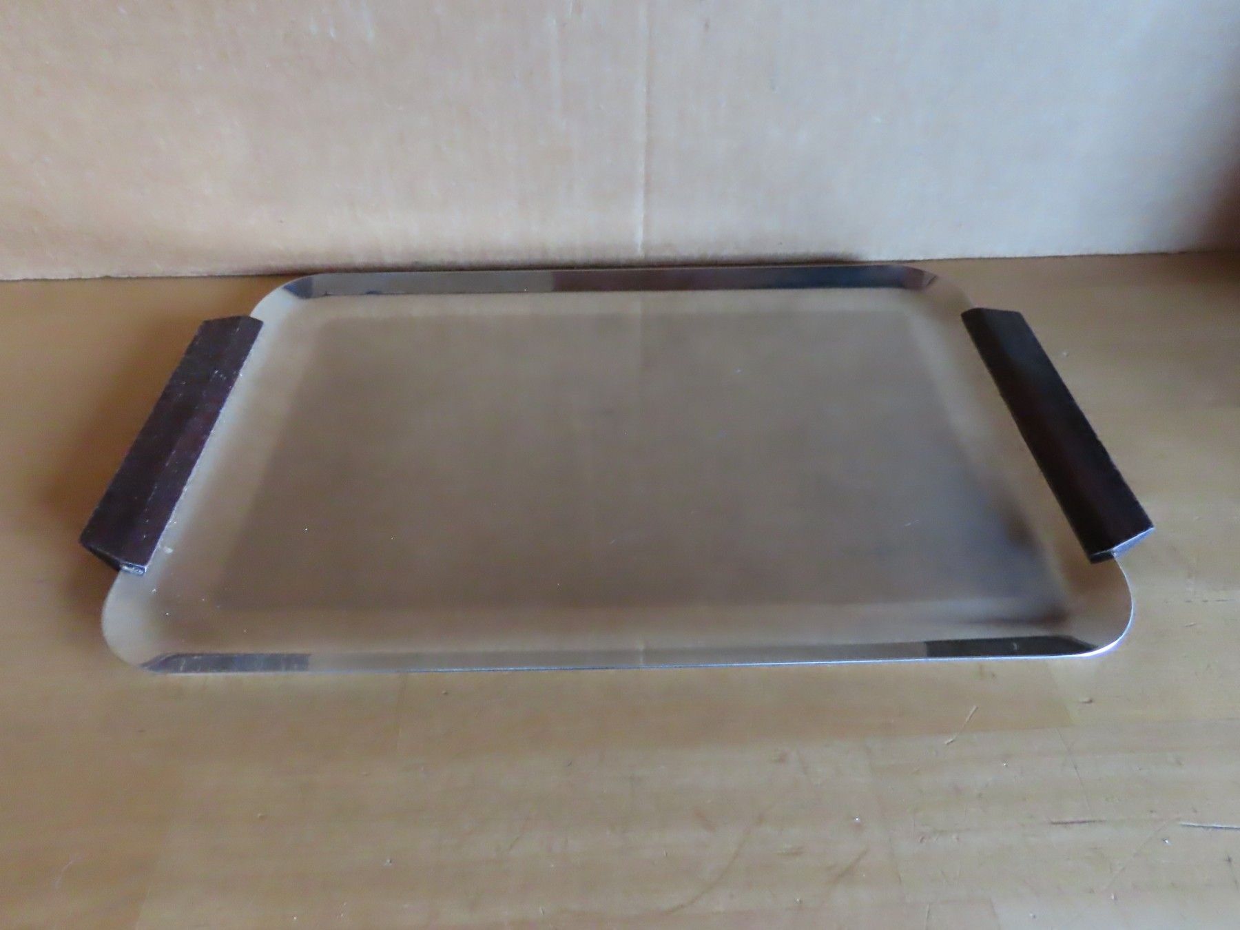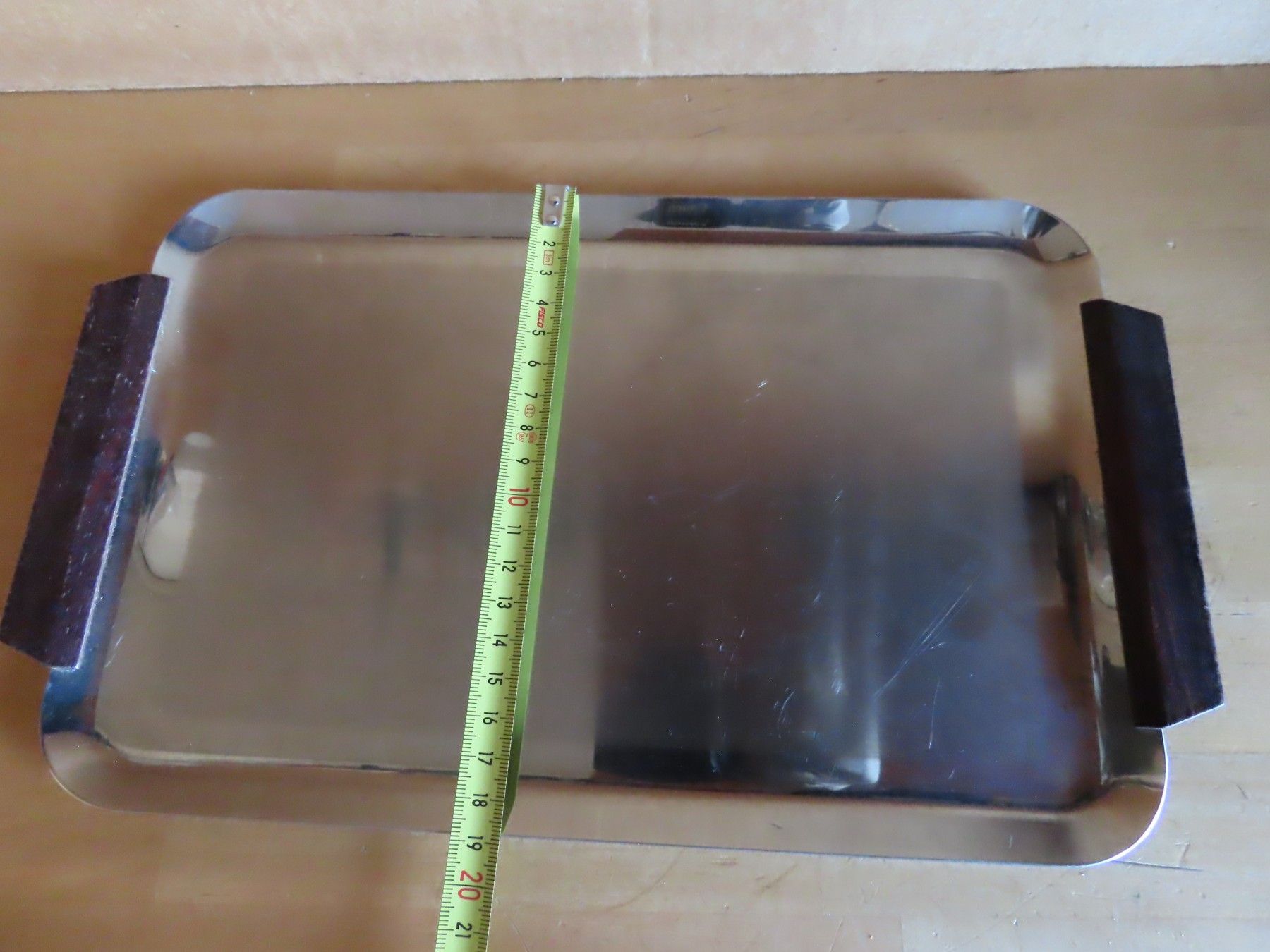 Maße: ca. 1 cm hoch x ca.32 cm x ca. 19 cm - Griffe mit gemessen-------------- Auflagefläche ca. 26 cm x ca.16 cm Material: Metall NICHT magnetisch 18 8 ist verschmutzt verstaubt, hat Kratzer