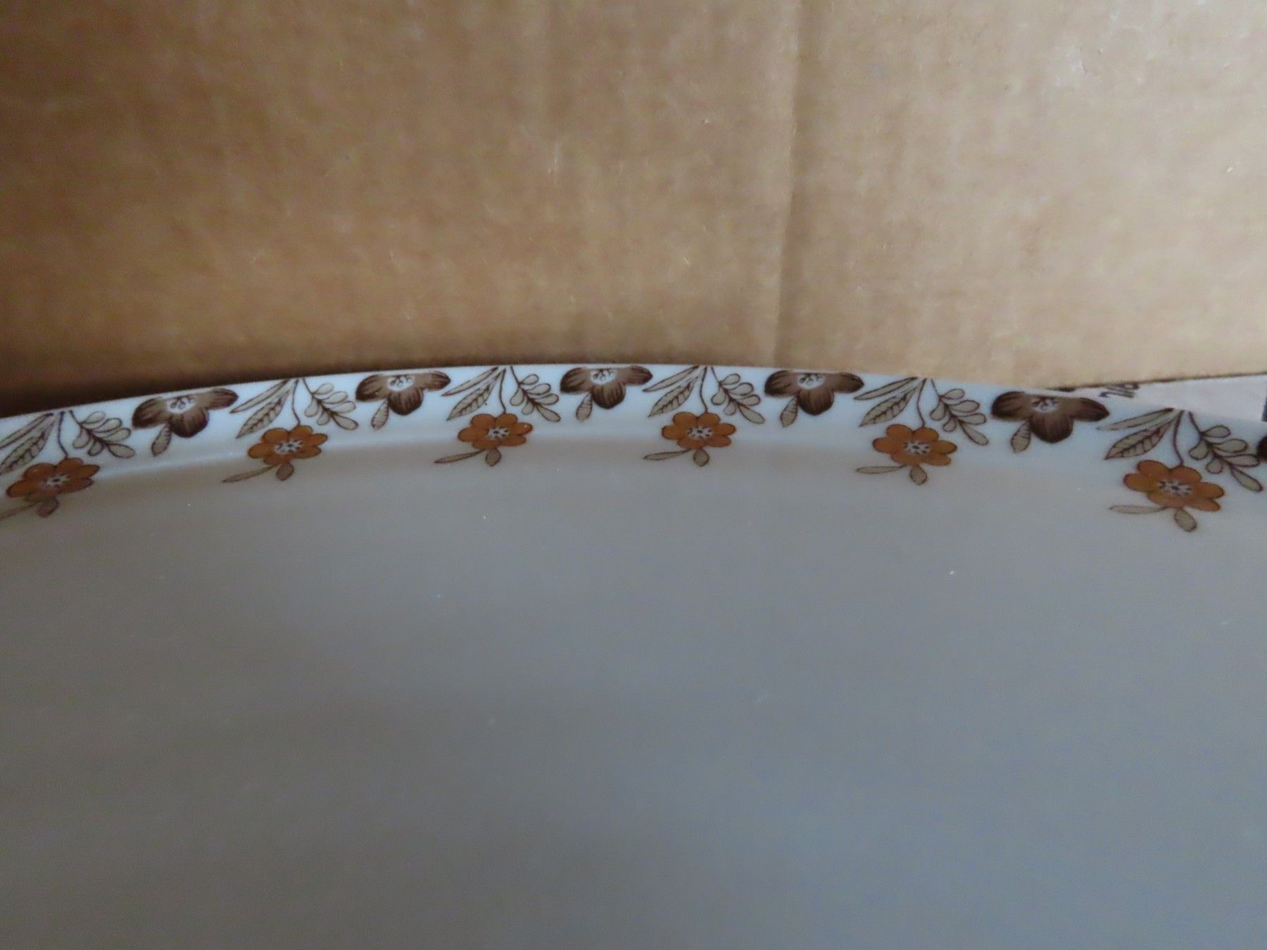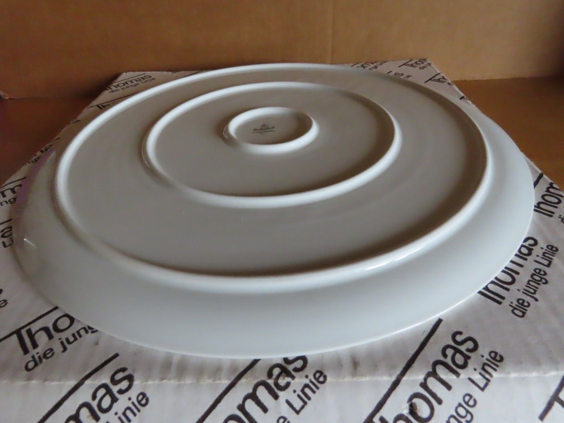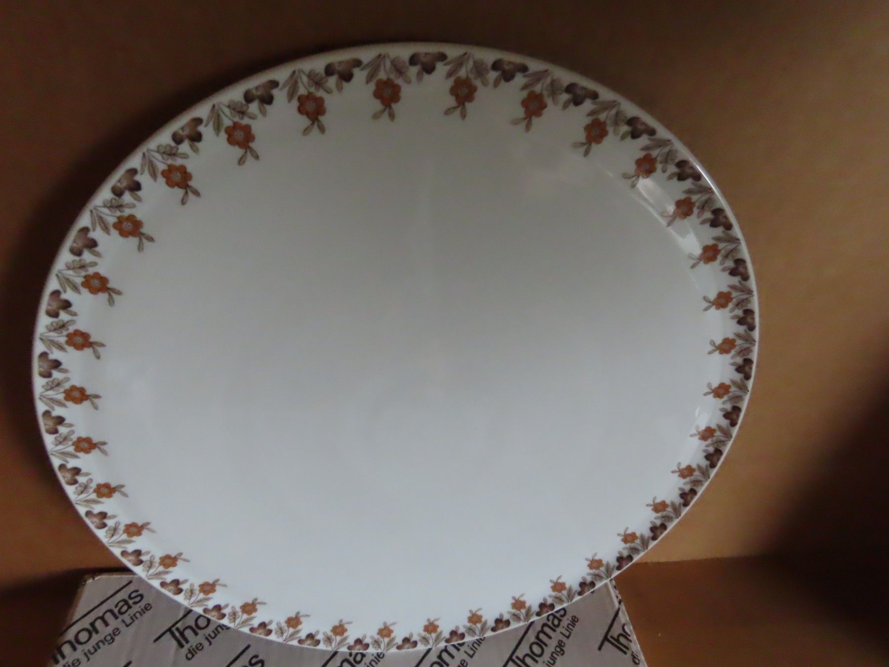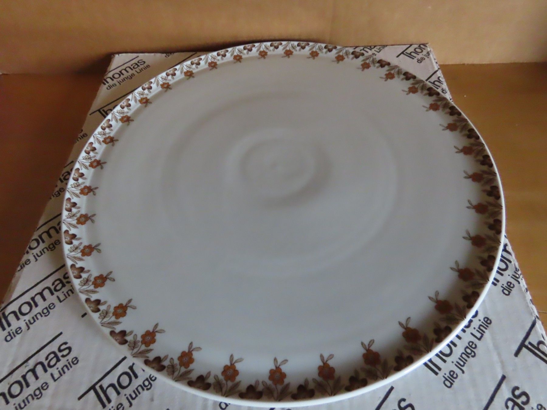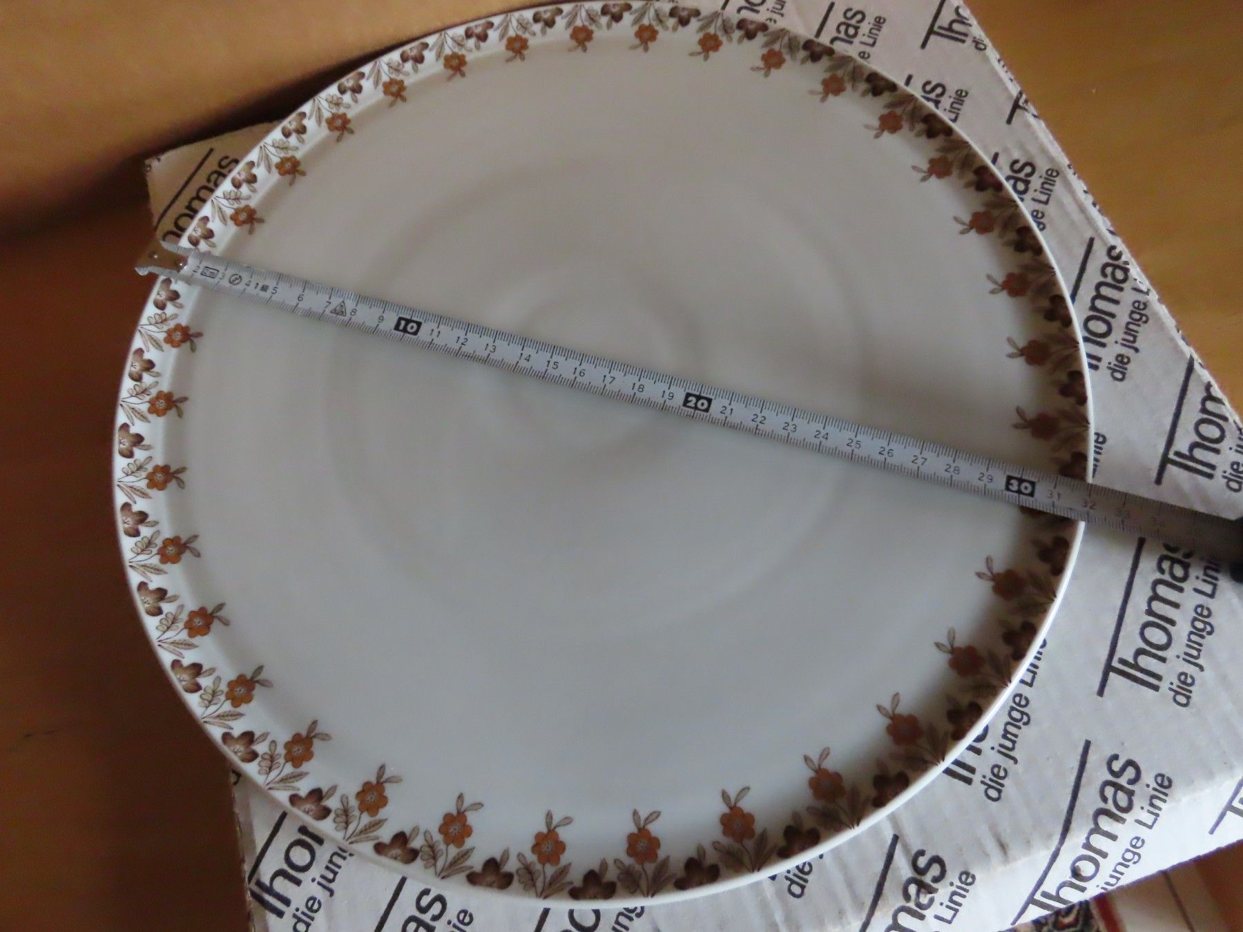 Maße: ca. 32 cm Durchmesser x 2 hoch --immer die breiteste Stelle gemessen Material: Porzellan ist leicht verschmutzt ob der Karton die ursprüngliche Verpackung ist kann ich nicht angeben... Mehr