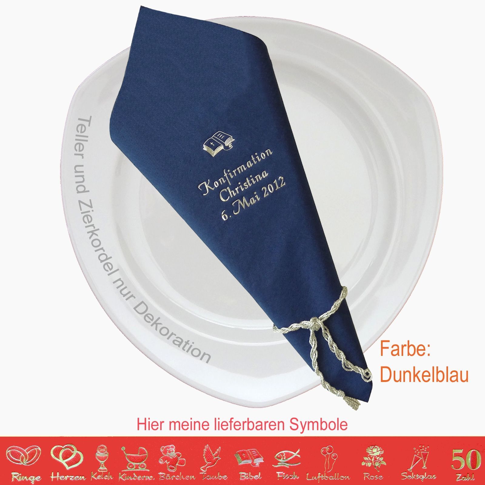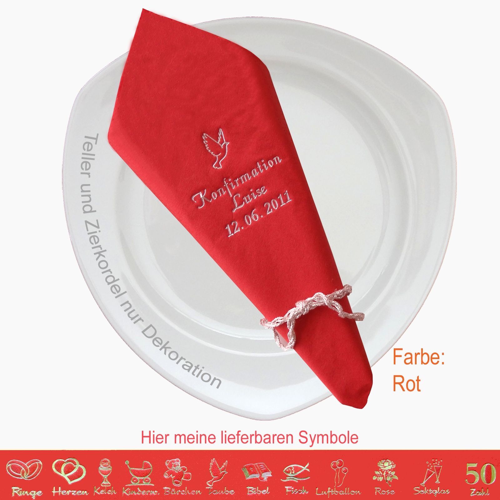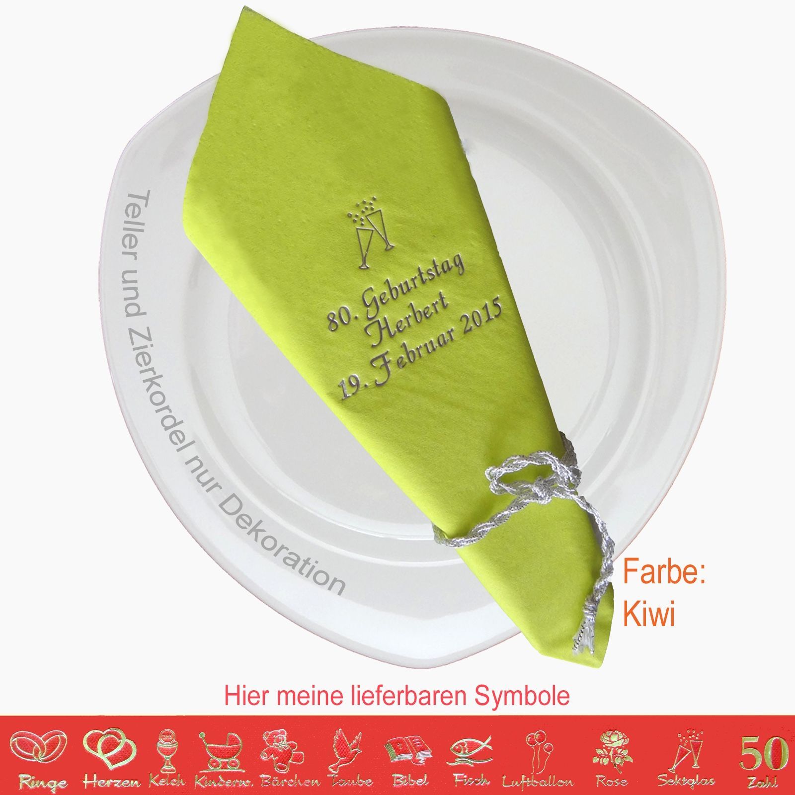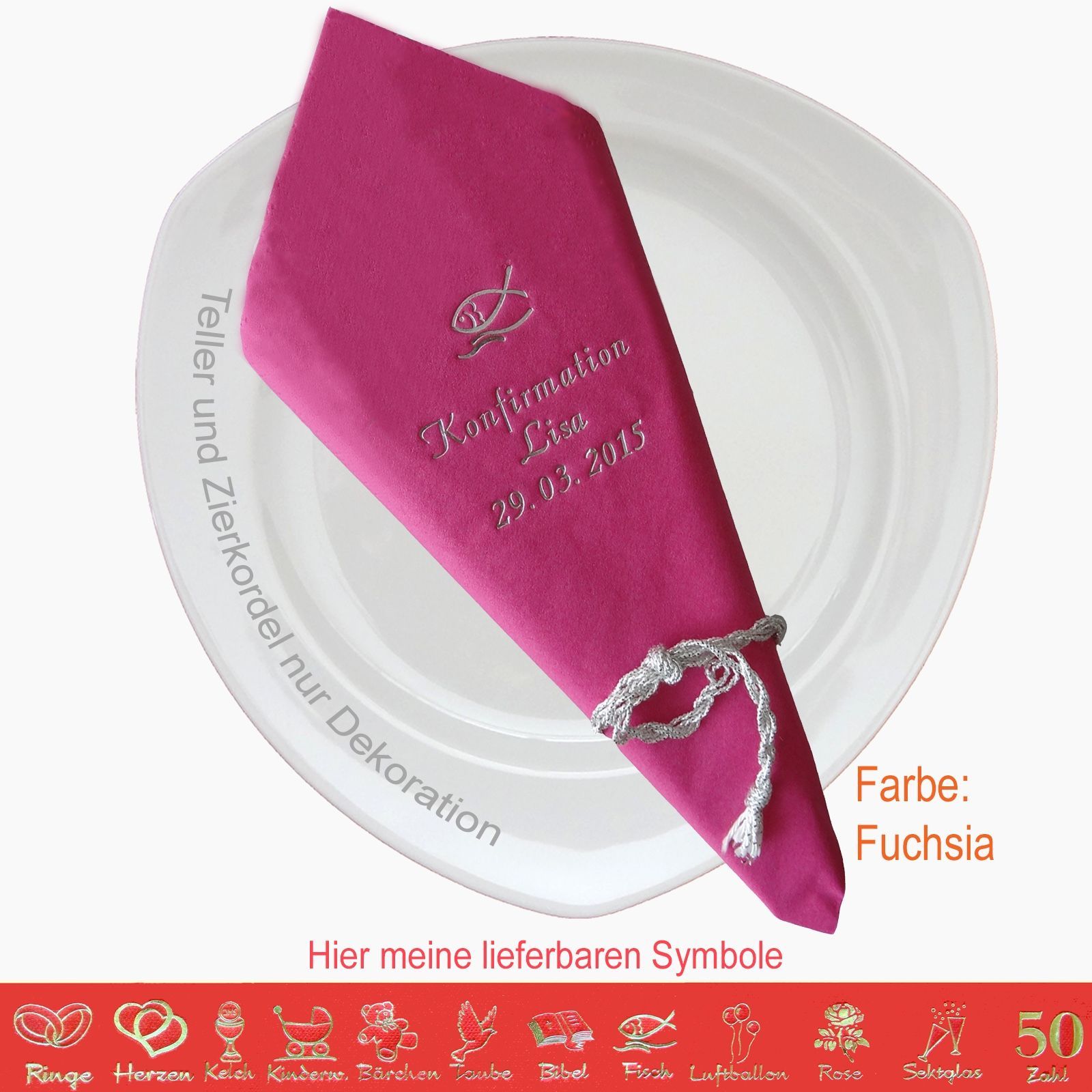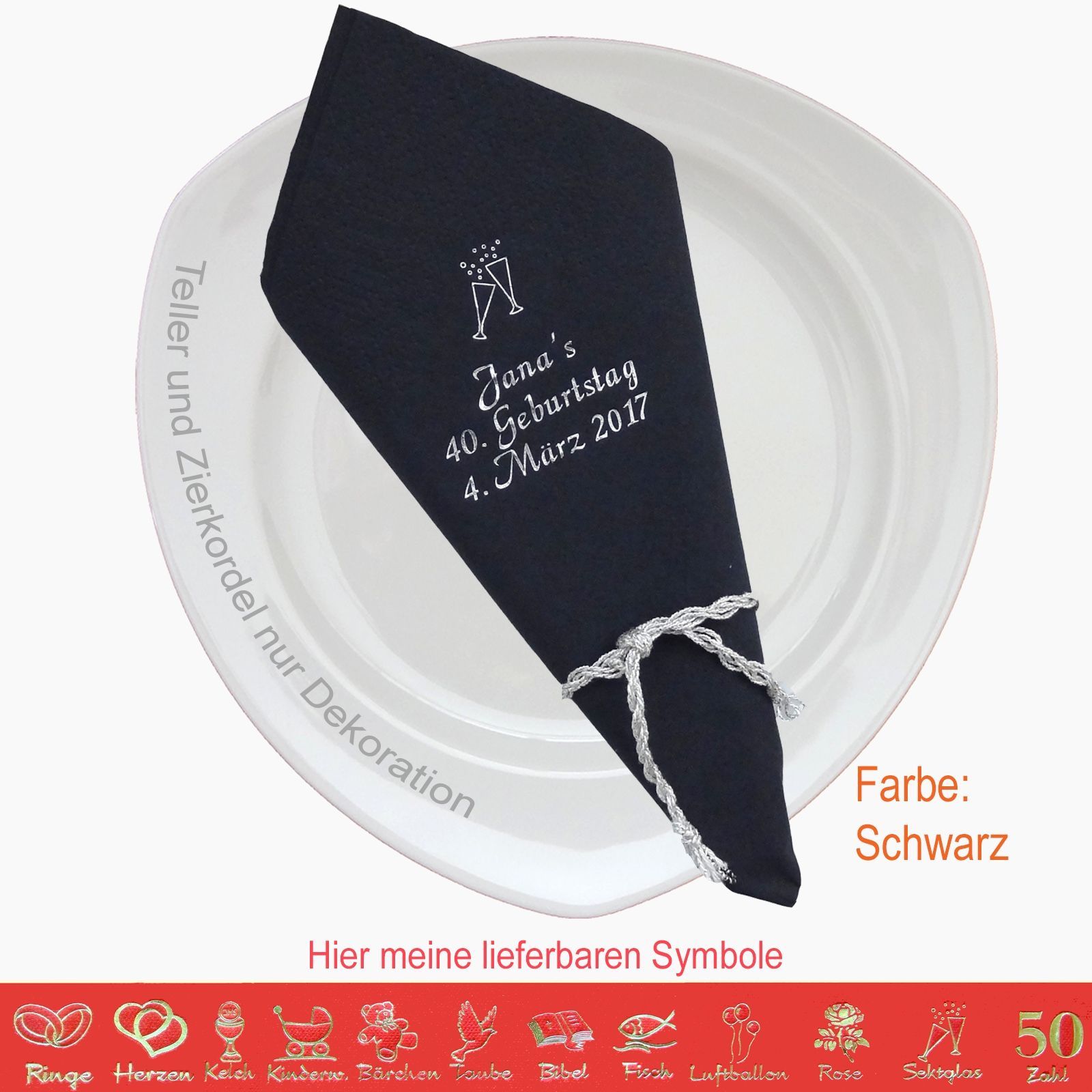 20 MIT NAMEN BEDRUCKTE PREMIUM-SERVIETTEN Elegante dekorative Stoffoptik zum festlichen Mittags-/Abendgedeck Schriftfarbe SILBER, KUPFER, GOLD oder SCHWARZ, WEISS, BLAU, GRÜN, ROT, ROSA Bitte Ihre Angaben zur Personalisierung nach dem Kauf mitteilen. - welche Feier - Datum der Feier - gewünschter Namen - welches Symbol - welche Schriftfarbe