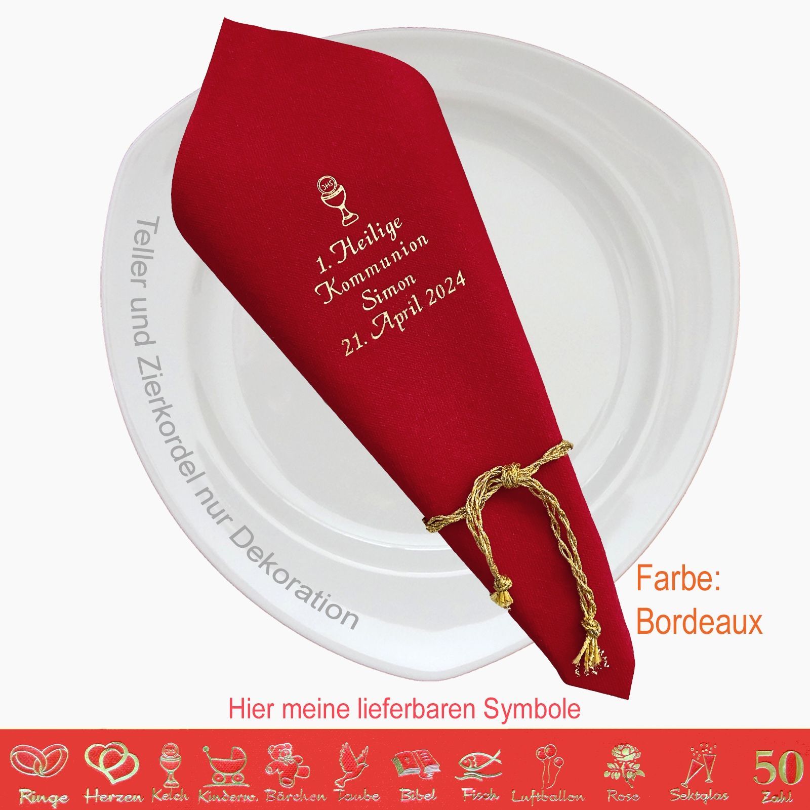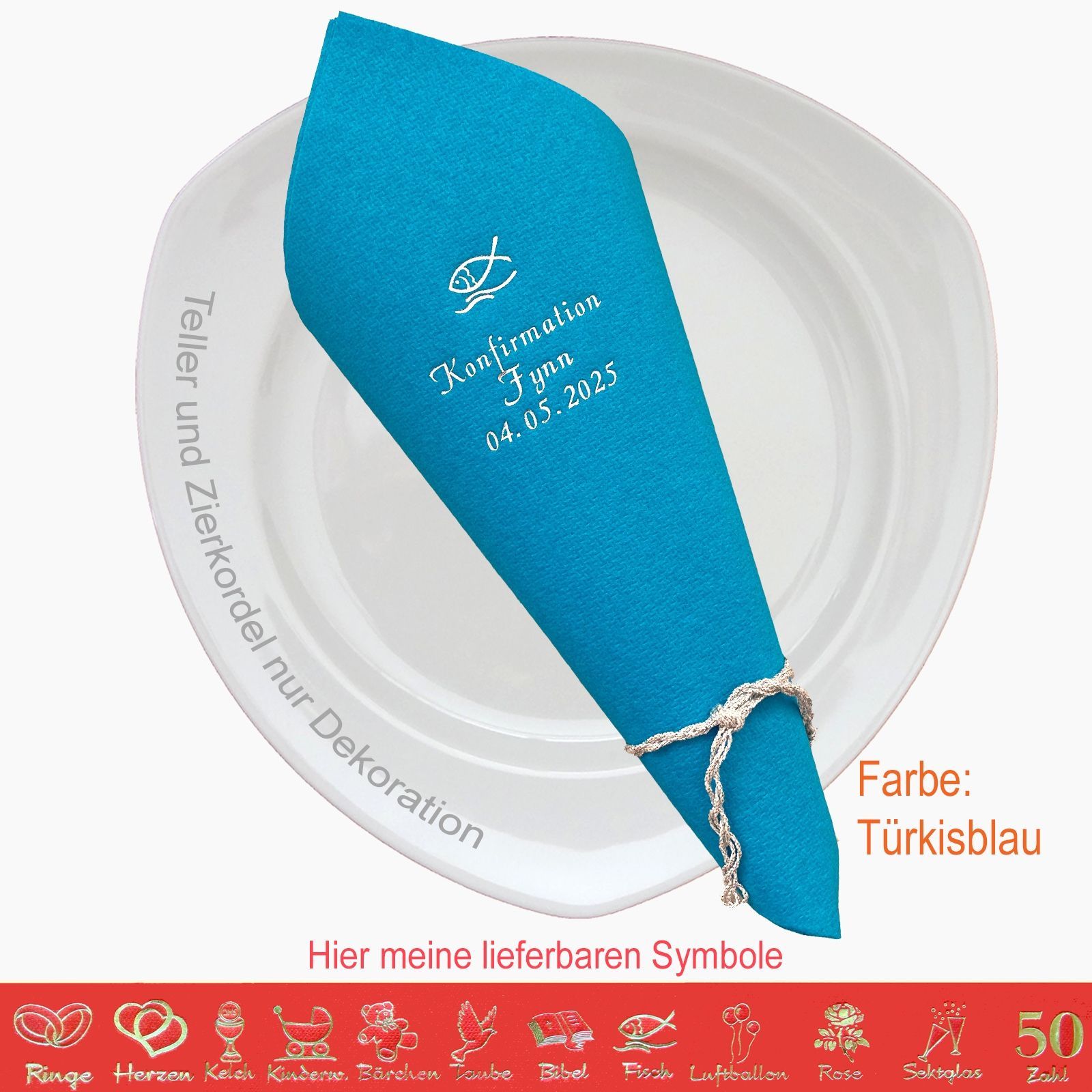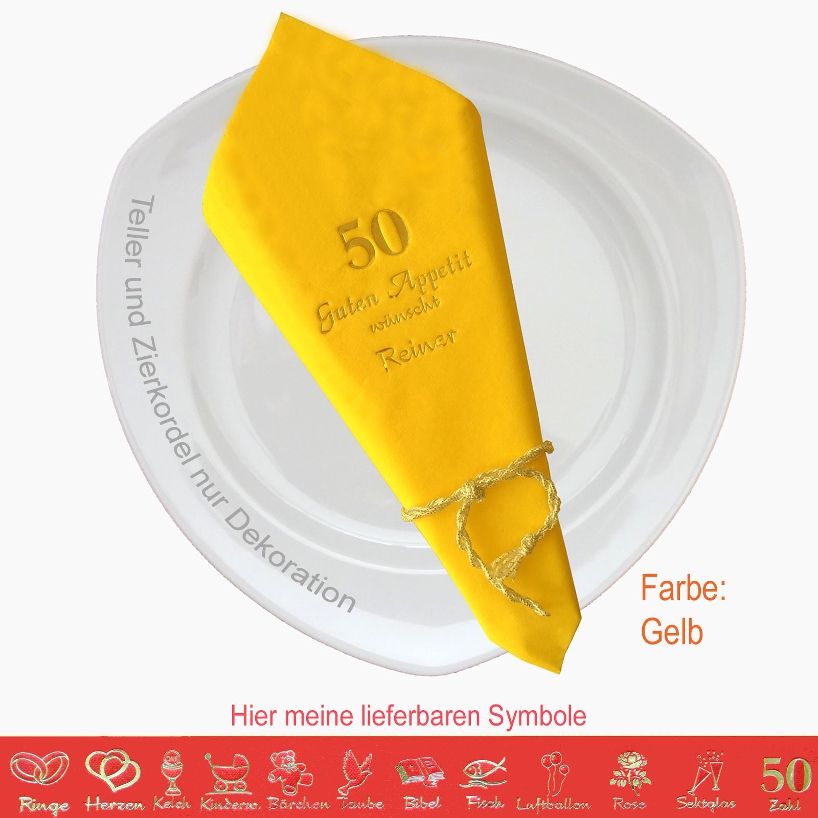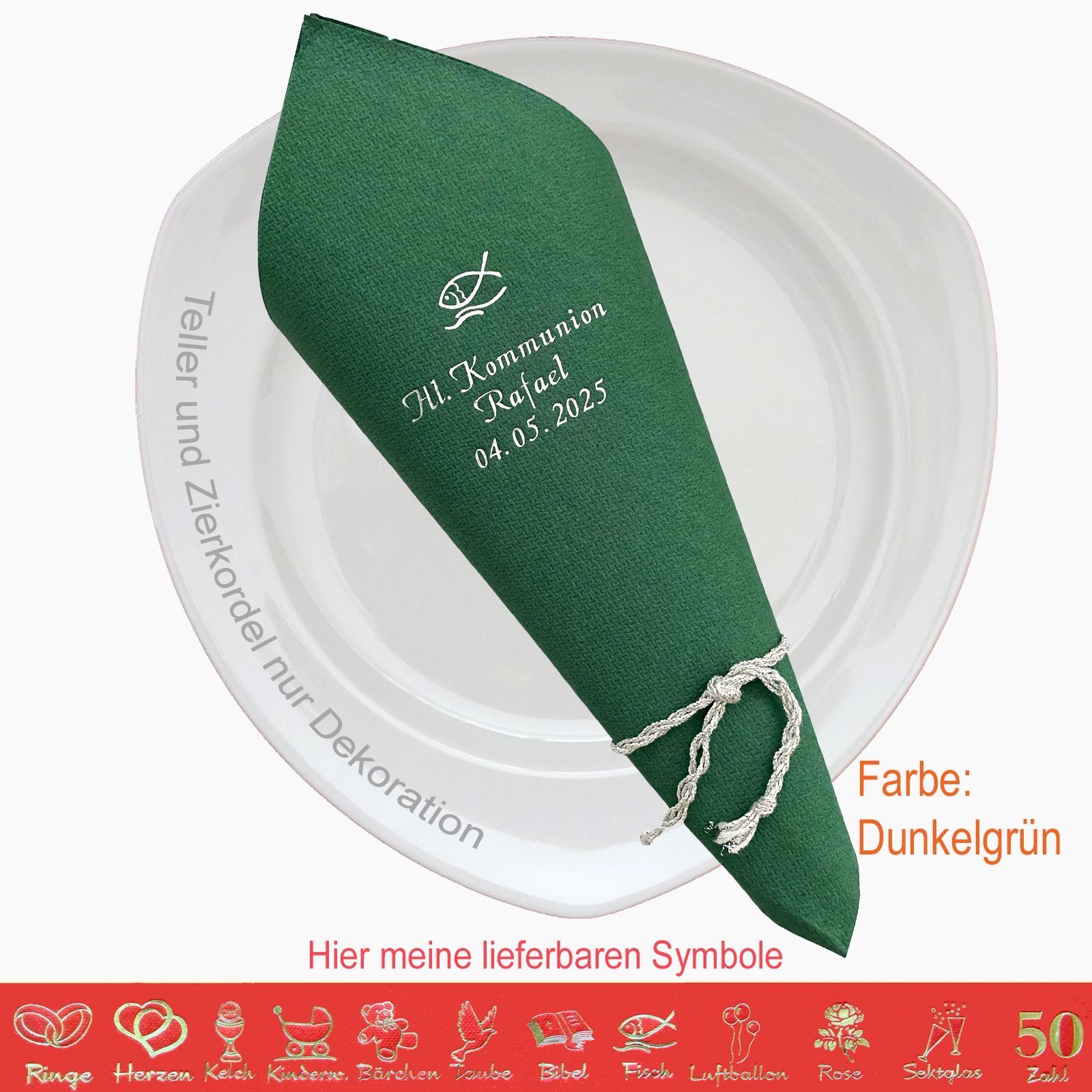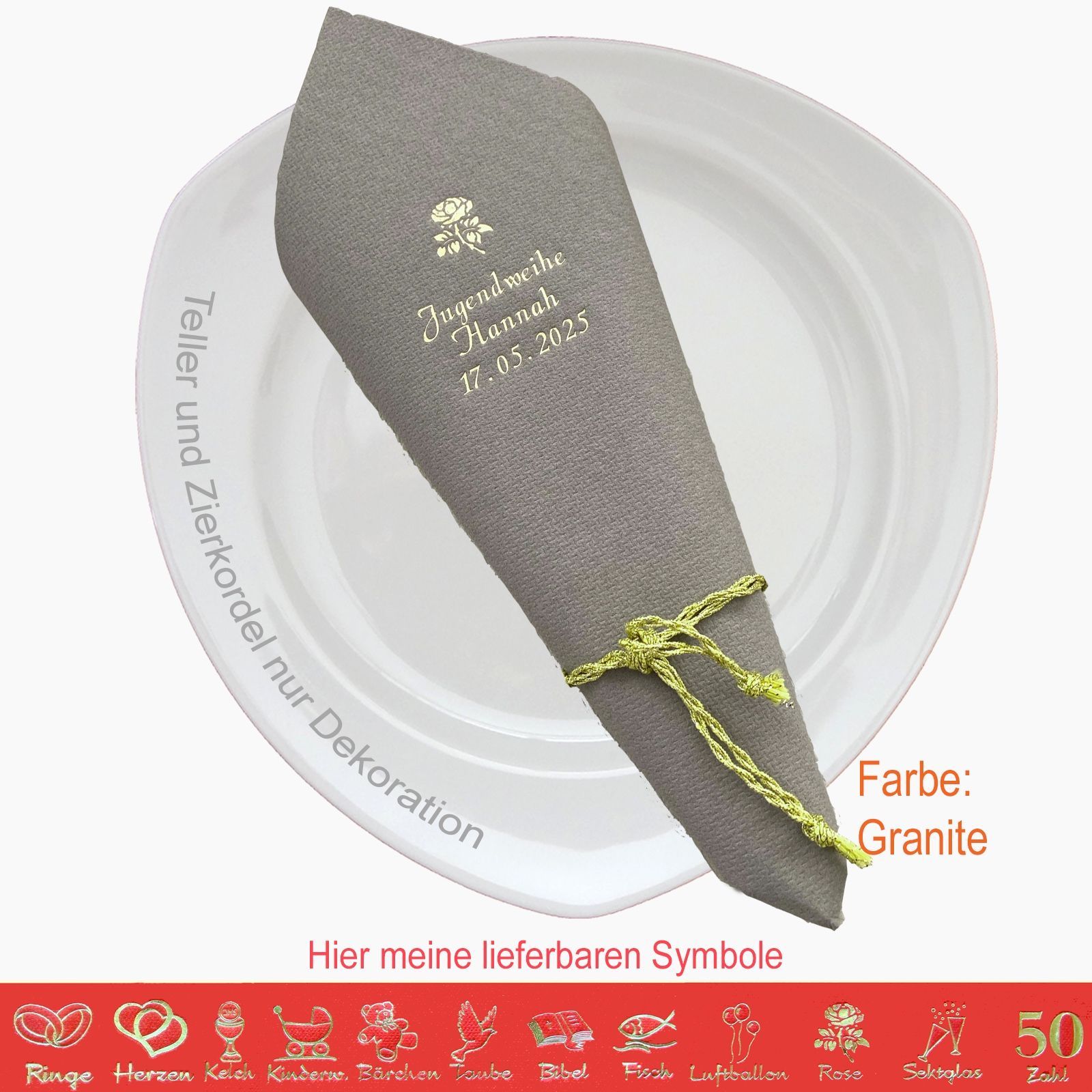 20 MIT NAMEN BEDRUCKTE PREMIUM-SERVIETTEN Elegante dekorative Stoffoptik zum festlichen Mittags-/Abendgedeck Schriftfarbe SILBER, KUPFER, GOLD oder SCHWARZ, WEISS, BLAU, GRÜN, ROT, ROSA Bitte Ihre Angaben zur Personalisierung nach dem Kauf mitteilen. - welche Feier - Datum der Feier - gewünschter Namen - welches Symbol - welche Schriftfarbe