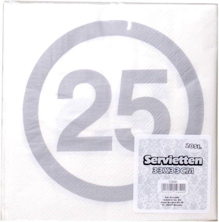 Servietten Silber im Warnschild Design mit Aufdruck"25" für Silberhochzeit