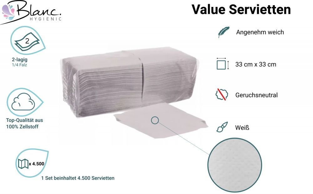 Servietten weiß, 33er, 1/4 Falz, 2-lagig, 4.500 Qualitäts-Servietten, 100% Zellstoff,