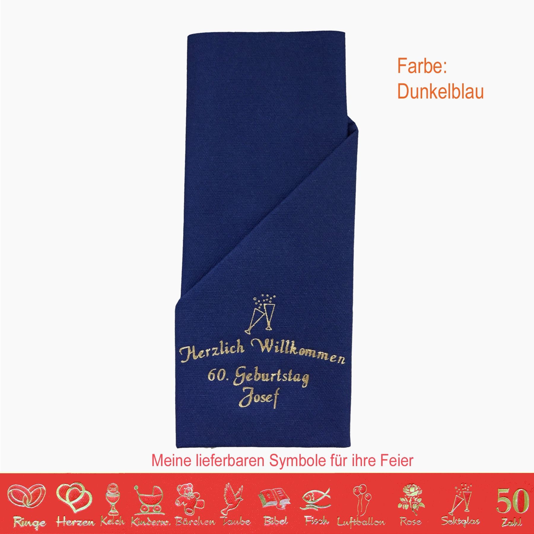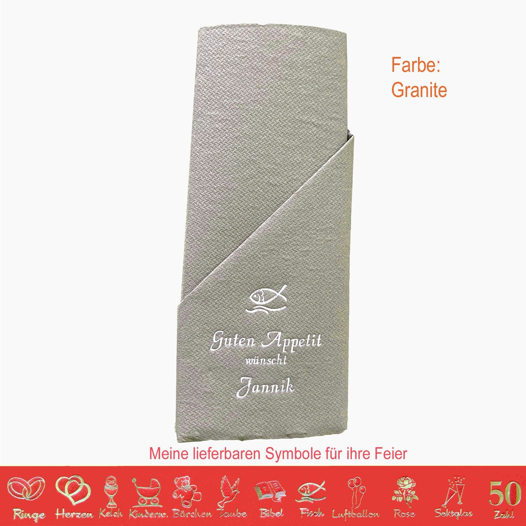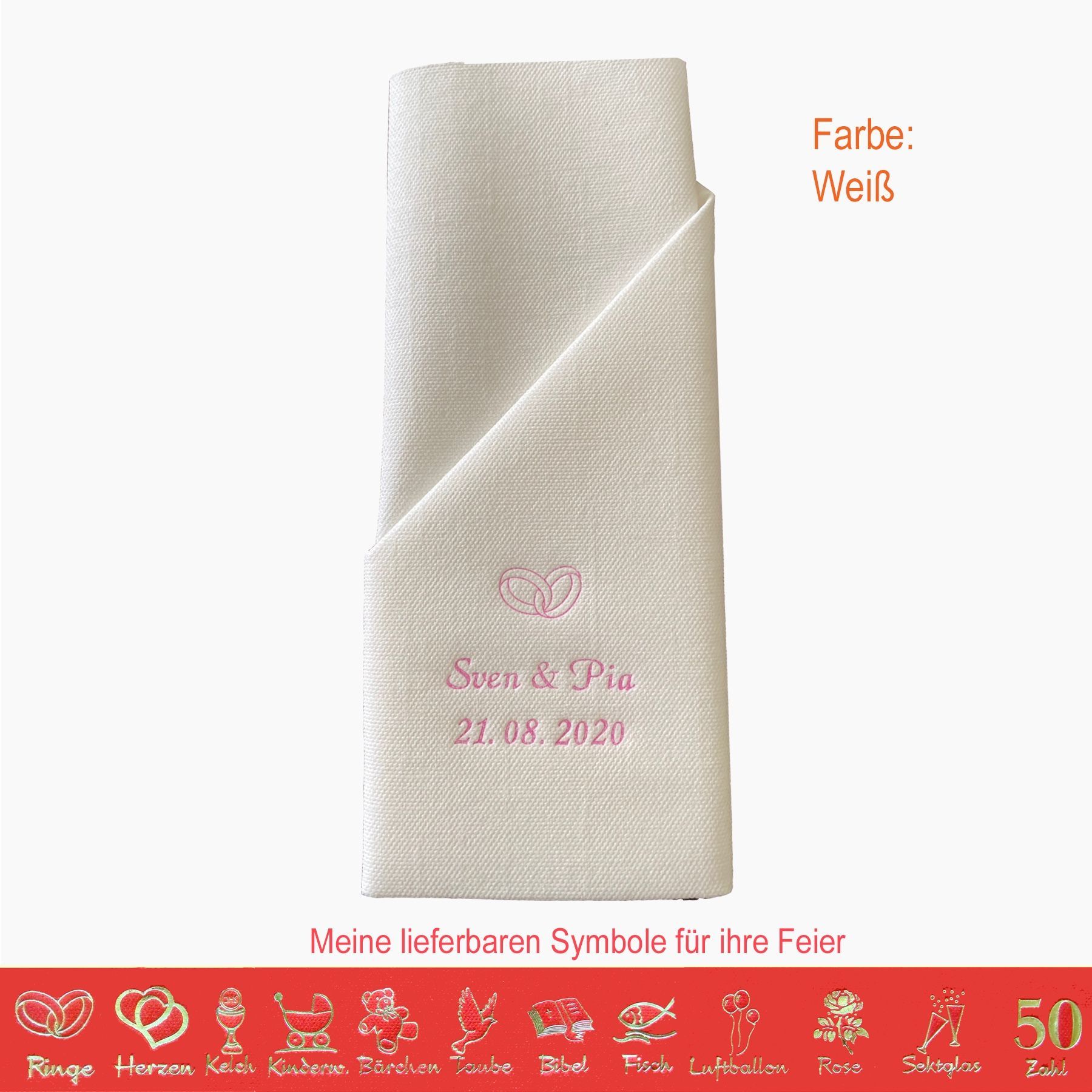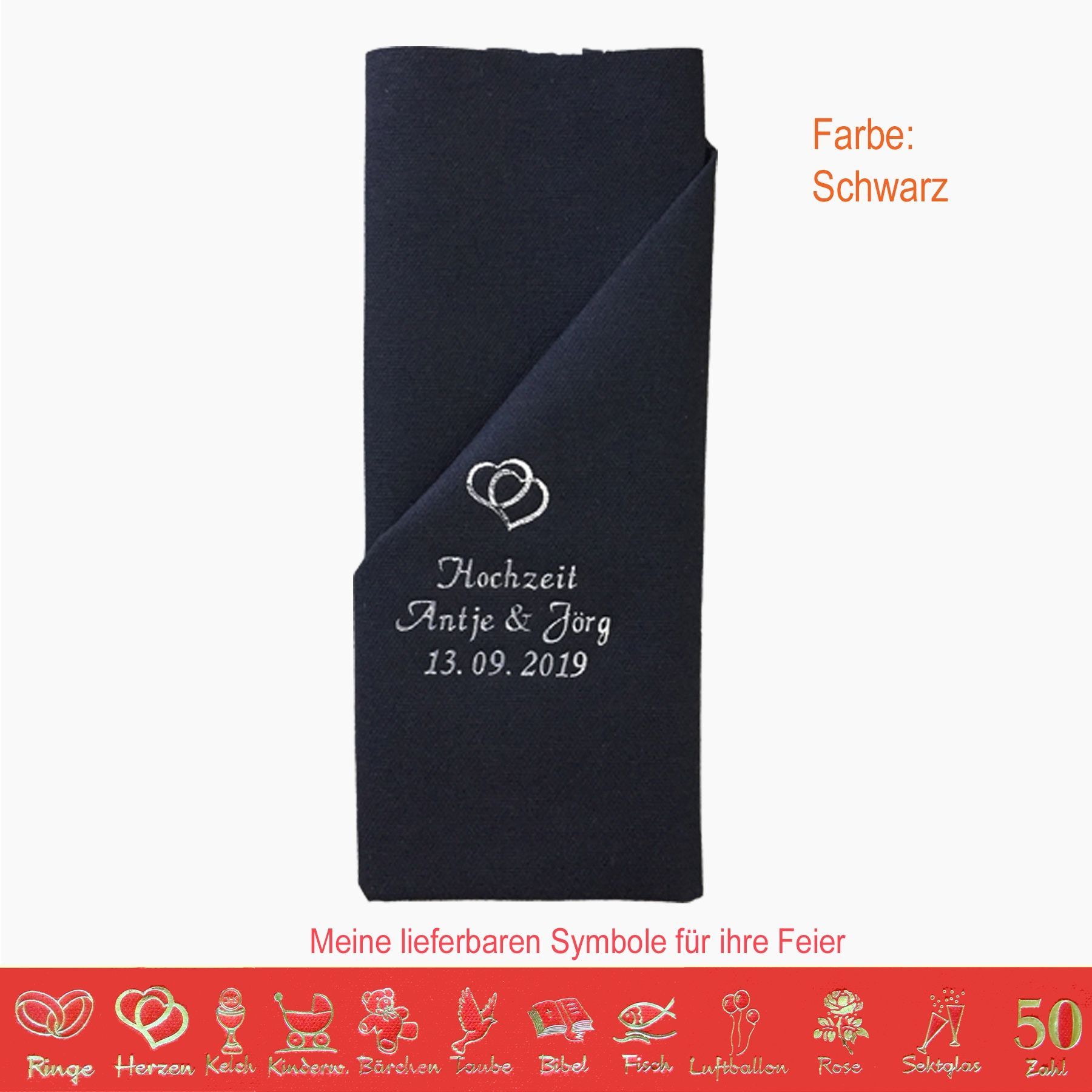 20 MIT NAMEN BEDRUCKTE PREMIUM-SERVIETTEN zum Falten einer Serviettentasche (Faltanleitung liegt bei) Einfach Besteck oder Gastgeschenk einstecken Schriftfarbe SILBER, KUPFER, GOLD oder SCHWARZ, WEISS, BLAU, GRÜN, ROT, ROSA Bitte Ihre Angaben zur Personalisierung nach dem Kauf mitteilen. - welche Feier - Datum der Feier - gewünschter Namen - welches Symbol - welche Schriftfarbe