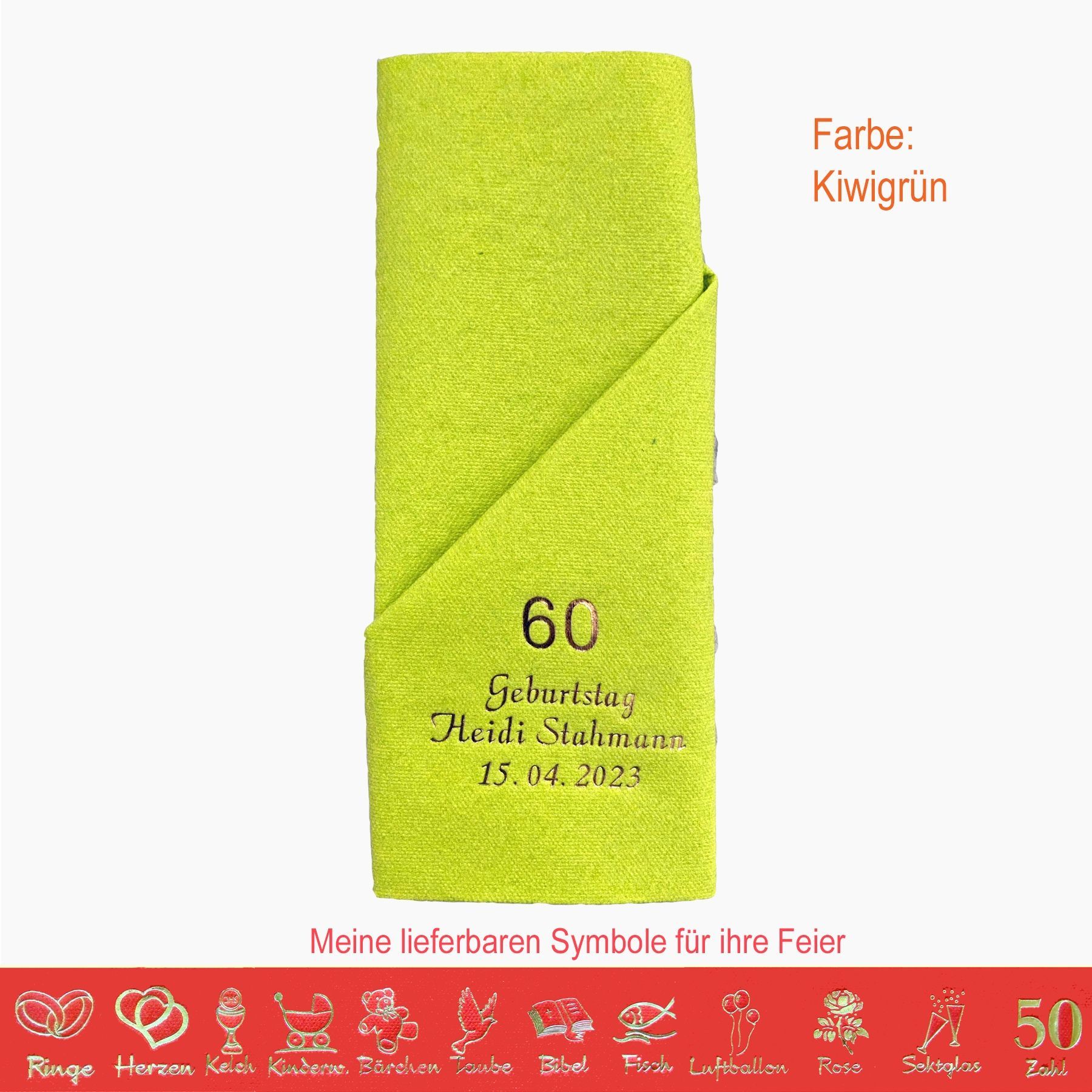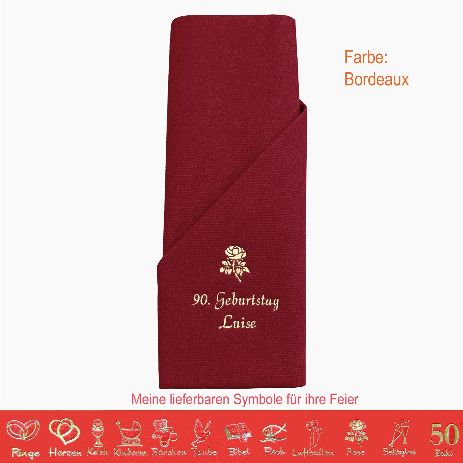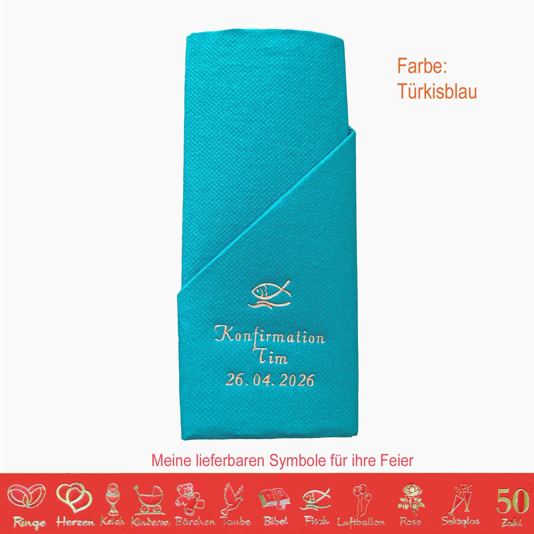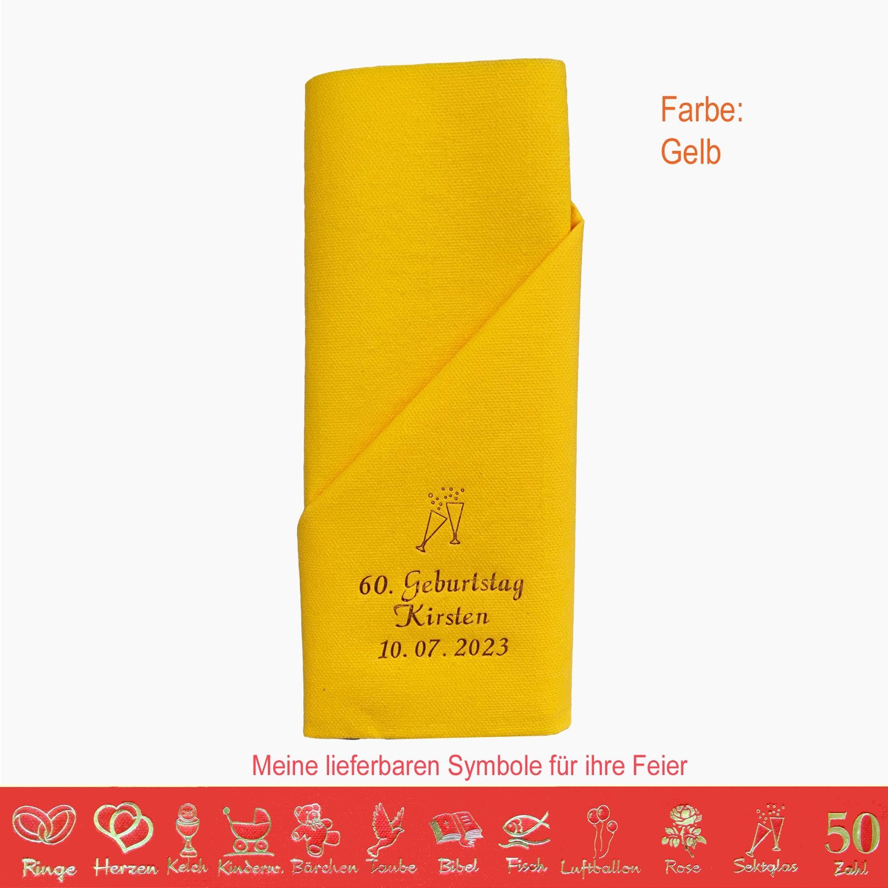 20 MIT NAMEN BEDRUCKTE PREMIUM-SERVIETTEN zum Falten einer Serviettentasche (Faltanleitung liegt bei) Einfach Besteck oder Gastgeschenk einstecken Schriftfarbe SILBER, KUPFER, GOLD oder SCHWARZ, WEISS, BLAU, GRÜN, ROT, ROSA Bitte Ihre Angaben zur Personalisierung nach dem Kauf mitteilen. - welche Feier - Datum der Feier - gewünschter Namen - welches Symbol - welche Schriftfarbe