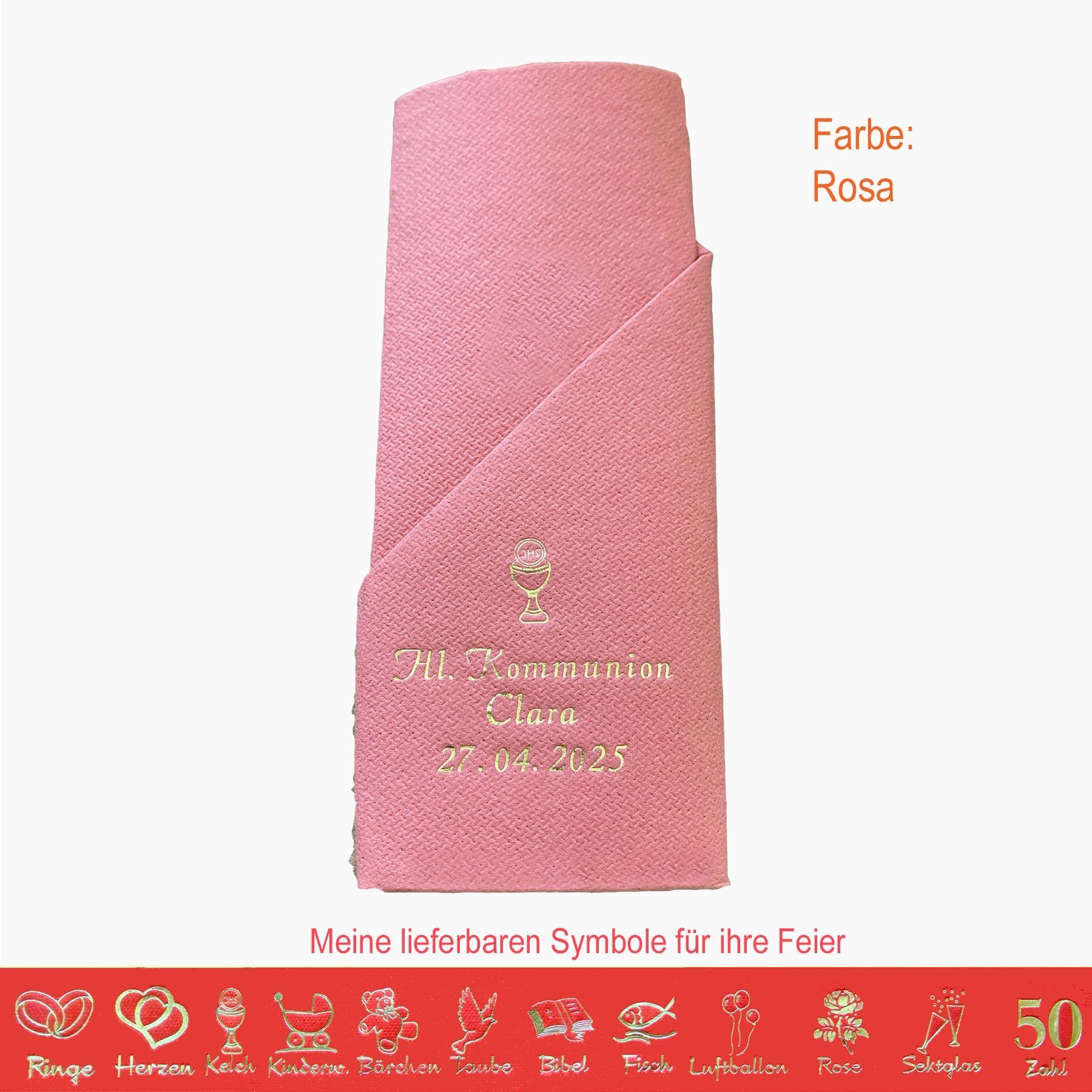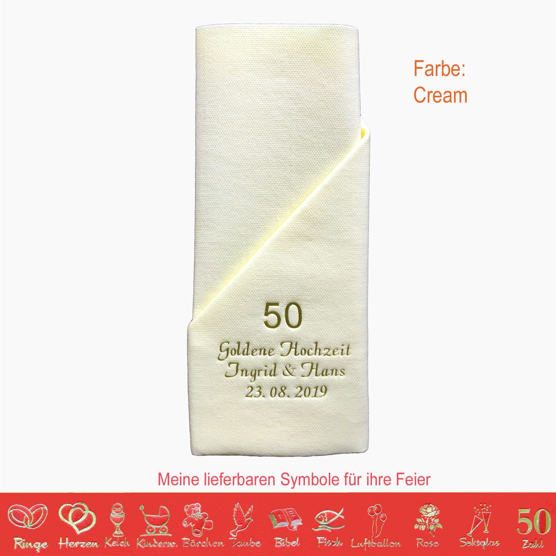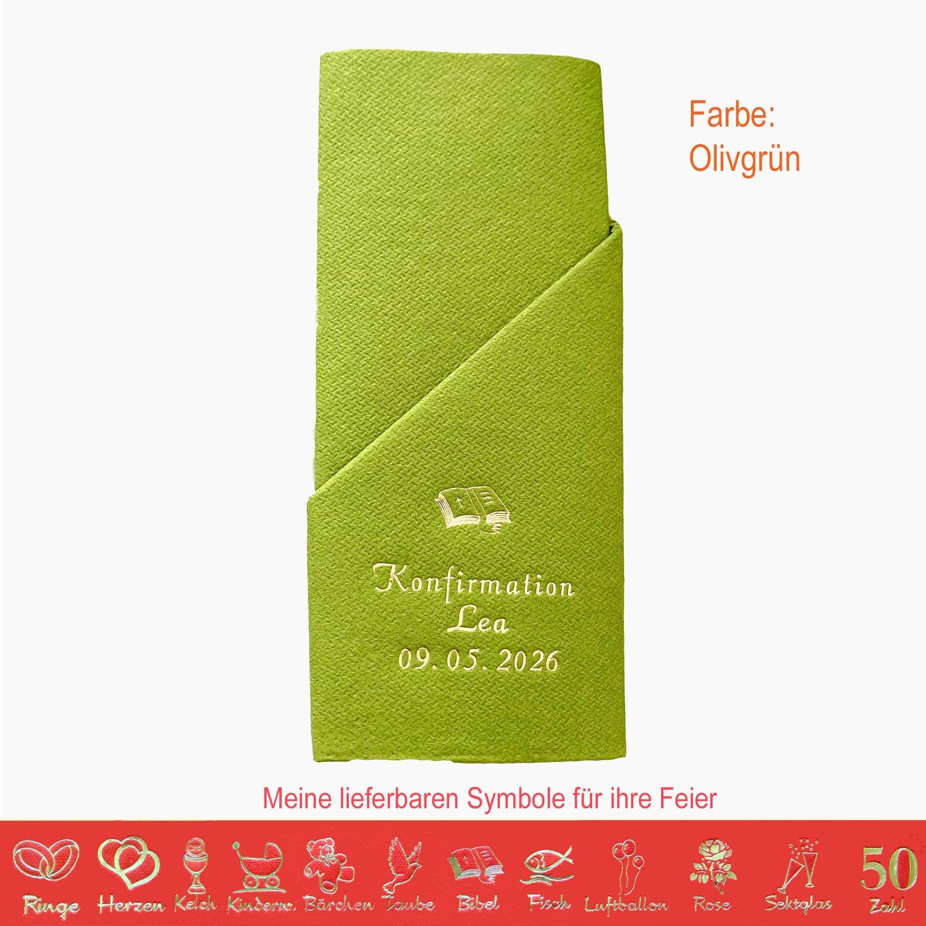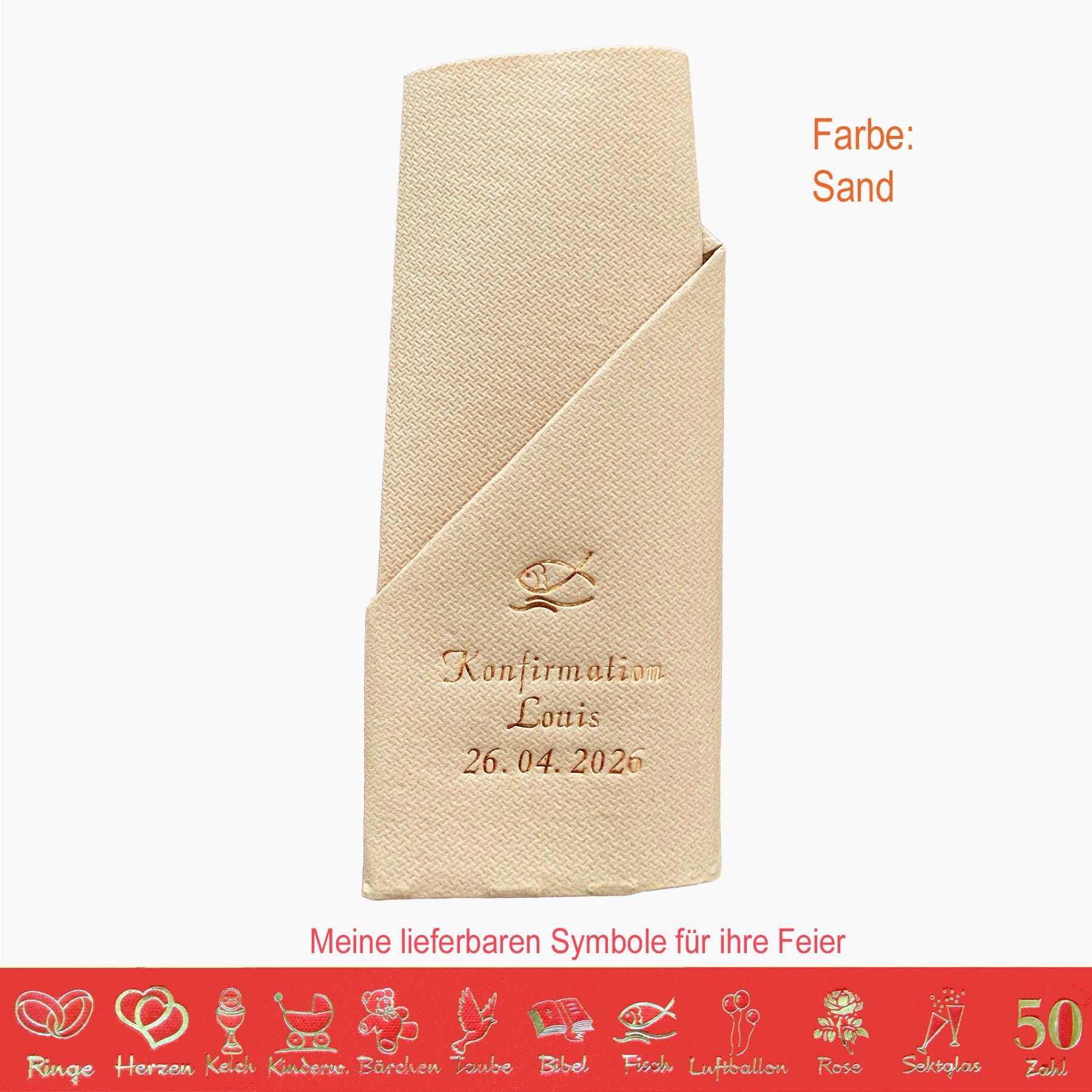 20 MIT NAMEN BEDRUCKTE PREMIUM-SERVIETTEN zum Falten einer Serviettentasche (Faltanleitung liegt bei) Einfach Besteck oder Gastgeschenk einstecken Schriftfarbe SILBER, KUPFER, GOLD oder SCHWARZ, WEISS, BLAU, GRÜN, ROT, ROSA Bitte Ihre Angaben zur Personalisierung nach dem Kauf mitteilen. - welche Feier - Datum der Feier - gewünschter Namen - welches Symbol - welche Schriftfarbe