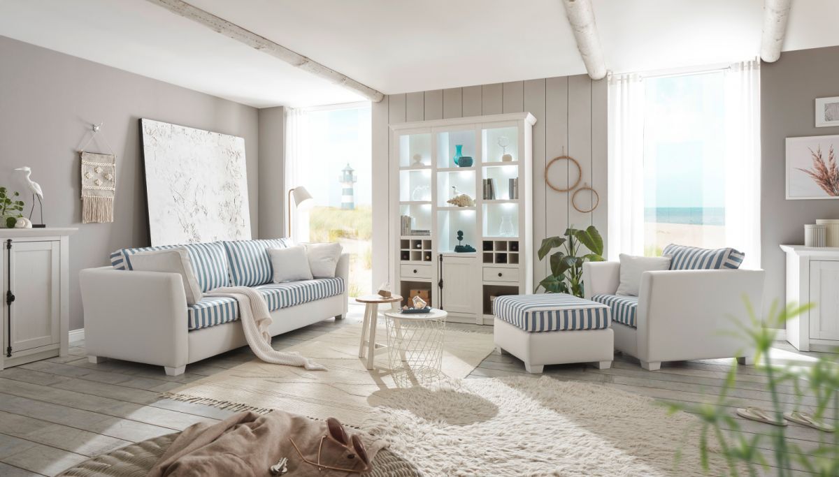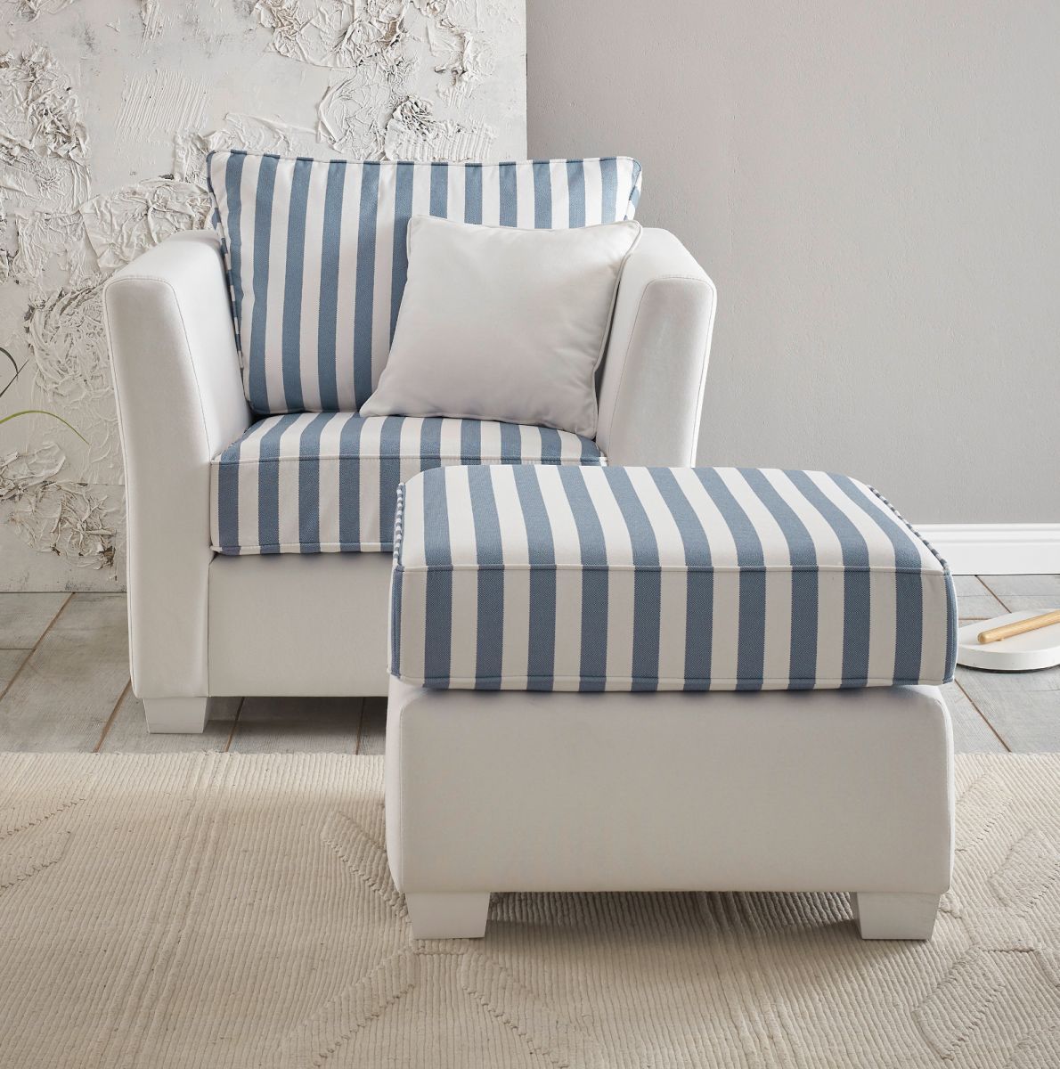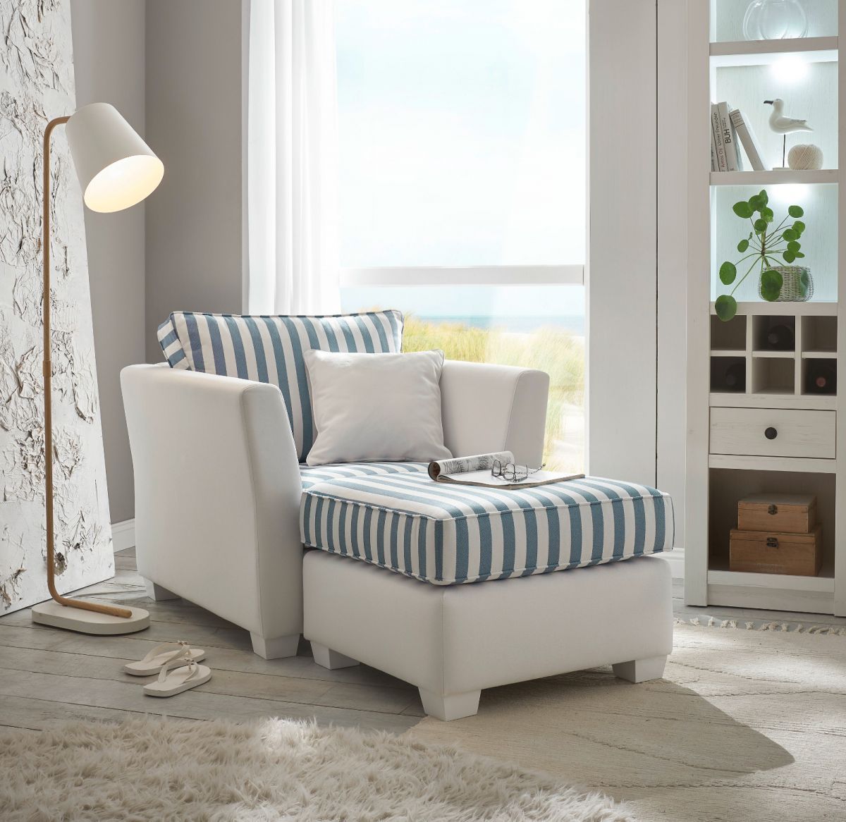 Sessel Set Landhaus Loungesessel mit Hocker Polstersessel in creme und blau Hooge