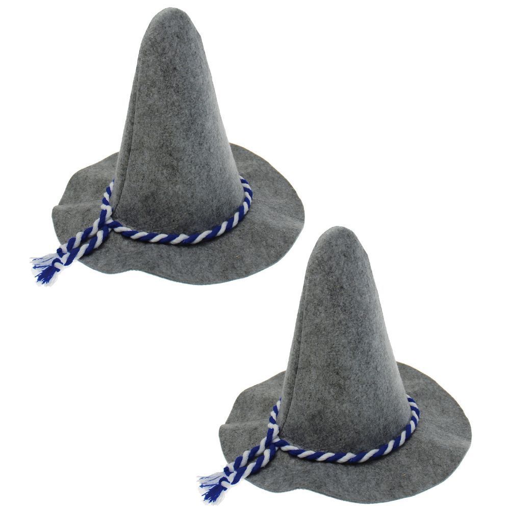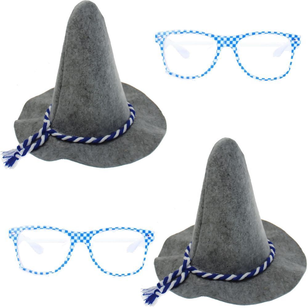 Set 2 x Tiroler Hut Bayernhut 2 x Bayernbrille Hut Brille Filzhut Oktoberfest Seppelhut Alpenhut Material Hut: Filz Farbe Hut: grau mit blau/weißer Cordel Größe Hut: 35 x 27cm Liefermenge: 2 x Bayernhut Material Brille: Kunststoff Farbe Brille: blau/weißer mit durchsichtigen Gläsern Größe: 15 x 5cm Liefermenge: 2 x Bayernbrille