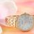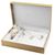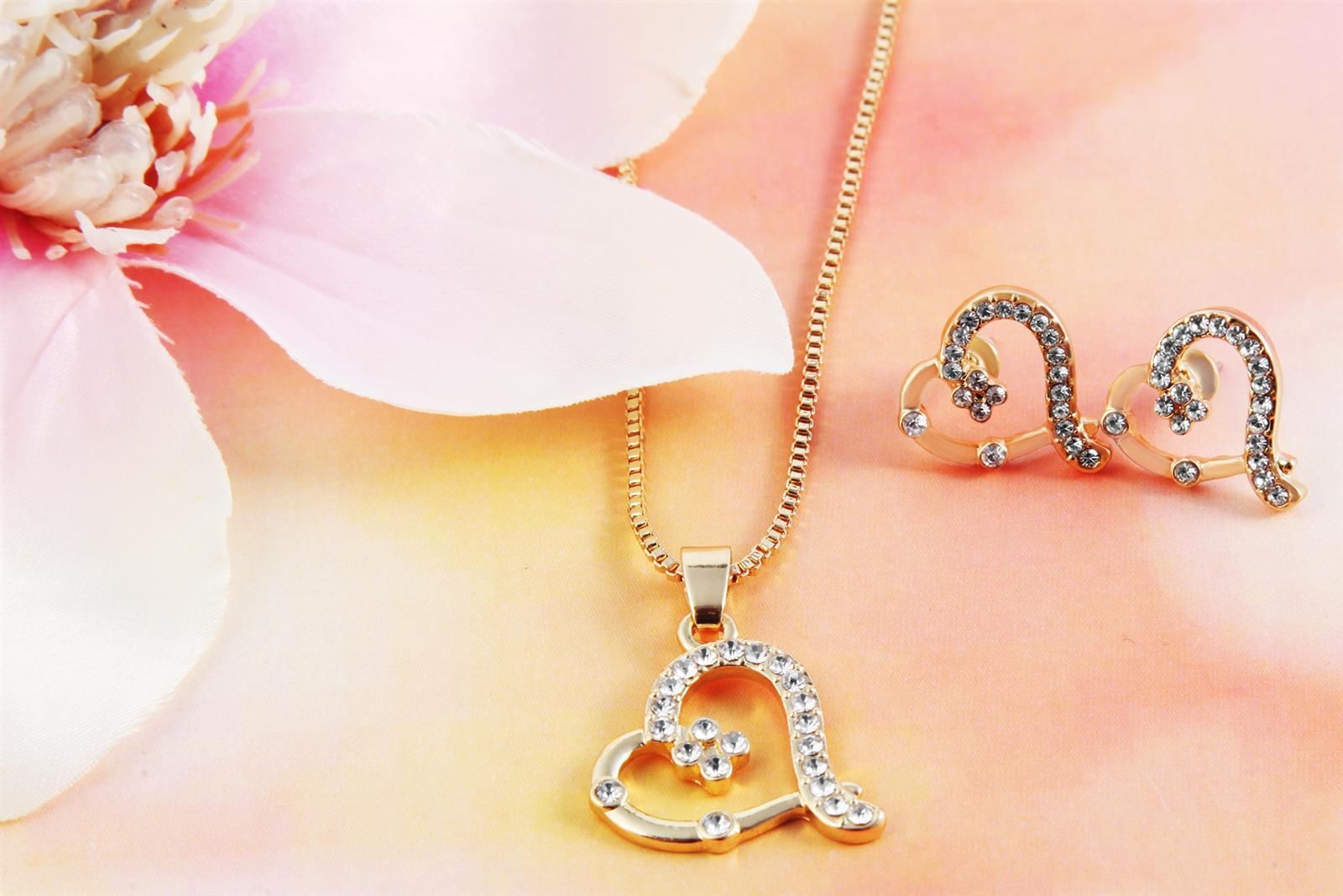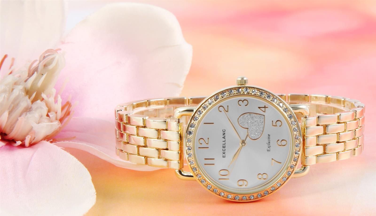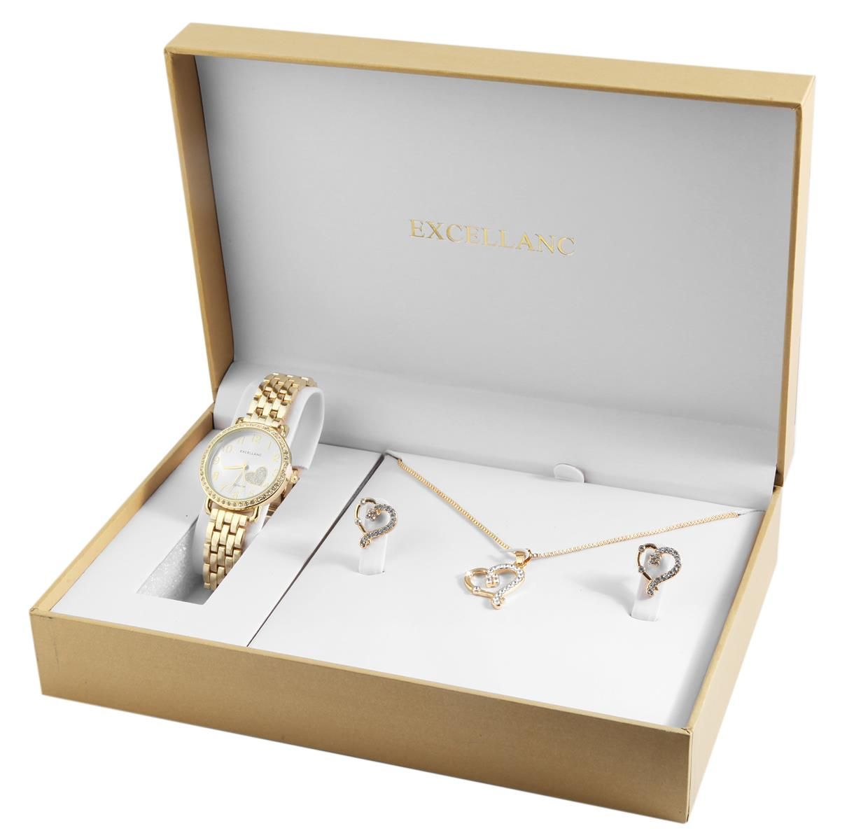 Set aus goldfarbener Damenuhr, Herz-Ohrringen und Kette mit Herz-Anhänger