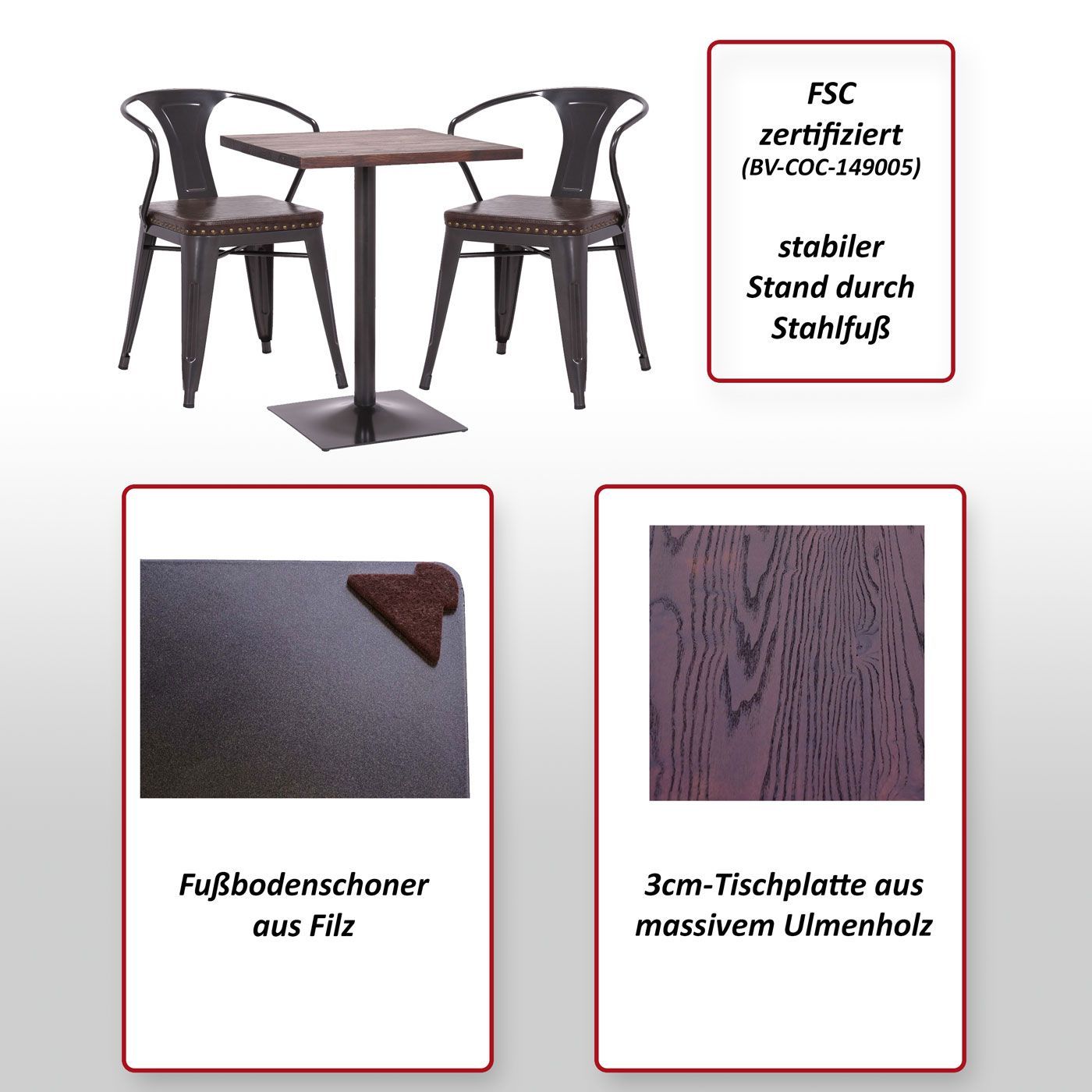 Mendler Set Bistrotisch 2x Esszimmerstuhl HWC-H10d, Stuhl Tisch Küchenstuhl Gastronomie FSC