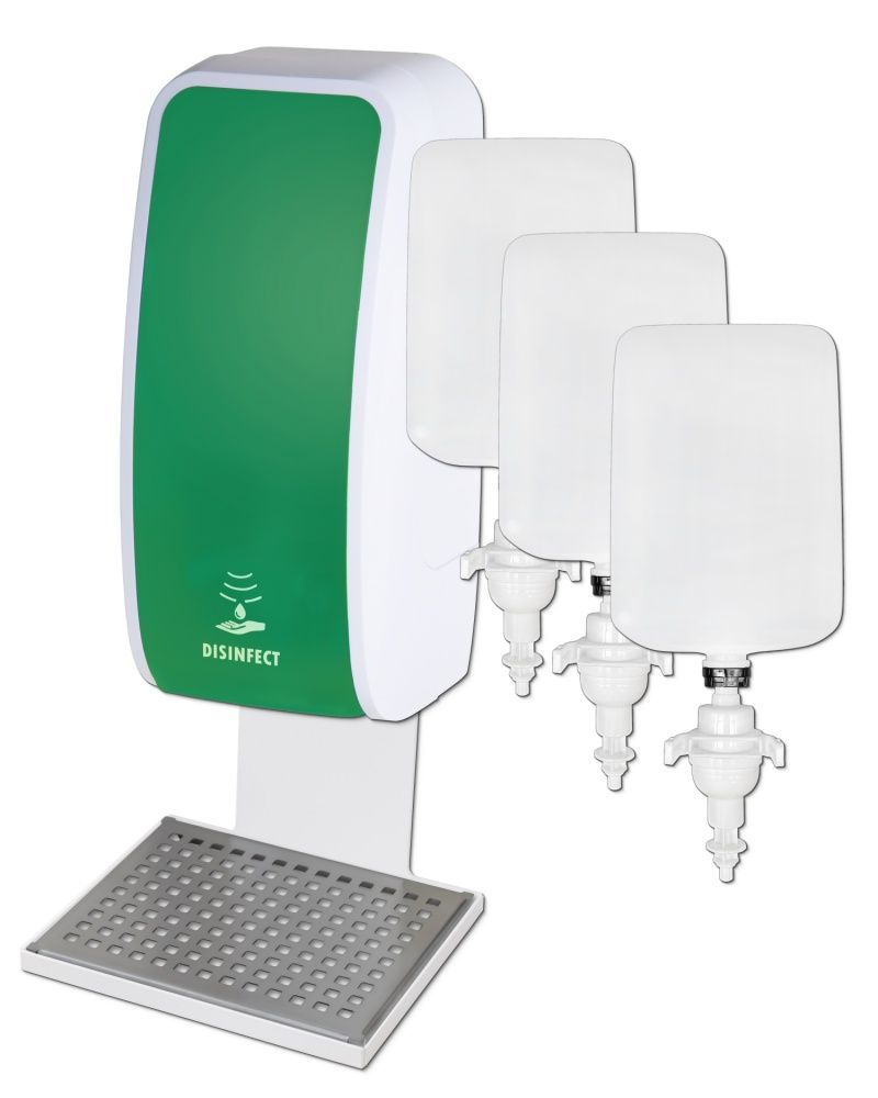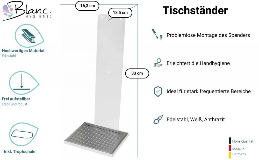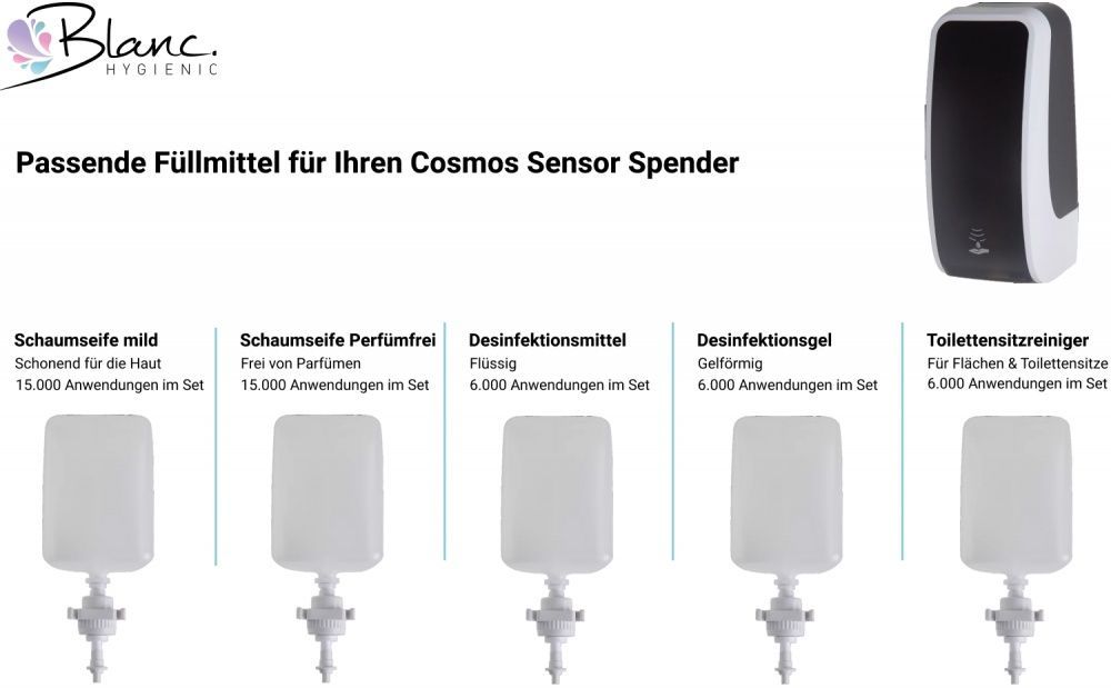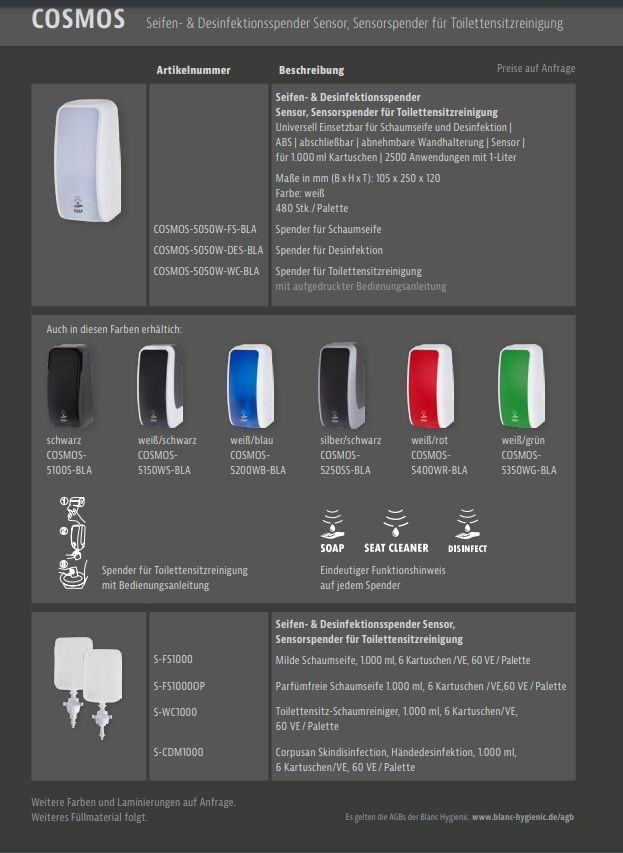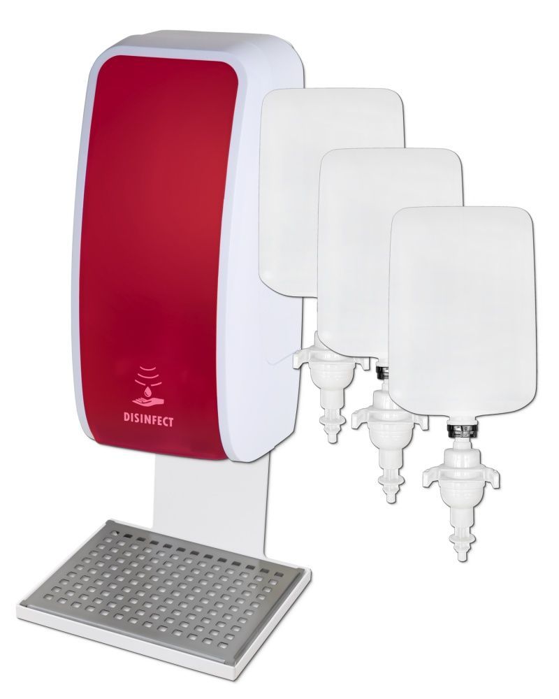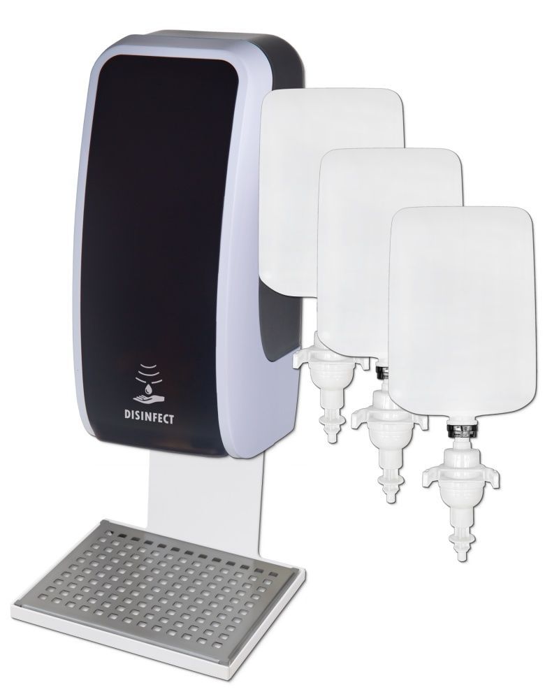 SET: Desinfektionsspender SENSOR Blanc Cosmos versch. Farben + Tischständer weiß + 3x