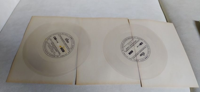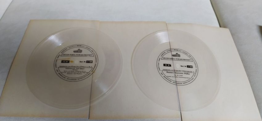 vintage Format: 7-Zoll- Folien Disk , 45 Umin, Produkt: Transparente Vinyl-Schallplatten (Flexi-Discs). Bei diesen Tonträgern handelt es sich um biegsame, meist einseitig bespielbare Kunststoffscheiben, die oft als Beilage in Zeitschriften oder Heften dienten zum einen klingenden Liebesroman Nummer