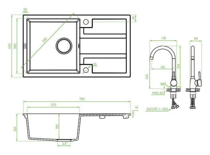 SET Küchenarmatur & Granitspüle 1-Becken Barbados Schwarz 44x76 | Siphon im SET!