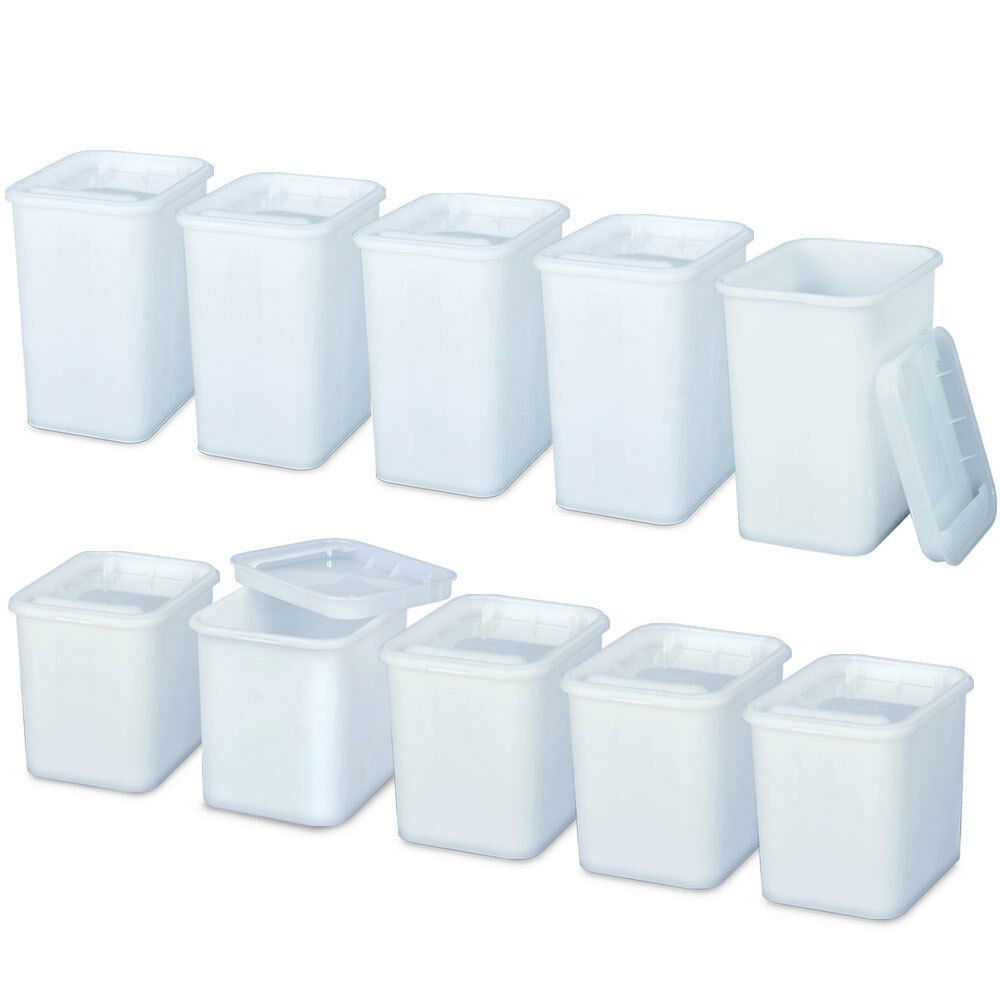 Praktische, bruchsichere Vorratsbehälter in Gastro-Qualität, mit dicht schließendem Deckel. Material Polyethylen-Kunststoff (PE-HD). 5x Zutatendose mit Deckel LxBxH 170 x 140 x 150 mm 2 Liter Material PE-HD, lebensmittelecht, weiß 5x Zutatendose mit Deckel LxBxH 170 x 140 x 210 mm 3 Liter Material P
