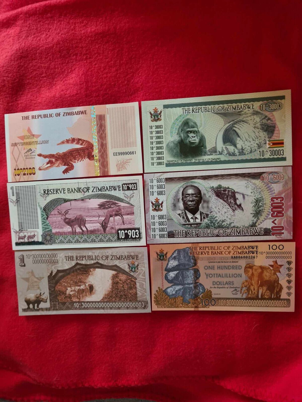 6 Stück Banknoten - Zimbabwe - unzirkuliert und Bankfrisch - sehr selten Je 1 Scheine von Zimbabwe wie abgebildet One Septingentillion, One Myrillion, One hundret Yotttalillion, One Tricentillion, One Zettalillion, One Dumillillion Die Seriennummern sind nicht identisch da jeder Schein eine andere h