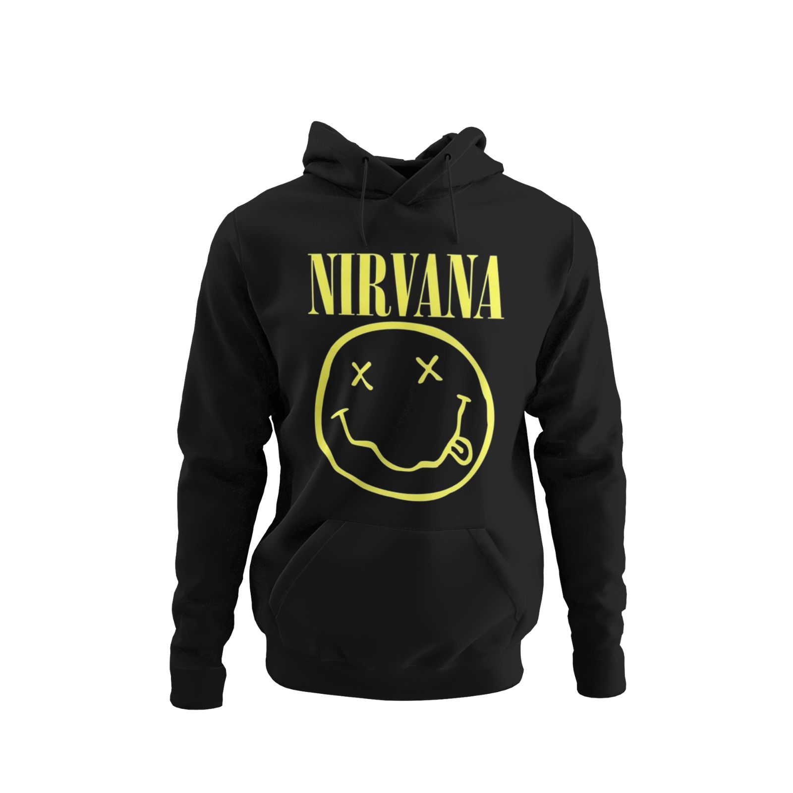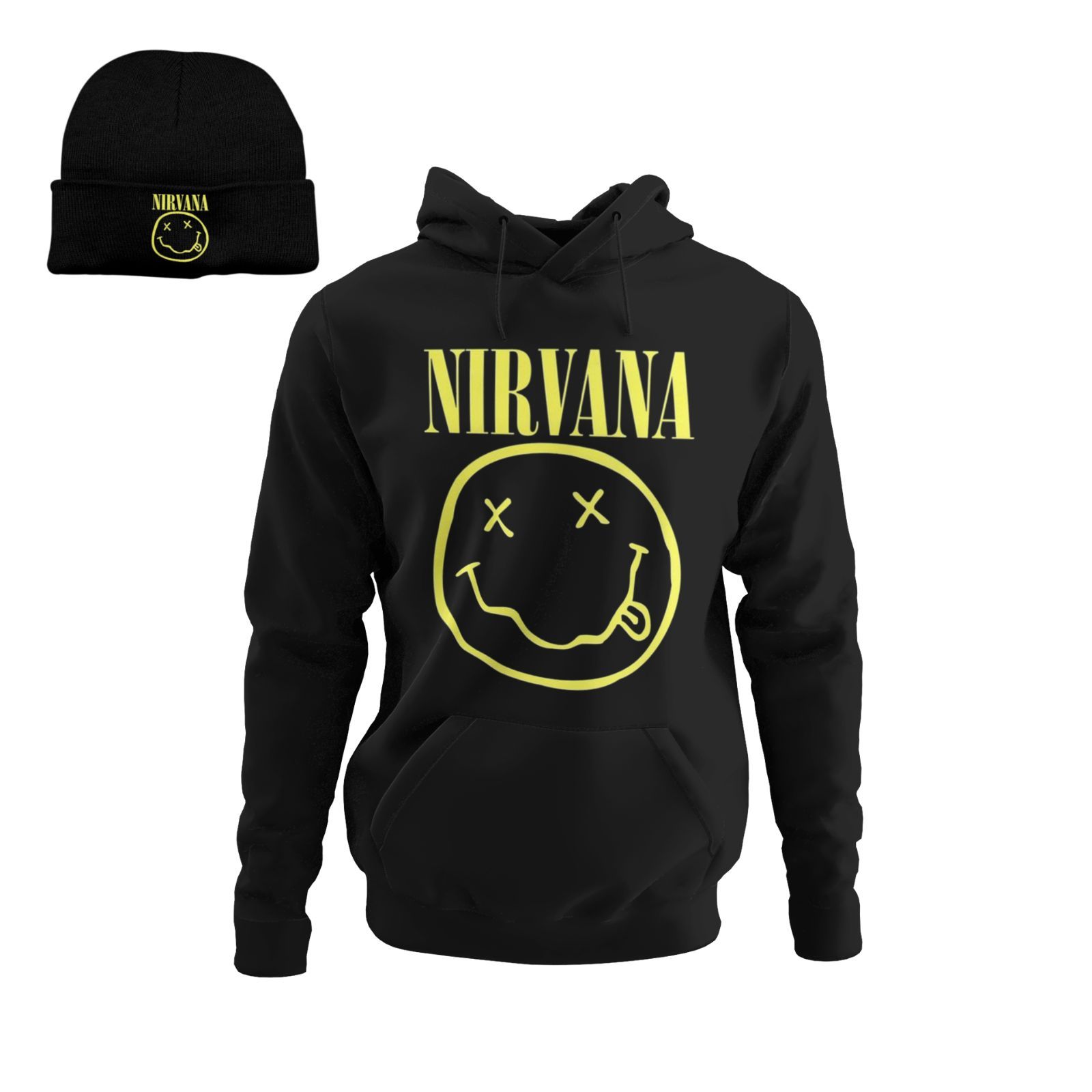Nirvana Smiley – Hoodie & Mütze Produktbeschreibung: Dieses Set Nirvana Smiley , bestehend aus einem Herren Hoodie und einer passenden Mütze , ist ein echtes Highlight für alle Fans der 80er, Kurt Cobain und der legendären Band Nirvana. Mit dem ikonischen gelben Smiley-Logo bringt das Set den Ge