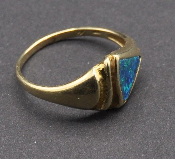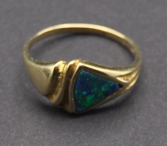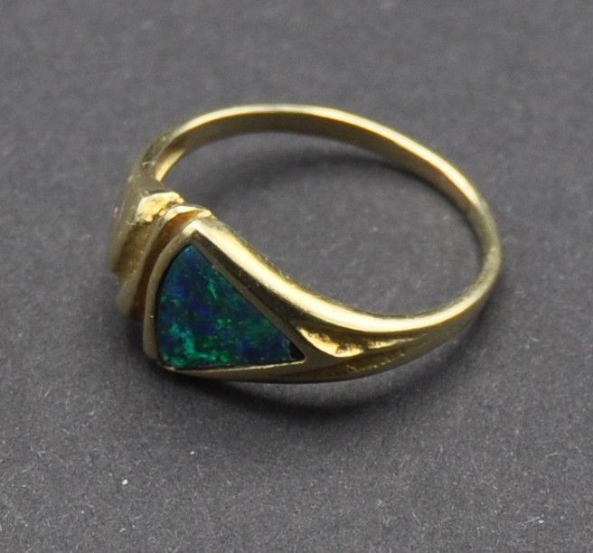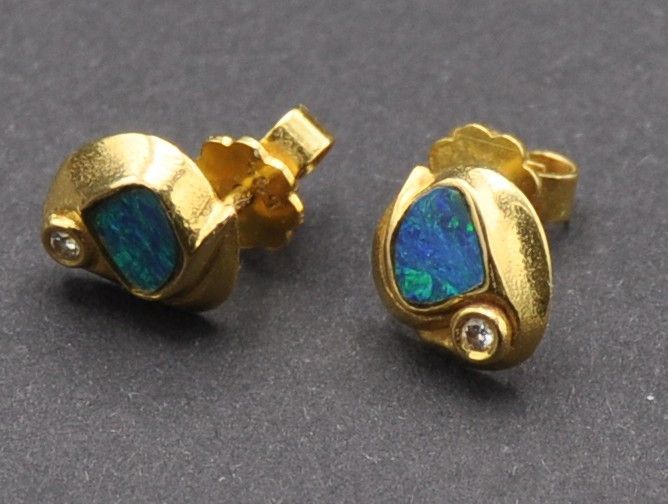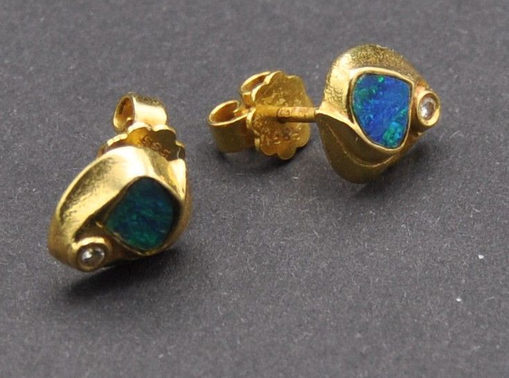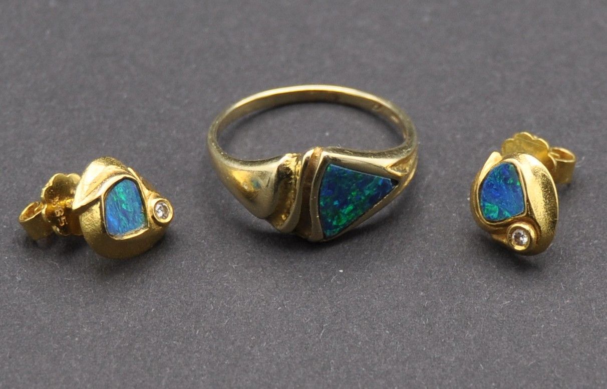 Das Set ist stabil und solide gearbeitet und wiegt zusammen knapp 6 Gramm. Der Ringkopf hat eine Breite von 0,95 cm und einen Innendurchmesser von 1,73 cm. Er ist von hinten verbödet. Die Ohrringe haben die Maße 1,0 x 0,9 cm. Sie tragen neben dem Boulder Opal noch einen Diamanten. Die Schmuckstücke sind 585 gestempelt.