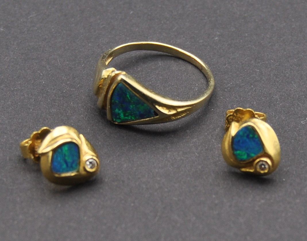 Set Ohrringe Ring Boulder Opal Solitär Diamant Unikat 585 Gold Handarbeit