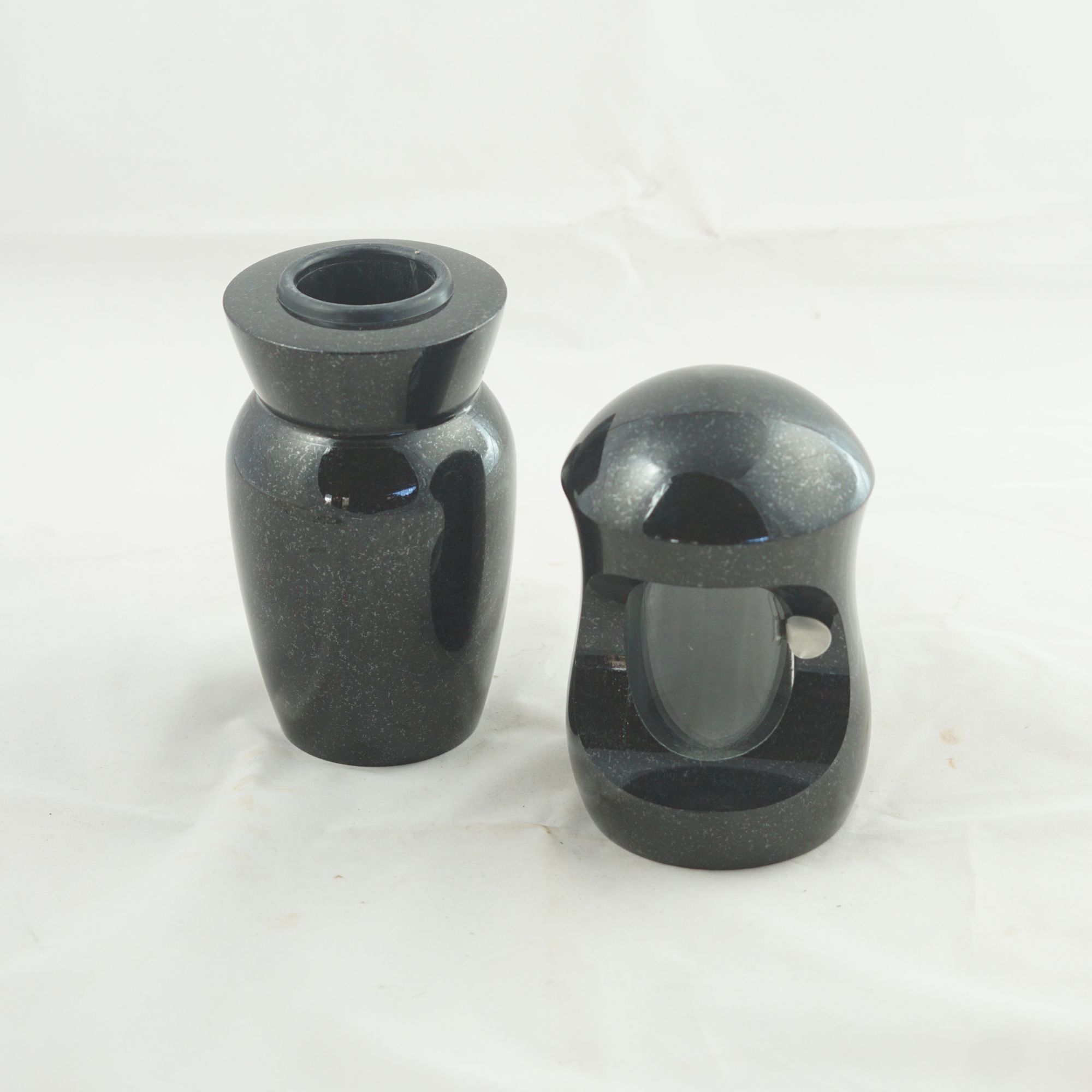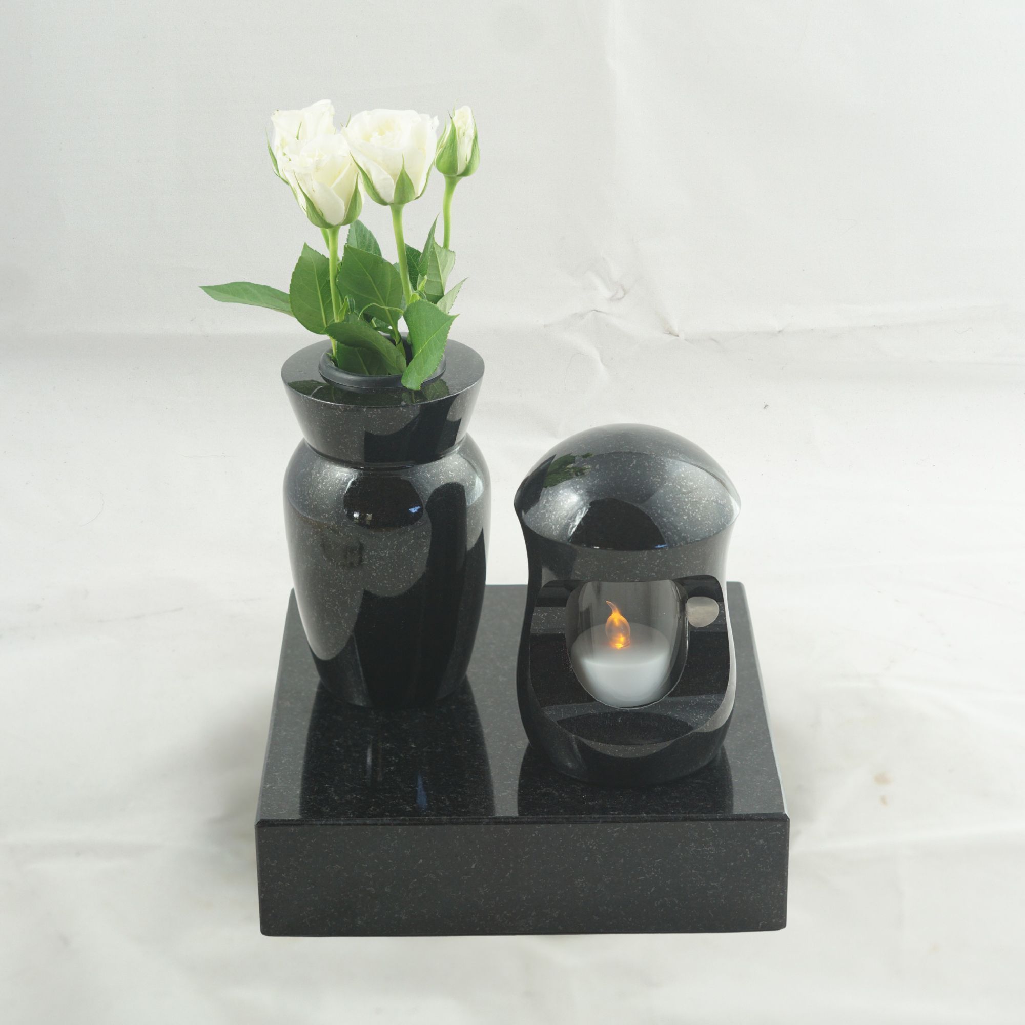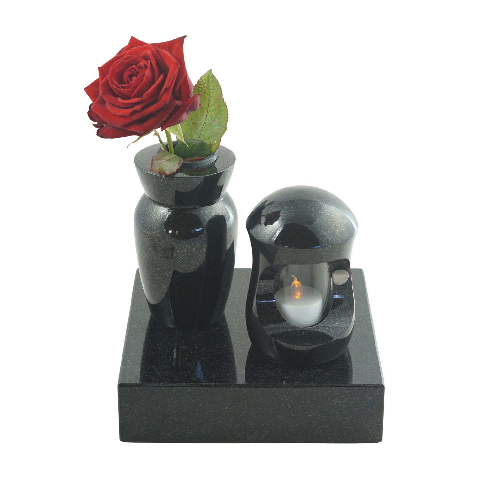 Kleines Grabschmuck-Set petit aus Granit Schwedisch Black, speziell für Wand- und kleine Urnengräber, bestehend aus: Grablampe Grabvase Grablampe: Höhe ca. 12,5 cm, Durchmesser ca. 8 cm Modernes Design und edle Materialien zeichnen diese formschöne und qualitativ sehr hochwertige Grablampe aus. Durc