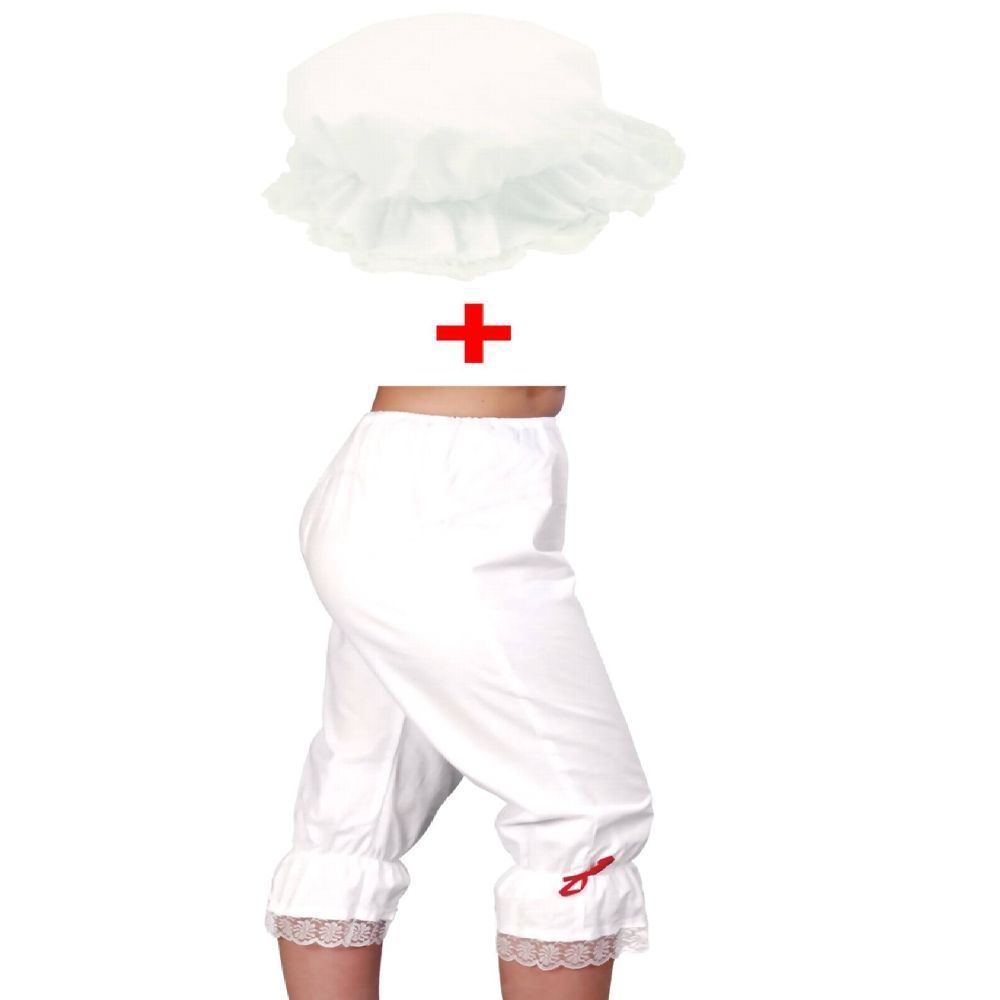 Die Schlafmütze mit Spitze passt auf fast jeden Kopf, da Sie einen Gummizug hat. Farbe: weiß Material: 70% Polyester, 30% Baumwolle Größe: Einheitsgröße S/M Inhalt: 1 Stück Set Schlafmütze + Rüschenhose Kniehose Nachthaube JGA Party Die Rüschenhose mit Spitze hat Gummizug und rote Schleifchen Farbe: weiß Material: 65% Polyester, 35% Baumwolle Größe: 38/40 - Bundweite max. 92 cm gedehnt - Hosenlänge ca. 75 cm