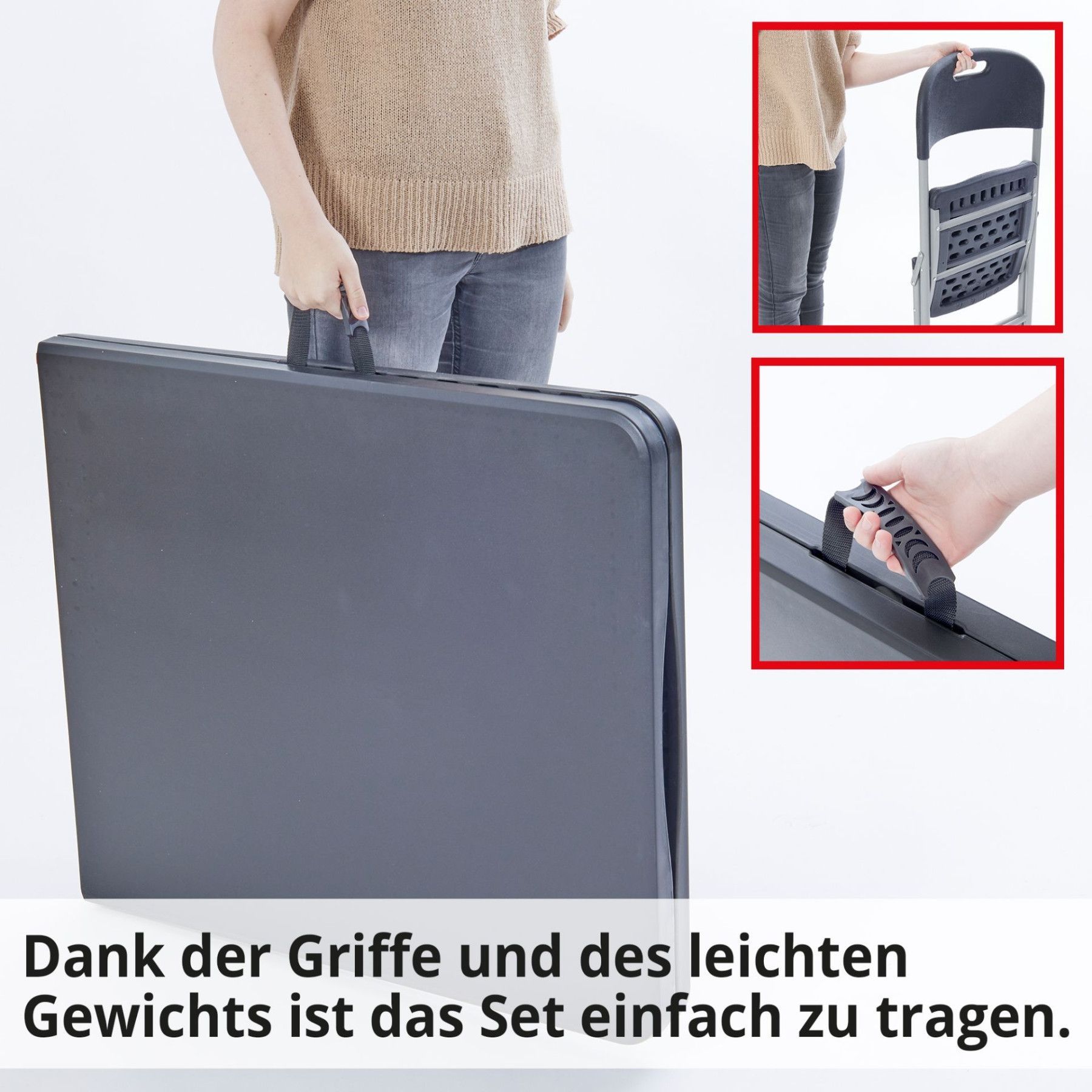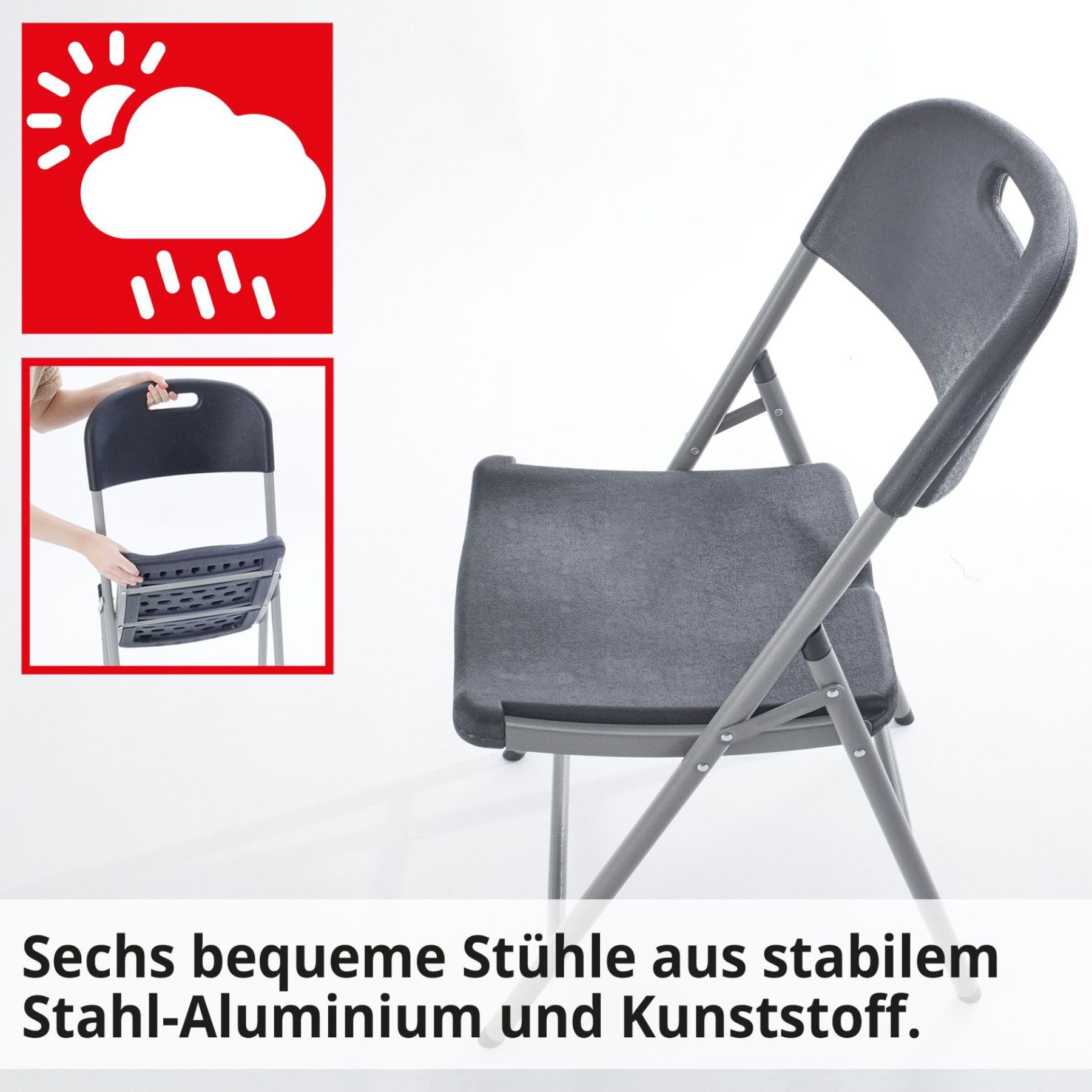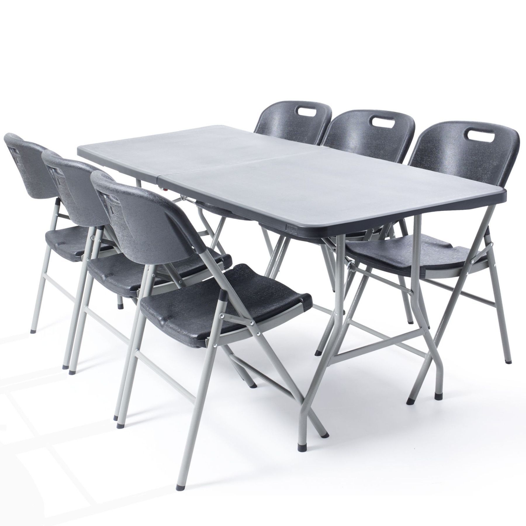 Produktinformationen Set – Tisch mit 6 Stühlen Das große 7-teilige Tischgruppen Set ist die perfekte Wahl für Geburtstage, Partys, Grillabende oder auch zum Mitnehmen für Ihr Camping Abenteuer. Sie erhalten das Set mit sechs hochwertigen und leichten Stühlen mit hohem Sitzkomfort. Der Buffettisch bi