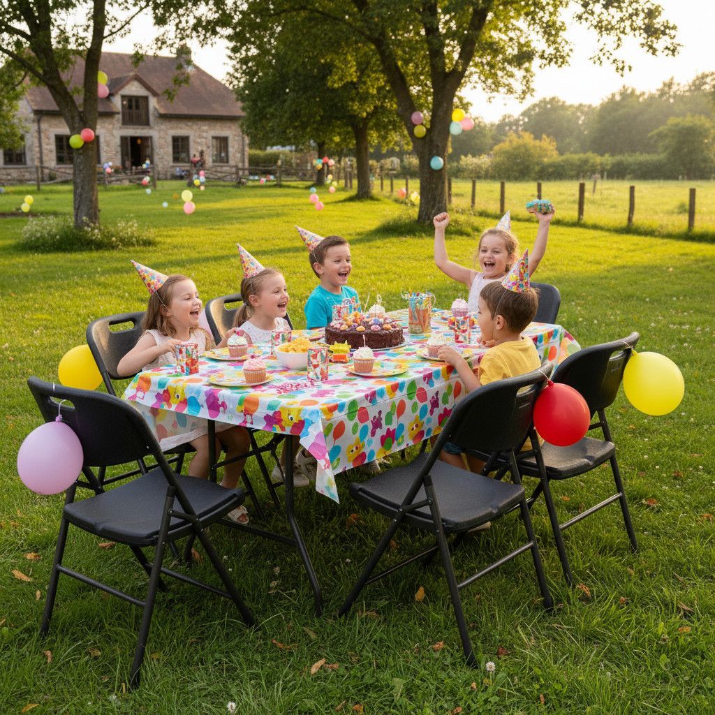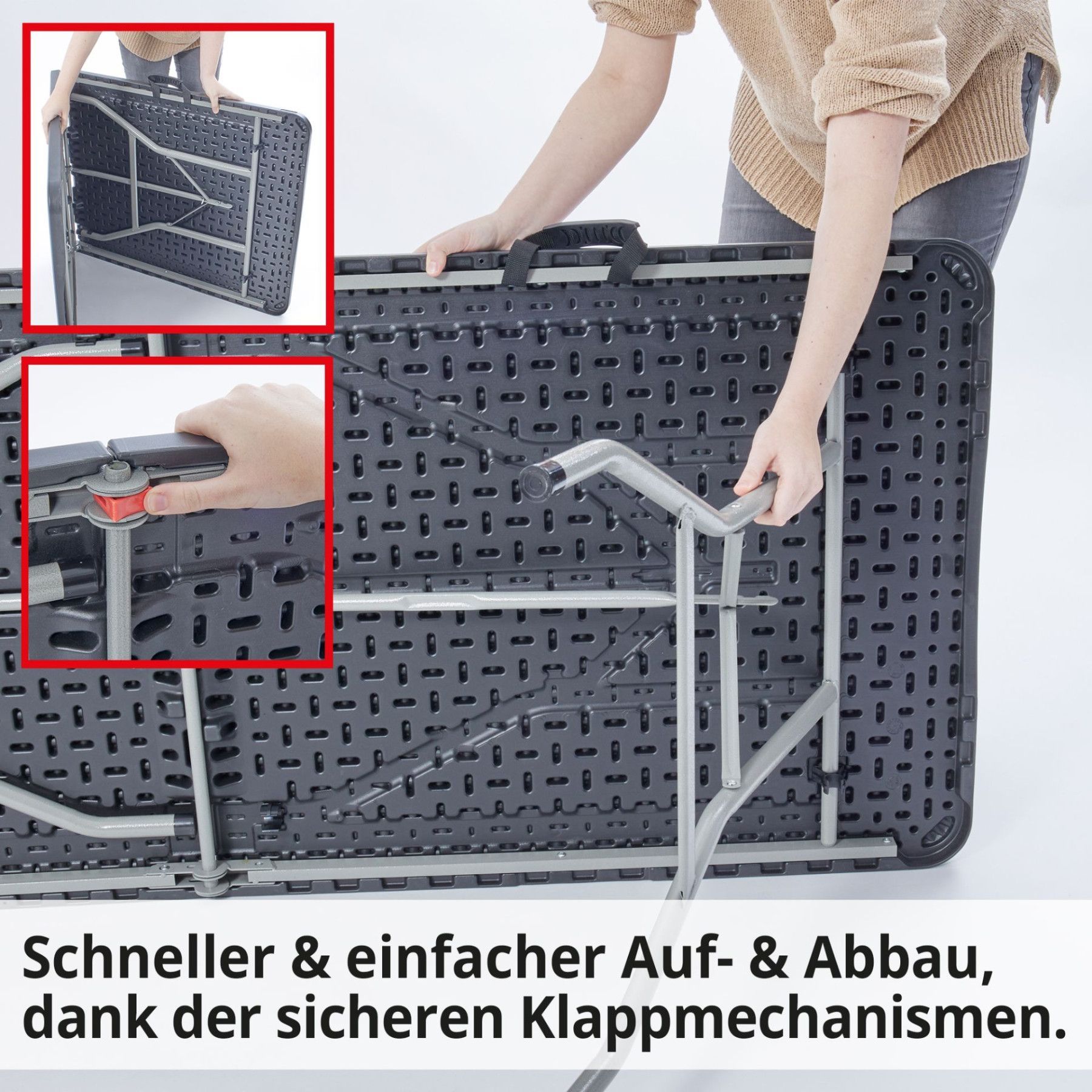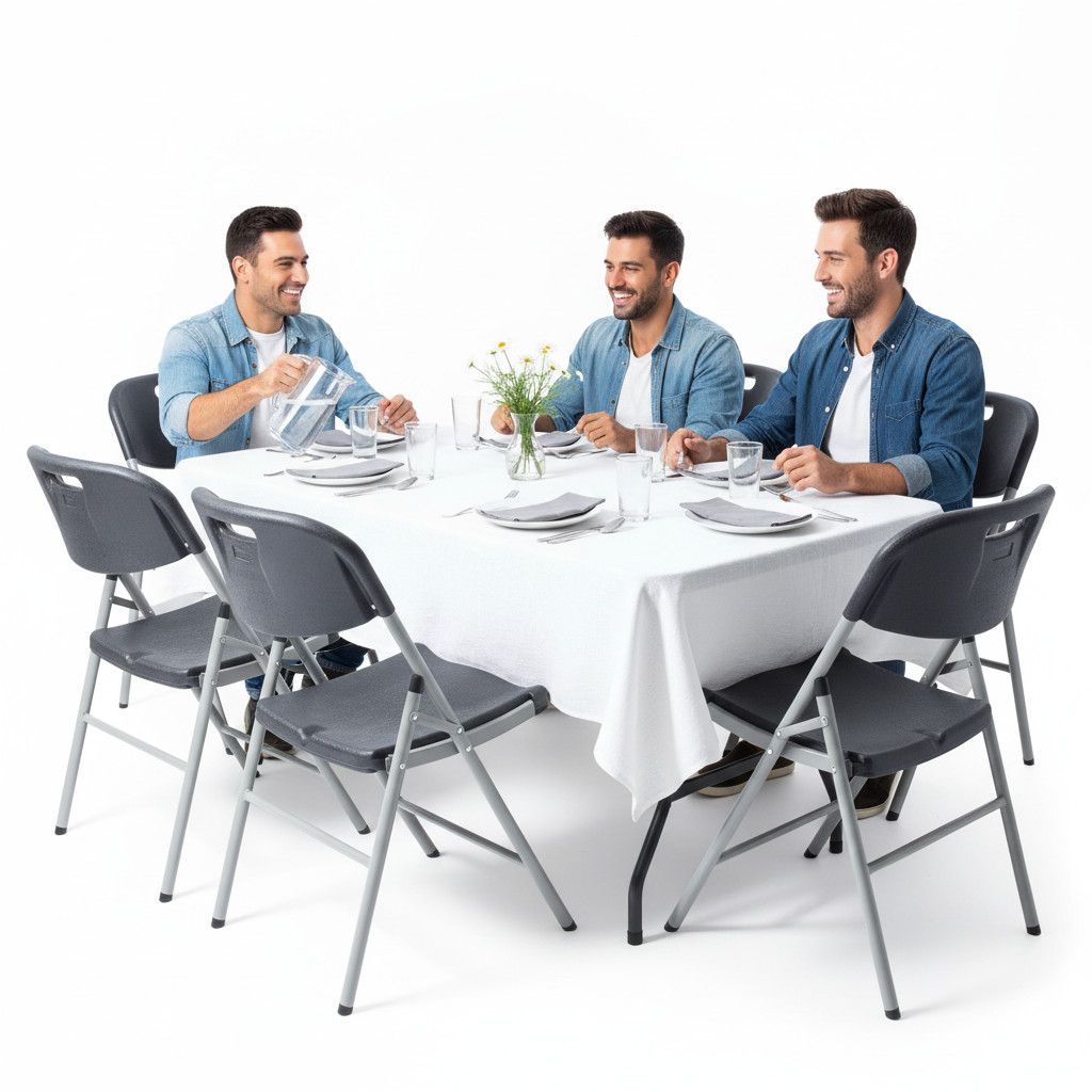 Produktinformationen Set – Tisch mit 6 Stühlen Das große 7-teilige Tischgruppen Set ist die perfekte Wahl für Geburtstage, Partys, Grillabende oder auch zum Mitnehmen für Ihr Camping Abenteuer. Sie erhalten das Set mit sechs hochwertigen und leichten Stühlen mit hohem Sitzkomfort. Der Buffettisch bi