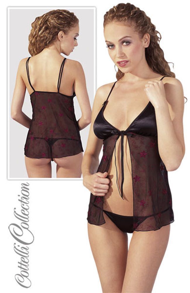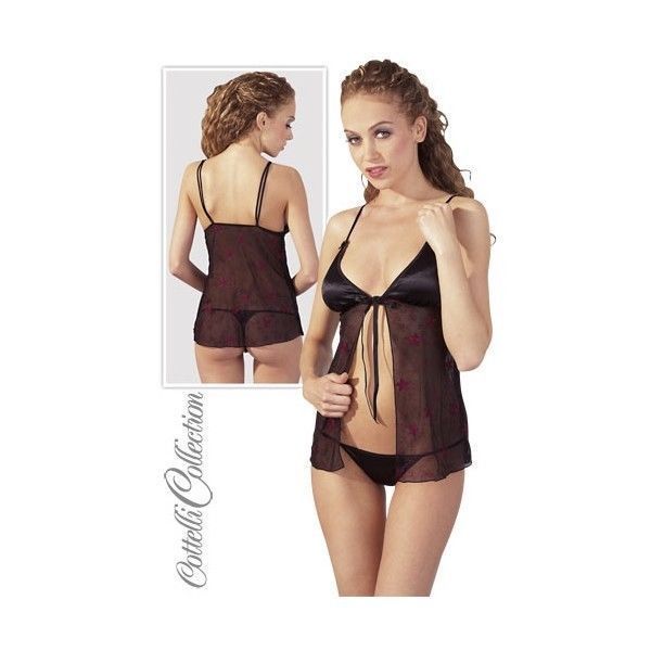 Verführerisch frontoffenes Babydoll mit wunderschöner Blütenstickerei. Heiße Kombination aus glänzendem Satin und transparentem Tüll. Zwischen den Cups mit kleiner Clip-Schließe und Satinschleife zum Binden. Der dazu passende String ist aus Satin. Farbe: Schwarz/Bordeaux. Material: 80% Polyamid, 10% Polyester, 10% Elasthan. Größen: S, M, L, XL, XXL.