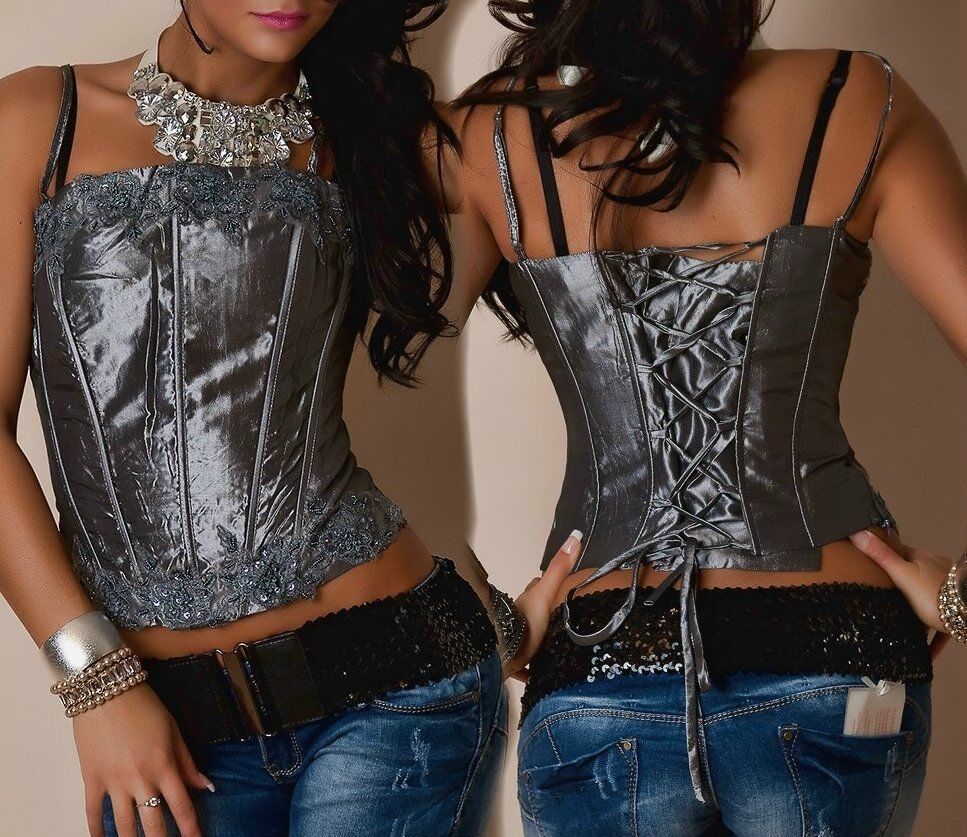 Sexy Corsage Top Stickerei Pailletten S 34 M 36 L 38 grau metallic Satin Glanz