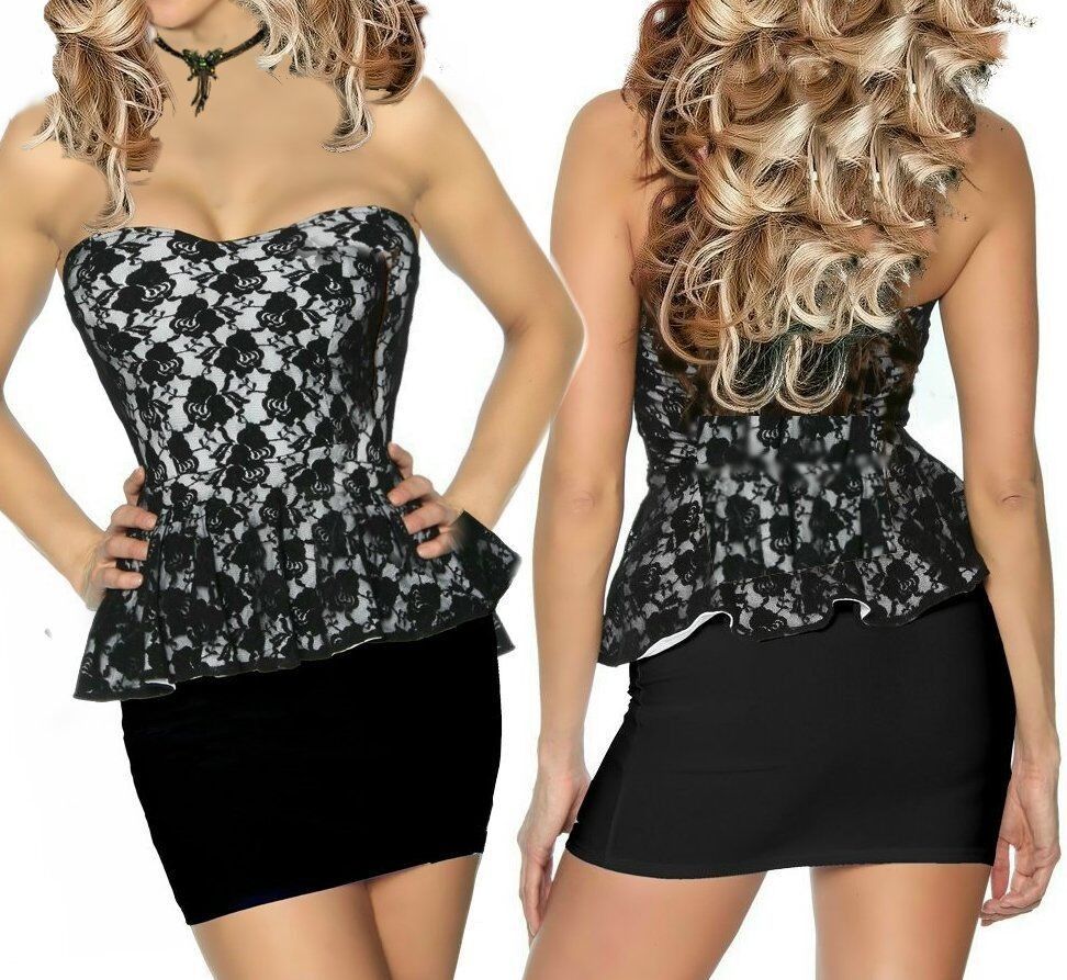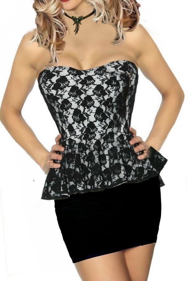 sexy auffälliges trägerloses Peplum Schößchen-Minikleid in geschwungener Bandeau-Form Romantisches Vintage-Kleid Edle Spitze in Rosenoptik doppellagig verarbeitet Schößchen schwingend figurbetont tailliert elastisches Material Eye Catcher Hot & Sexy In-Style Look _____________________________ Im