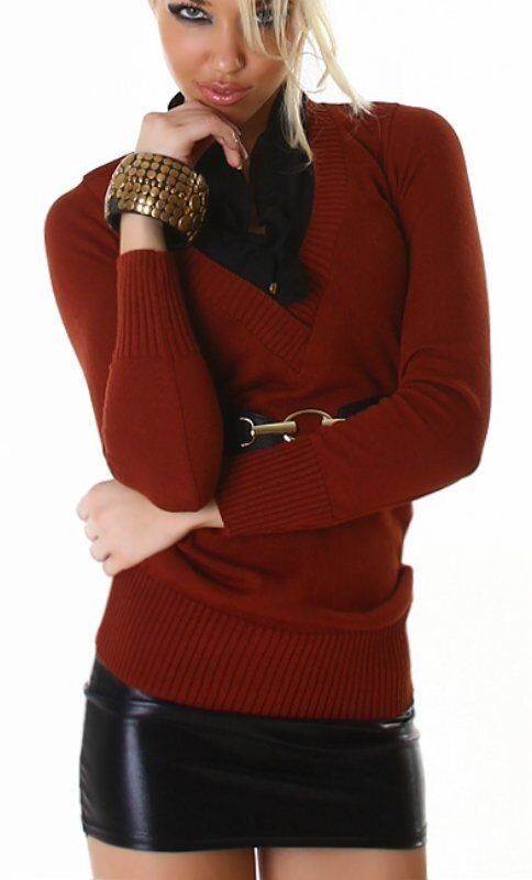 Sexy Langarm Pullover stylischer Lagen Look tiefe V Dekollete darunter angedeuteter Blusen Einsatz figurbetonte Form taillierter Schnitt + Gürtel elastisches Material Eye Catcher Hot & Sexy In-Style Look _____________________________ Im Artikel steht Französische Größe Maße in ungedehnten Zustan