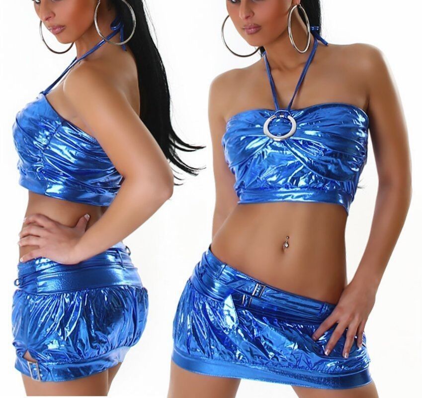 SeXy Damen Gogo metallic Lack Look Disco 2 Teiler Mini Rock Top XS S blau NEU