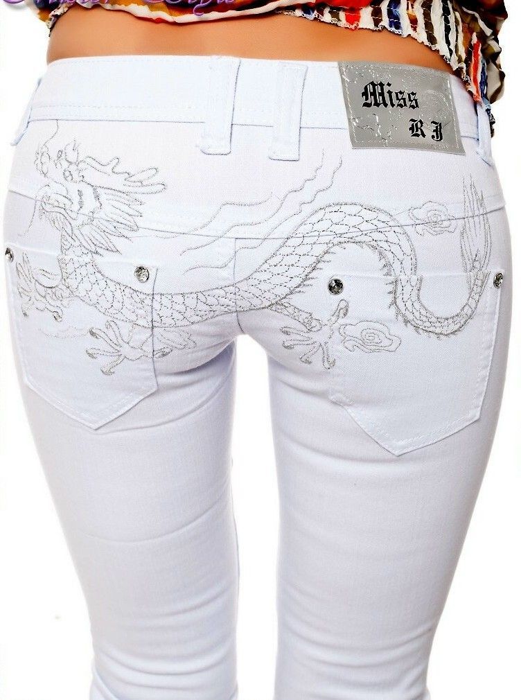 SeXy Damen Jeans Hüft Hose Low cut weiß Strass Stickerei Silber Drache 34 S T36