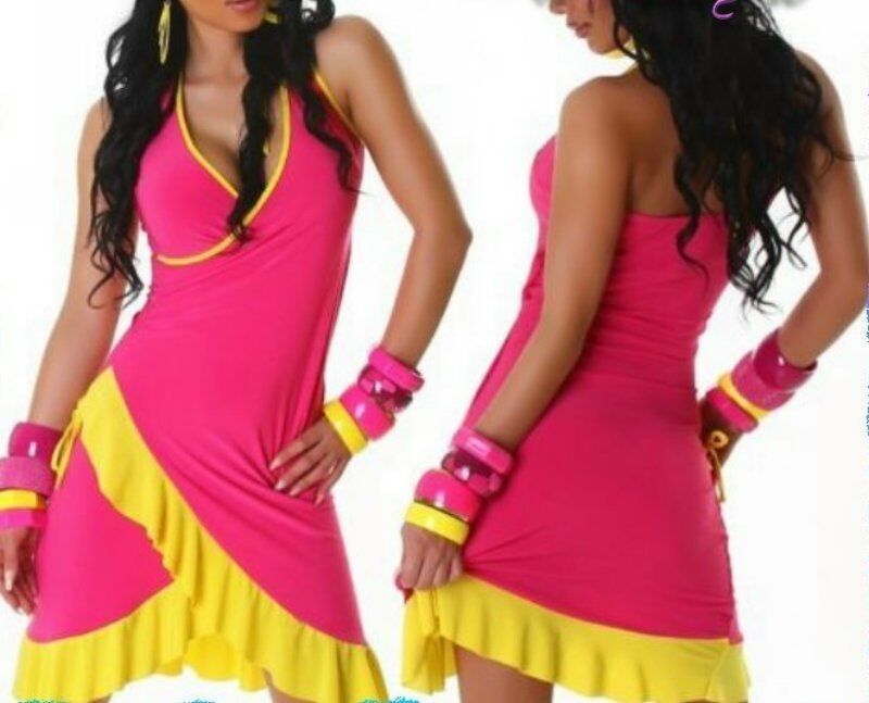Sexy Damen Latina MiniKleid Salsa Volant V Mini Kleid Dress 34/36/38 Pink Gelb