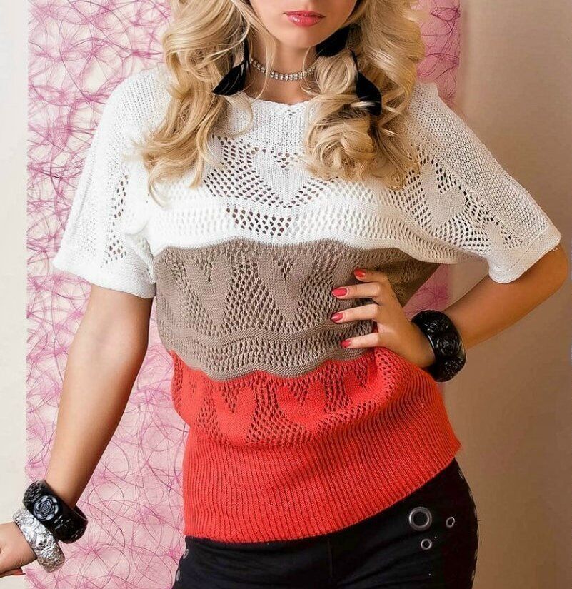 stylischer Strick-Mix Pulli Pullover Loch - Glatt Strick im 3 Farb Stufen Kombination vorne wellige Übergänge hinten gerade übergänge zum nächsten Farbblock elastisches Material Eye Catcher Hot & Sexy In-Style Look _____________________________ Einheitsgröße - Uni - Ohne Größe Maße in ungedehnte