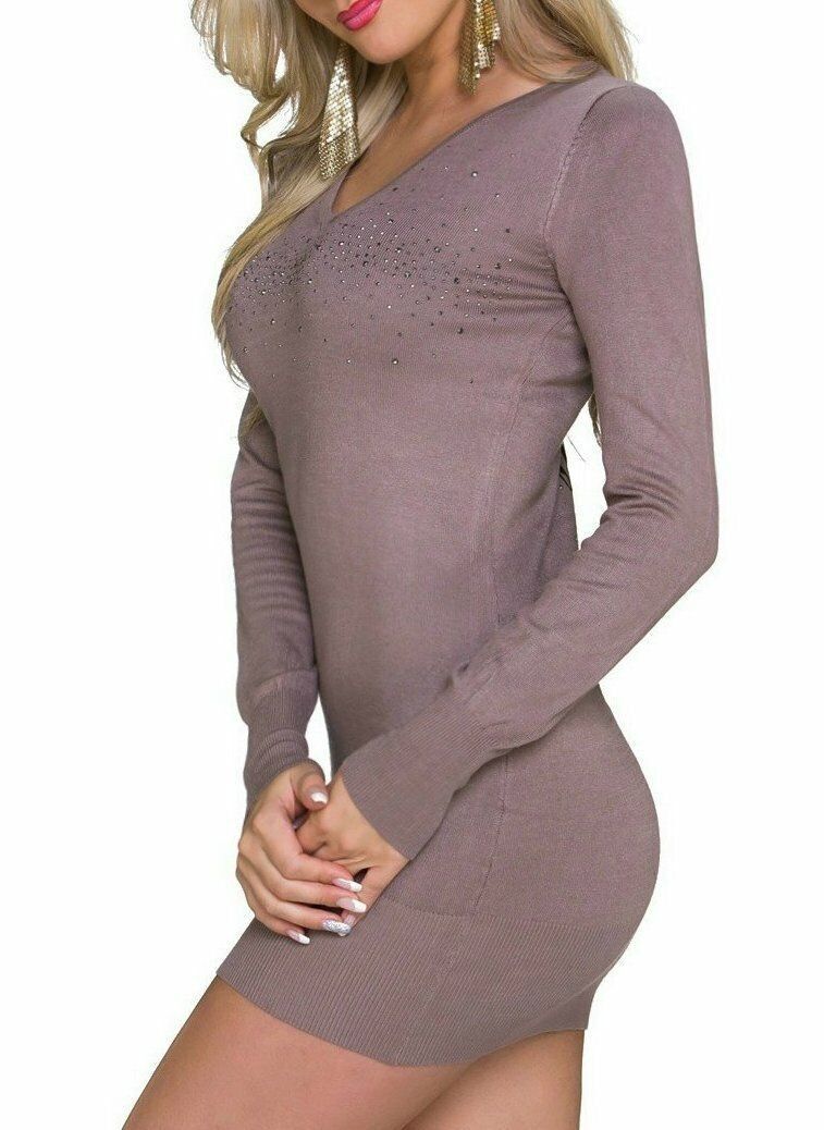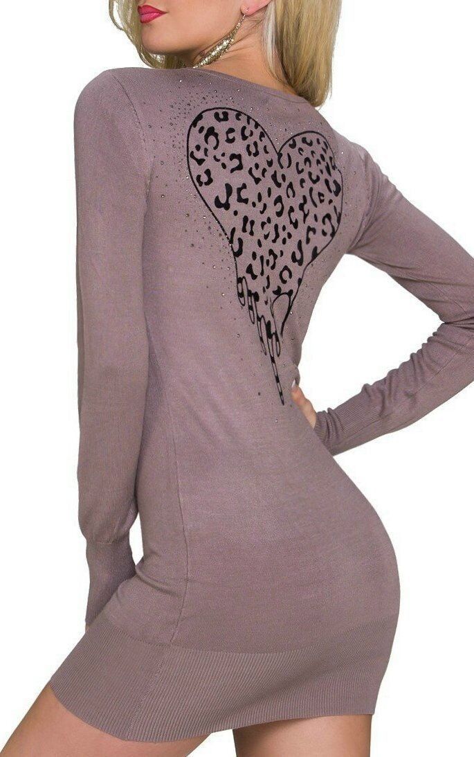 Sexy Damen Long Pulli Strick Mini Kleid Strass Leo Herz Rücken 34/36/38 braun
