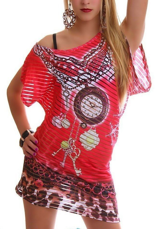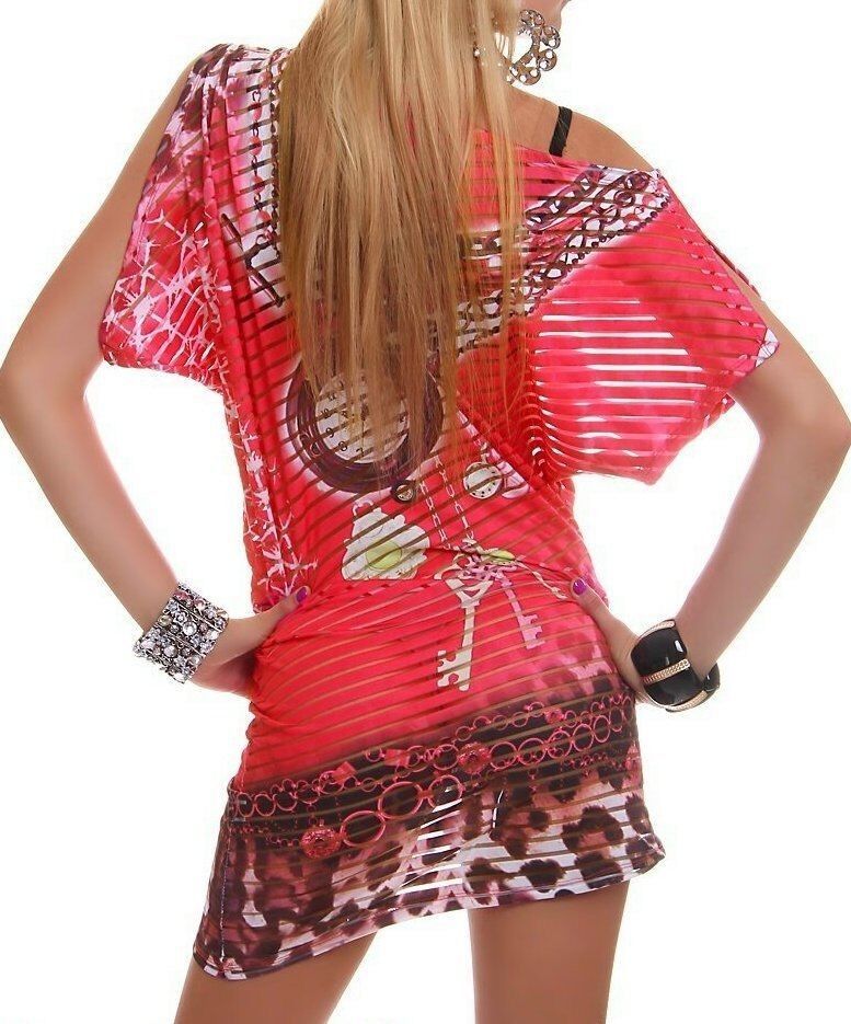 Sexy Damen Strass Long Shirt asymmetrisch transparent Streifen 34/36/38 Coral