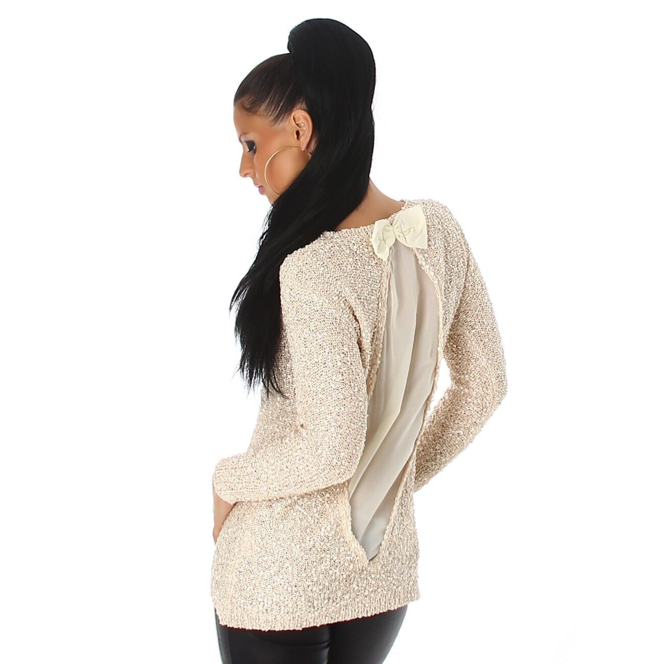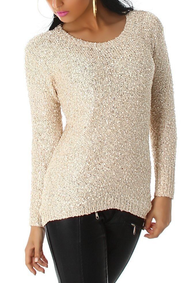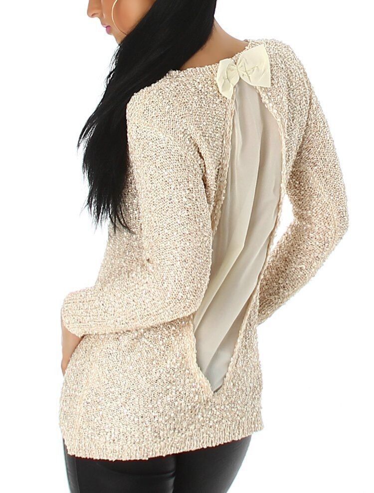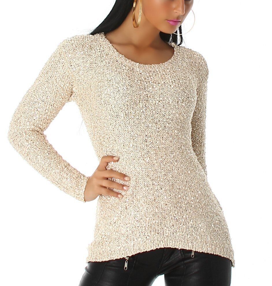 SEXY Damen Strick Pulli Glitzer Pailletten Pullover Chiffon Top 34/36/38 beige