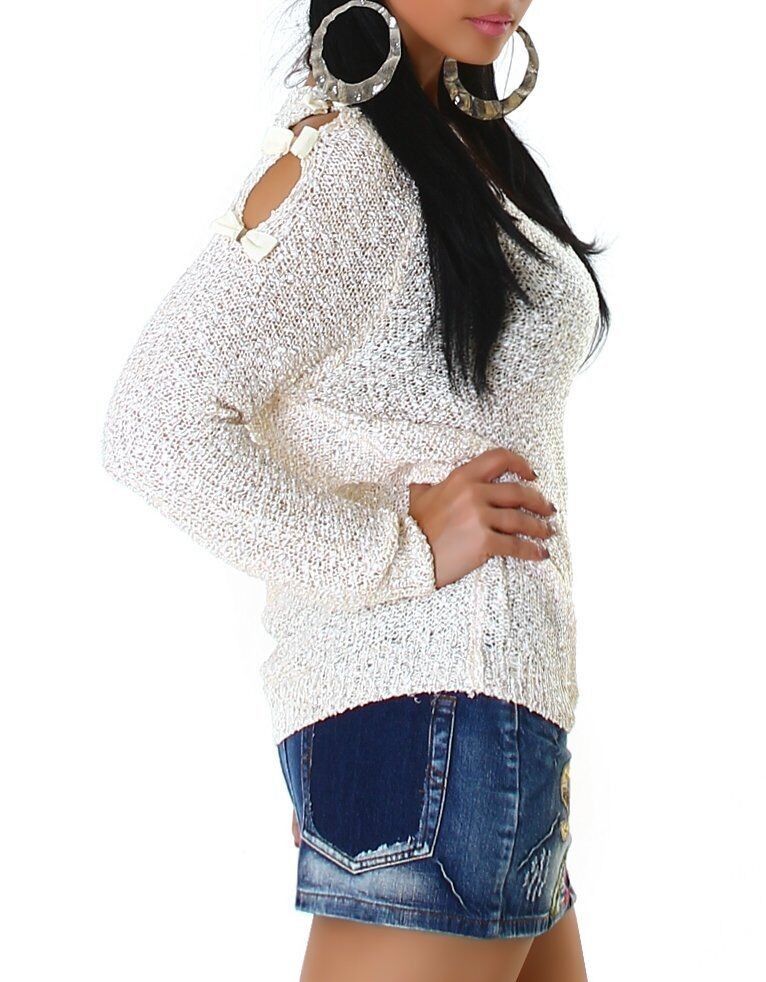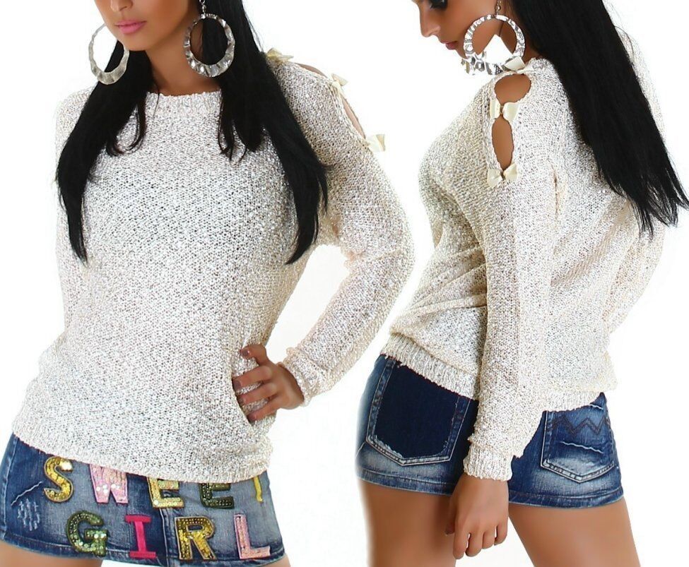SEXY Damen Strick Pulli Glitzer Pailletten Pullover Schleifen 34/36/38 beige Neu