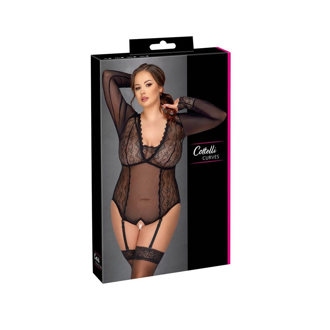 Sexy Langarm-Body XL - 4XL Schritt offen mit Strapsen transparent Dessous "Femie